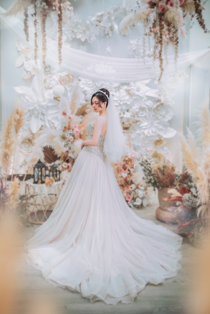 挑選拍攝婚紗照的禮服時,禮秘們很用心地幫忙推薦了適合我身型的禮服,以她們的專業幫我挑選了最適合、可以修飾我身材的缺點且為我加分的禮服!