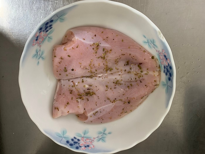 煎雞胸肉之前,雞肉要先泡在鹽水30分鐘,這樣才會鮮嫩多汁