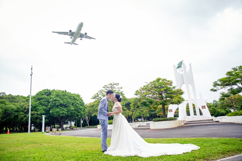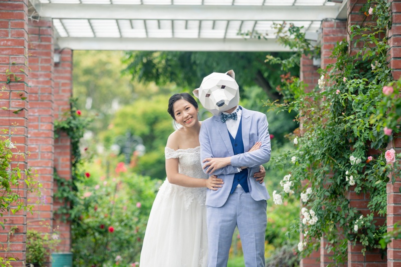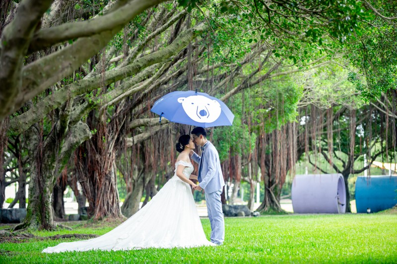 我們化好妝並穿上白紗跟西裝後,先坐車到新生公園,趁雨變小就開始拍,雨大了就趕緊找遮蔽物躲起來 XD
