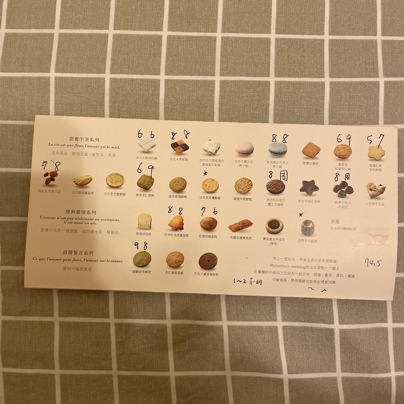 跟老公的評比方式也很直接不避嫌,我們會直接在目錄上寫上對每一塊餅乾的分數,平均分數最高的就贏了!(因為沒有辦婚禮,所以價格對我們來說一直都不是參考的依據)