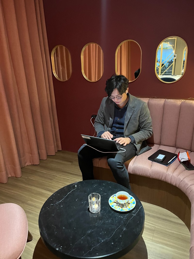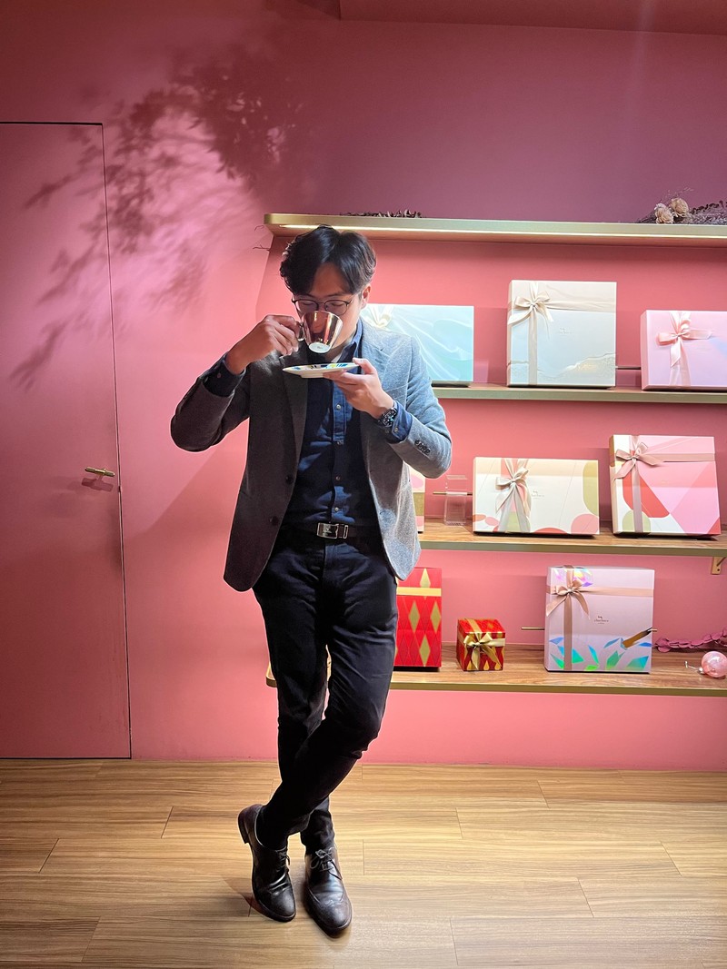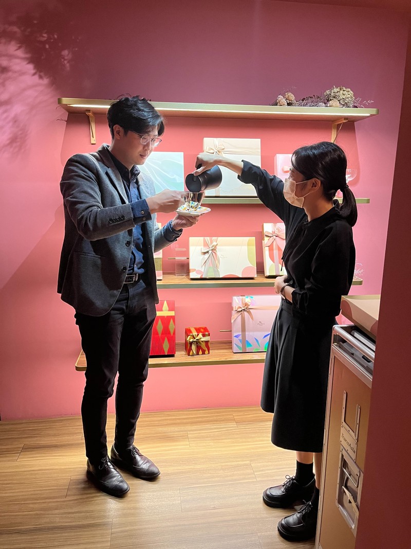 緊接著到了試吃那一天,我們的接待人員是宜瑄,在一開始會詢問要喝黑咖啡還是茶,如果選擇咖啡的話,會拿出一整盒的膠囊咖啡讓你選擇要輕、中烘培還是重烘培口味,這個待遇是要來喝下午茶的吧🌹,因為禮盒中也可以選擇放入茶包取代部分餅乾,所以喝完咖啡之後,宜瑄還讓我們試喝禮盒中的茶包口味,一看到杯子空了就一直幫我們添滿🥺,因為服務實在太客氣忍不住在旁邊偷拍這一切。