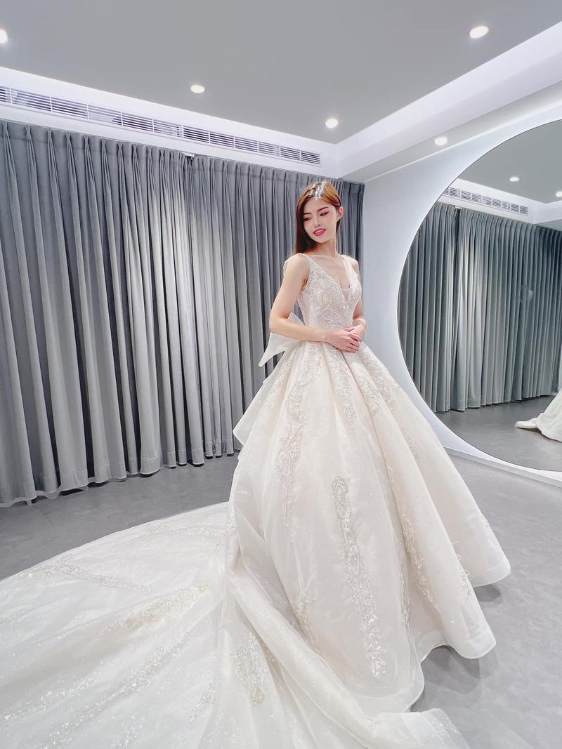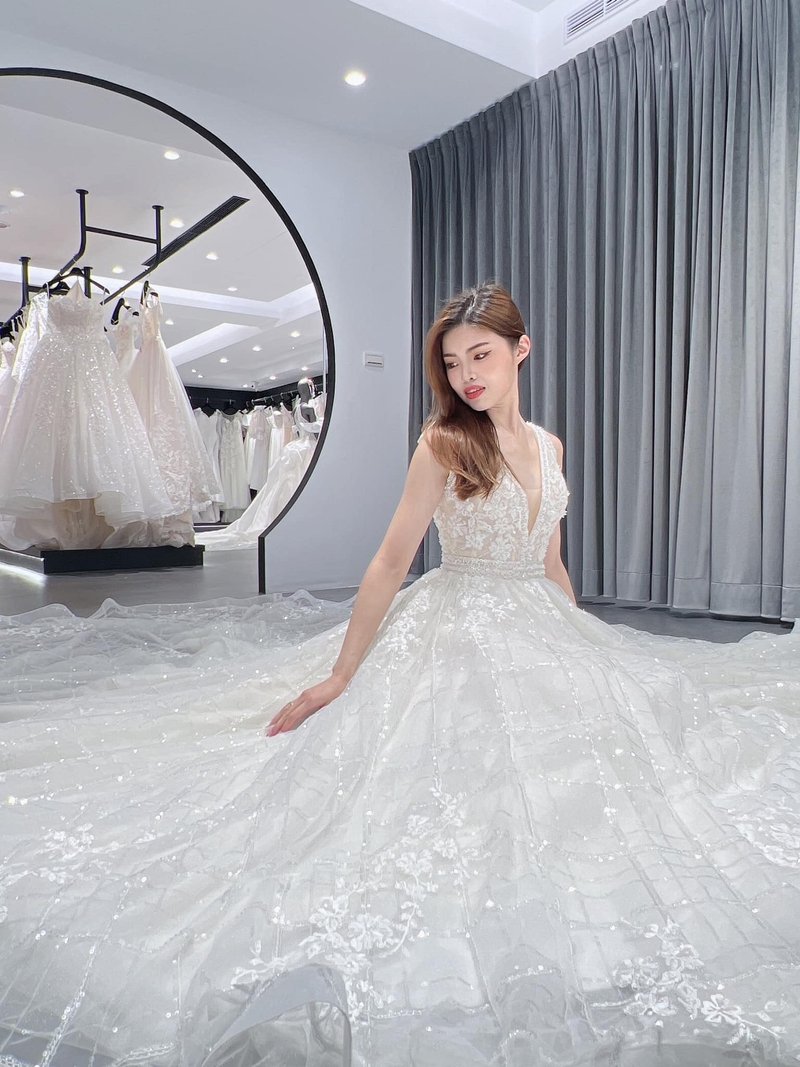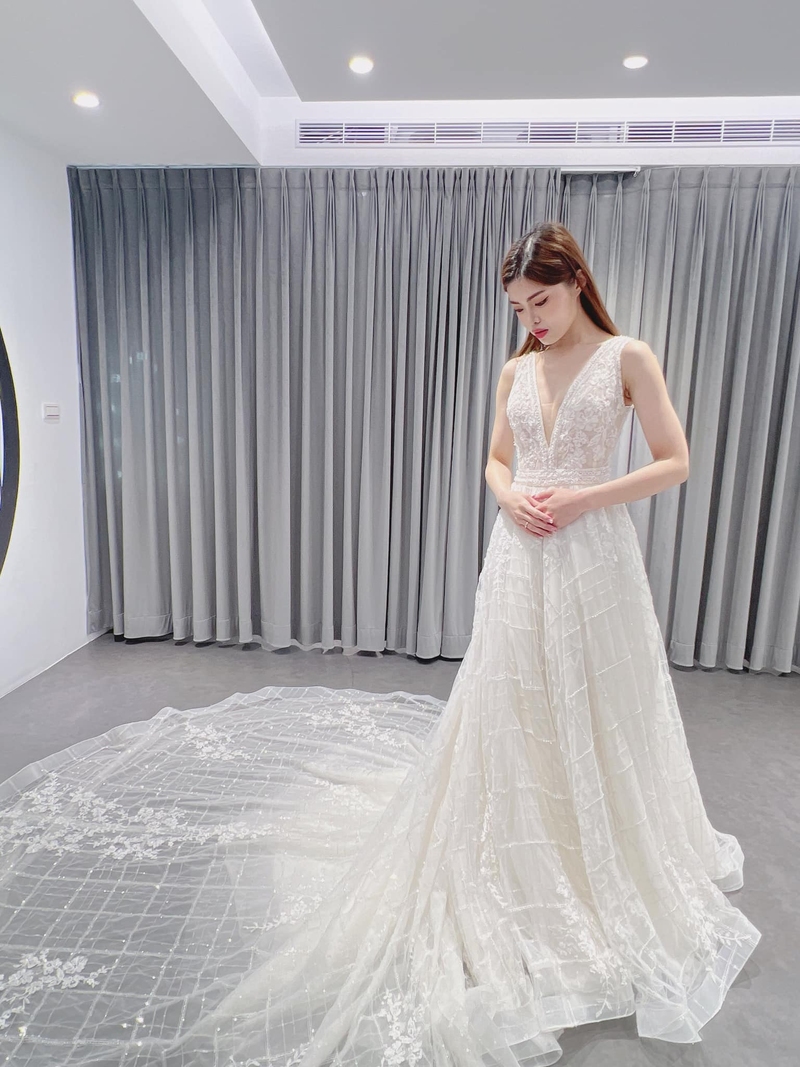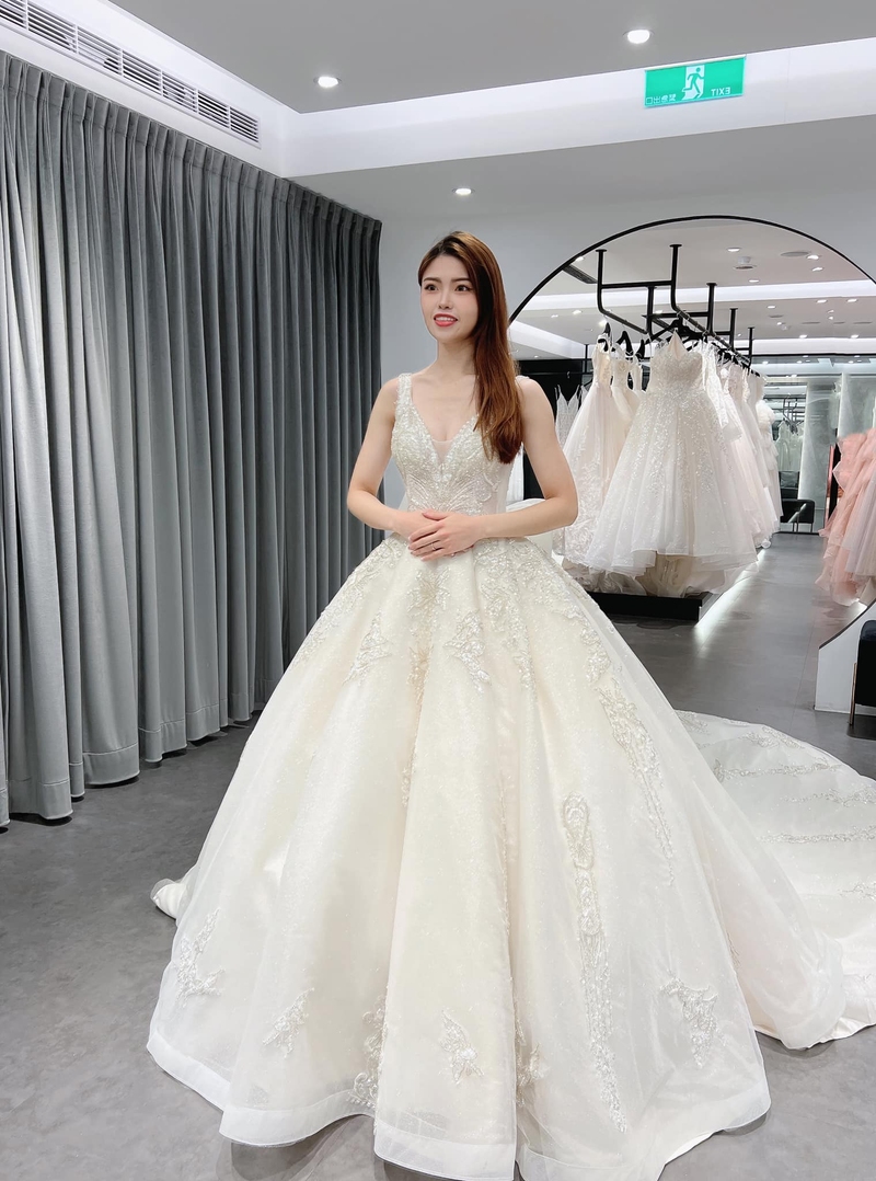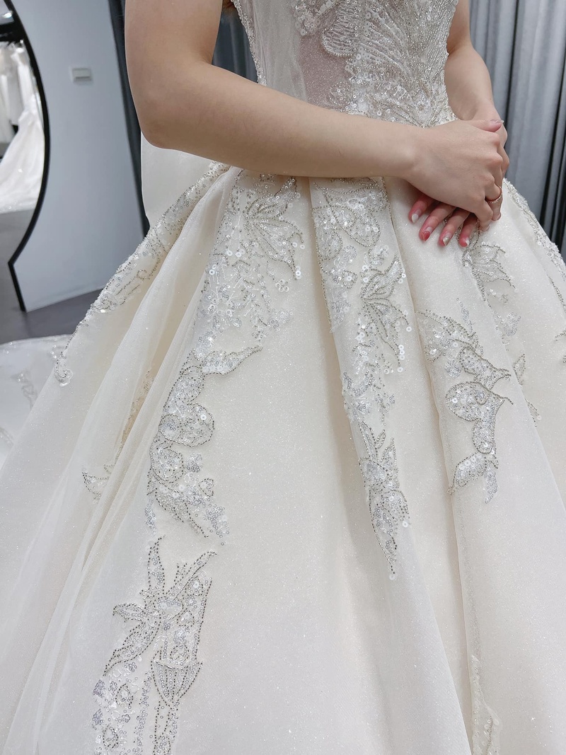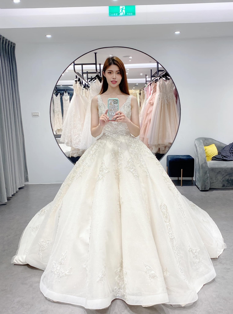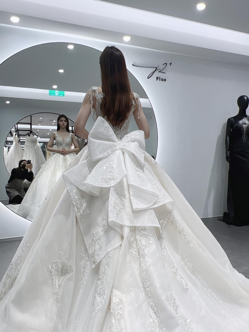 上半身有著透明亮麗雕花感,背後則是現在流行的大蝴蝶結,提升整件禮服華麗感又不失可愛風