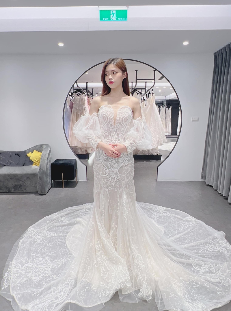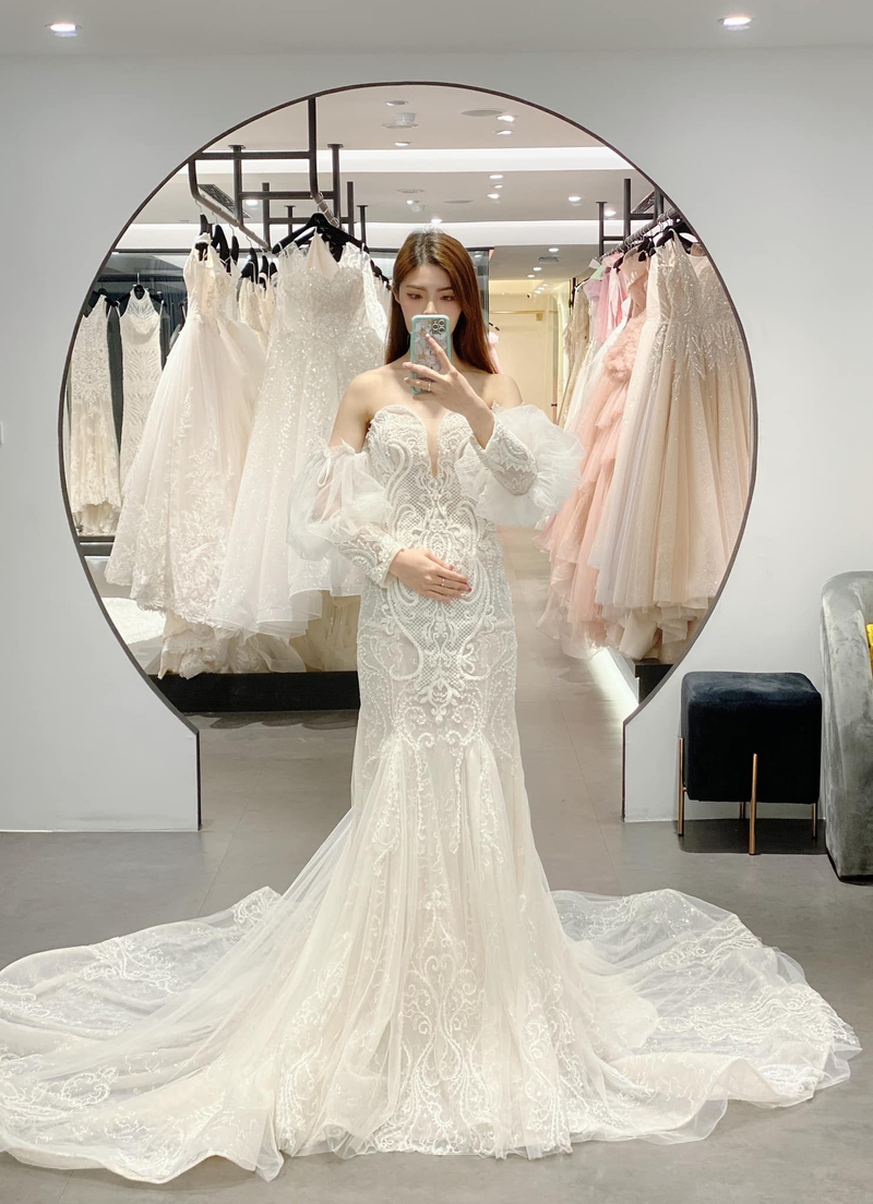 這件特別的就是澎紗袖了很修飾手臂及身型,禮服前面的花紋路很別緻有種大方俐落感