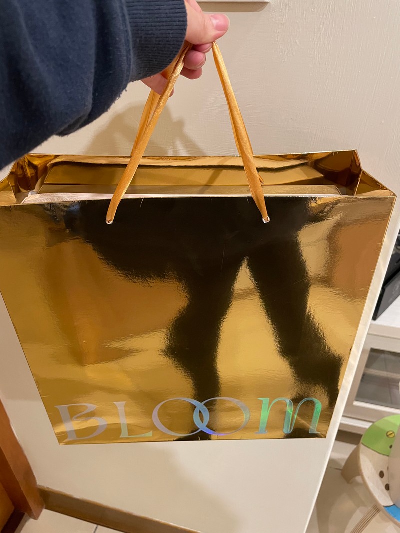 店家禮盒放入提袋的樣子,提袋是亮到不行的金色提袋,拿著走在路上會很顯眼😆
