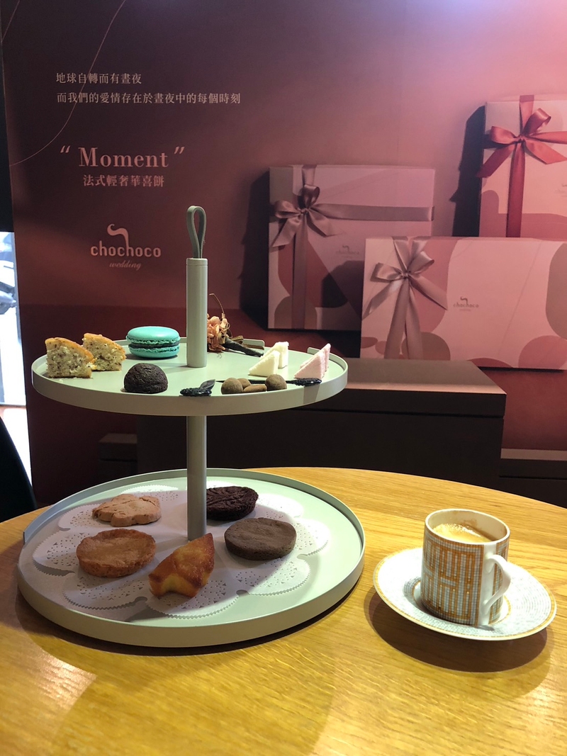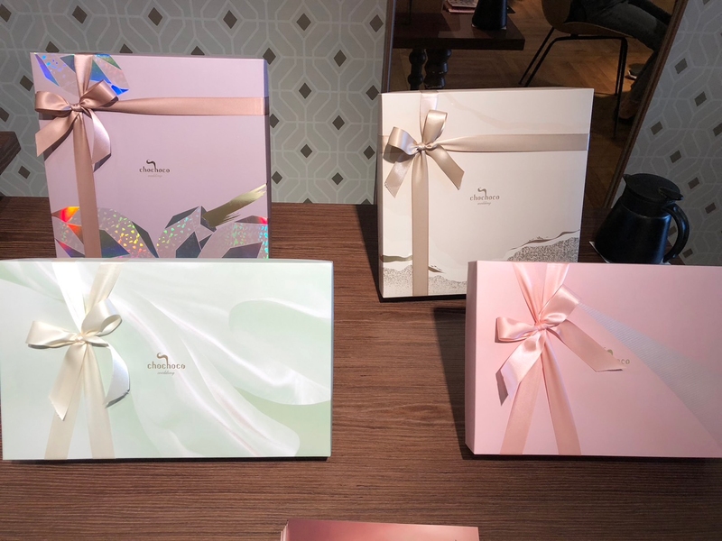 最先去看的是鑽戒,下訂完成後諮詢師拿著一疊喜餅介紹與試吃券給我們,合作廠商都是近期很熱門的店家,懶人如我就直接從中挑選,也剛好看到了很久以前就知道的chochoco。記得買過好多次巧克力跟馬卡龍送禮,但印象一直停留在它是巧克力專賣店。後來知道chochoco有喜餅是因為peeta,當時就想說之後如果要結婚一定要去試吃看看。