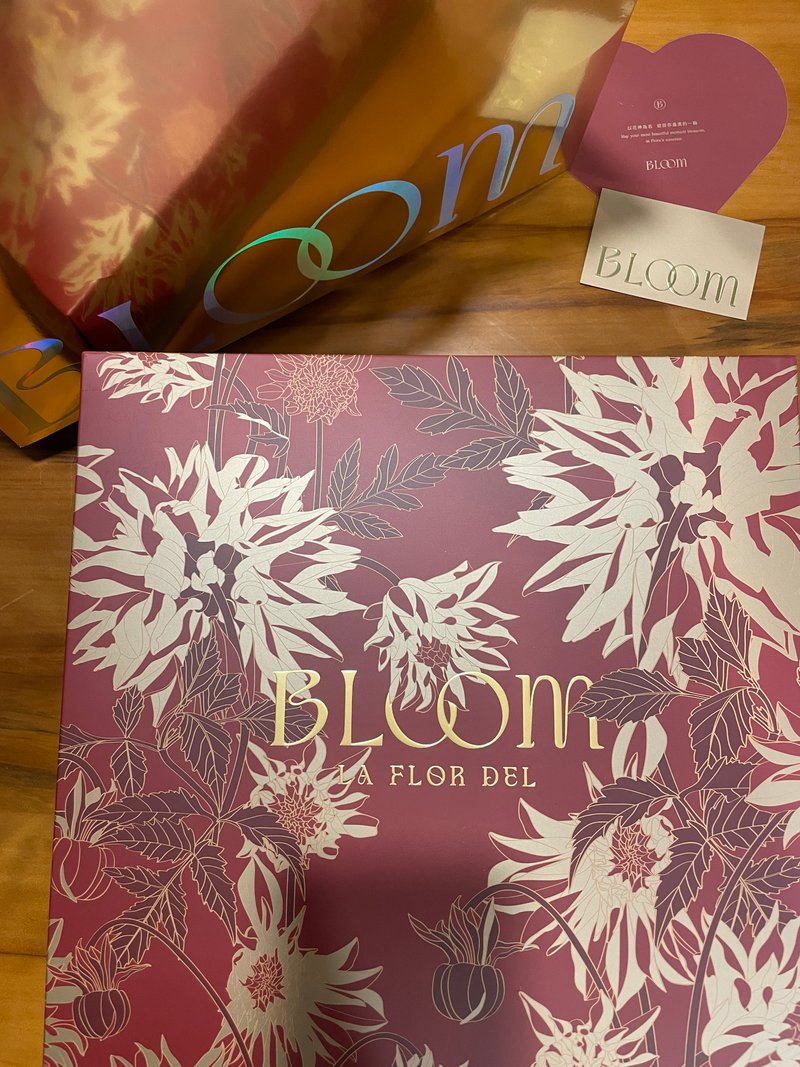 作為一個細節控的新娘,能讓賓客有好印象的喜餅一定要精心挑選,在臉書上看到了Bloom花神的廣告之後,立刻被漂亮大方的包裝吸引眼神而申請試吃,粉專回覆非常迅速,試吃盒面有五種可以選擇:時髦花綻/經典老花/湛紅寶石/浪漫之星/邱比特之羽,我最喜歡時髦花綻的盒面,毫無猶豫的選擇,匯款完成後很快就收到了。