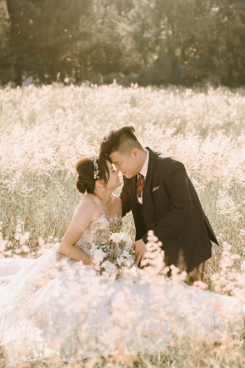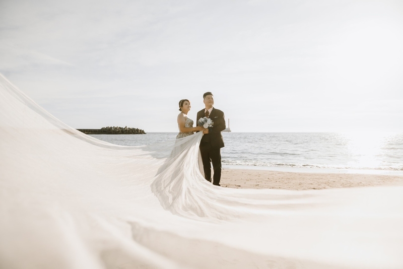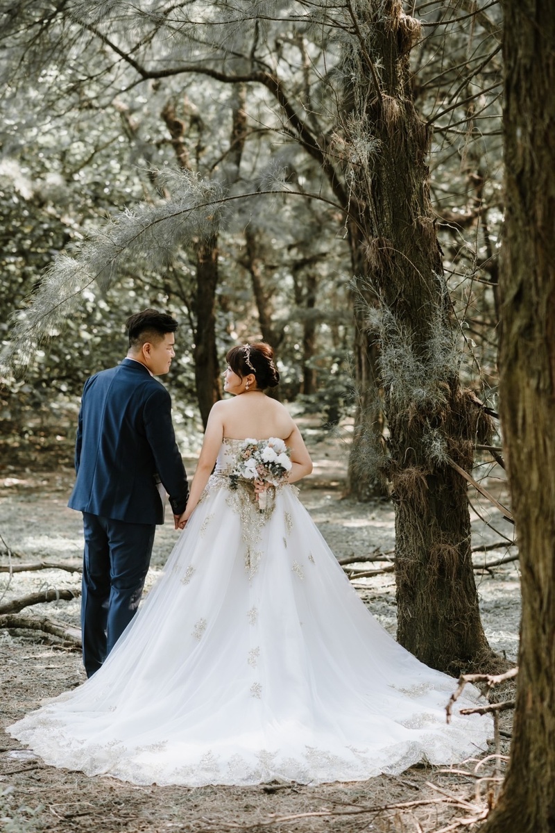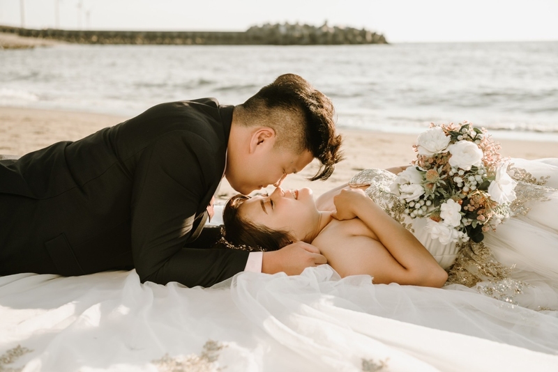 對於拍照雖然不是很懂,但希望照片看起來是帶有故事感而且跟攝影師小震在事前溝通提到了外景想拍夕陽,小震推薦了彰化海邊拍起來效果挺好的!拍照過程小震會適時的提醒新人肢體僵硬跟笑容,尤其那誇張的笑聲讓我們會心一笑拍到自然表情!