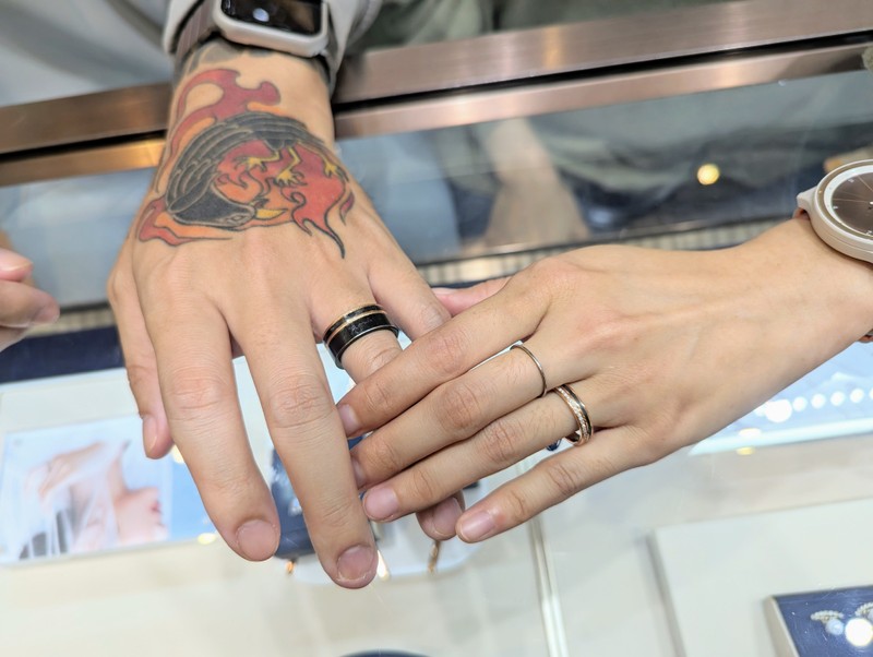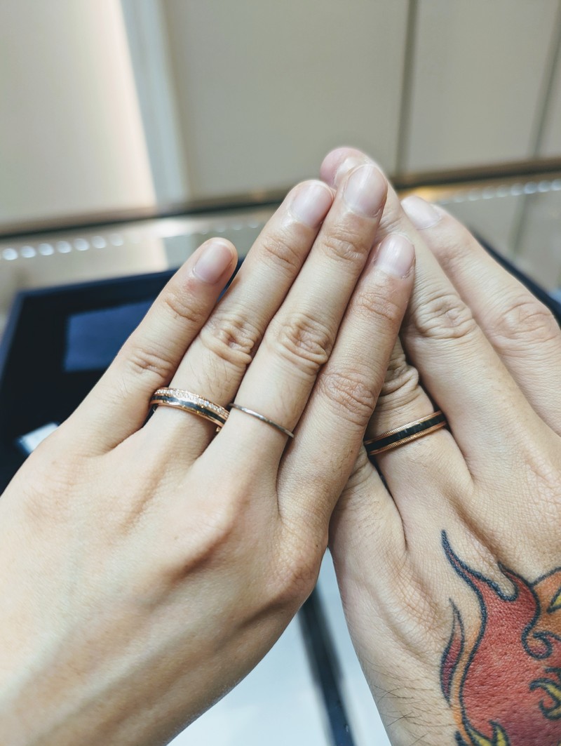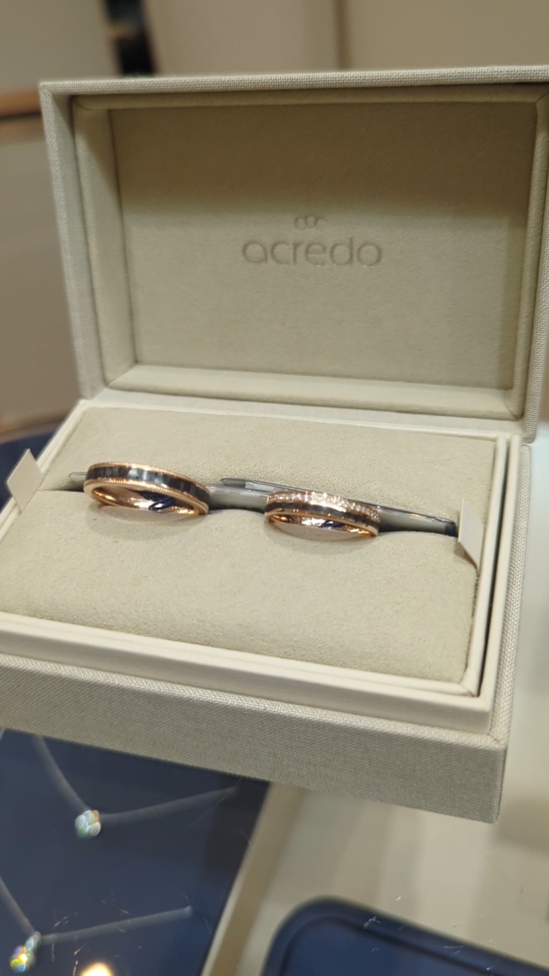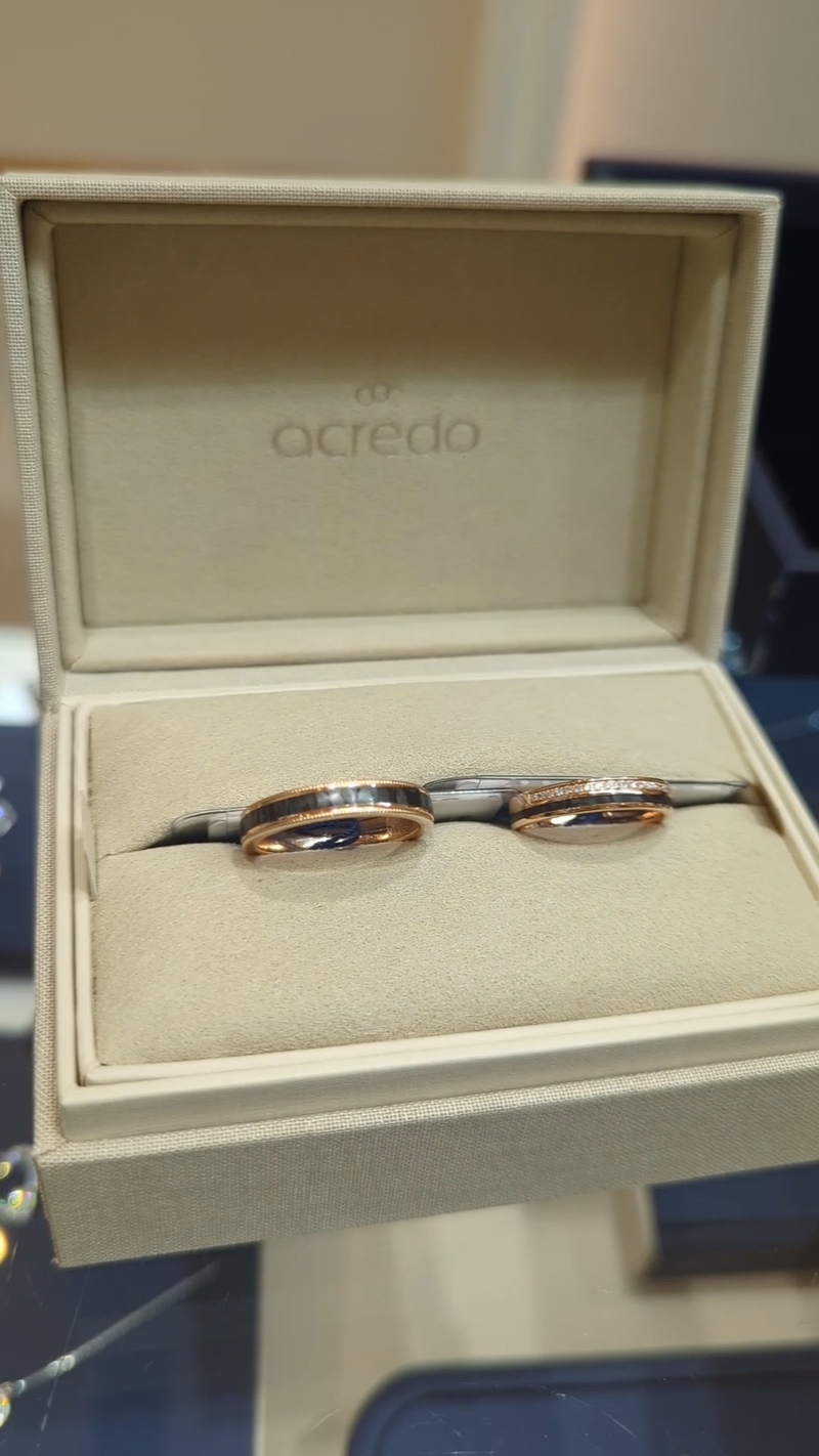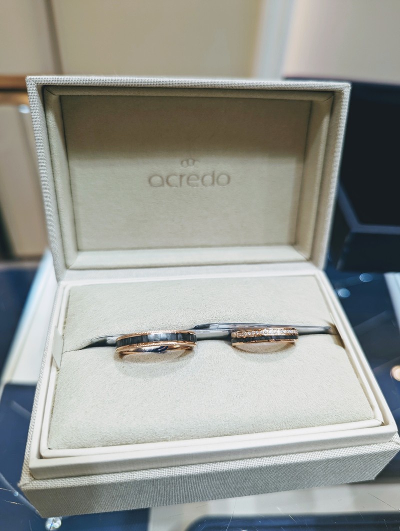 不想要太大眾或女戒太柔美的款式,在網路上已經看上了Acredo碳纖維系列。戒指本人比網路照片更精緻一點,黑色部分隨著角度會呈現一些些紋路,不是完全漆黑,蠻特別的。女戒選擇帶碎鑽看起來很亮很爽。