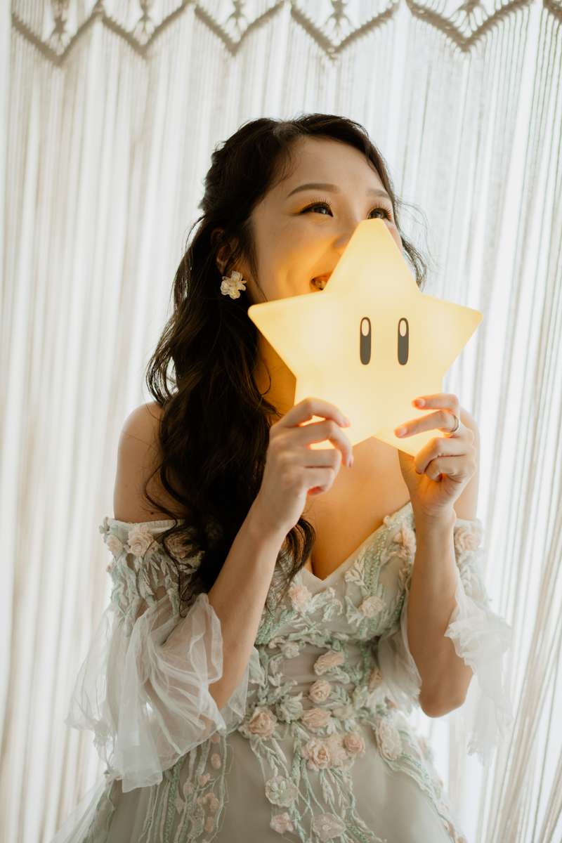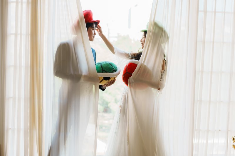 拍攝企劃書真的很重要,上面擺上想要的禮服款式、拍照地點、喜歡的妝髮、也可以放上想要的自備小道具(我們去日本環球失心瘋買的馬力歐帽子&周邊)。讓團隊能快速了解我們的需求。禮秘小鈺依照企畫書幫我挑了許多好看的禮服,也感謝她非常有耐心的幫我試穿,最後挑到了自己喜歡又適合拍婚紗的風格。