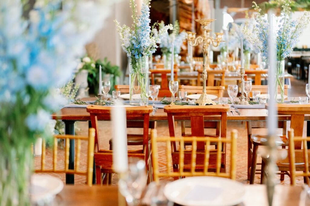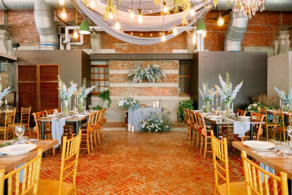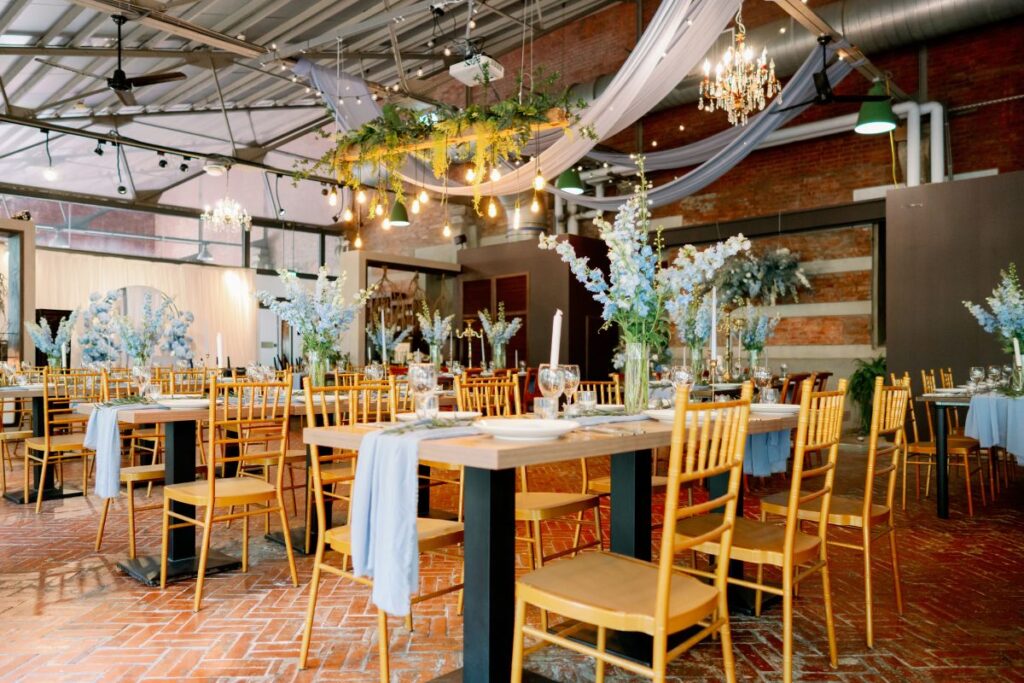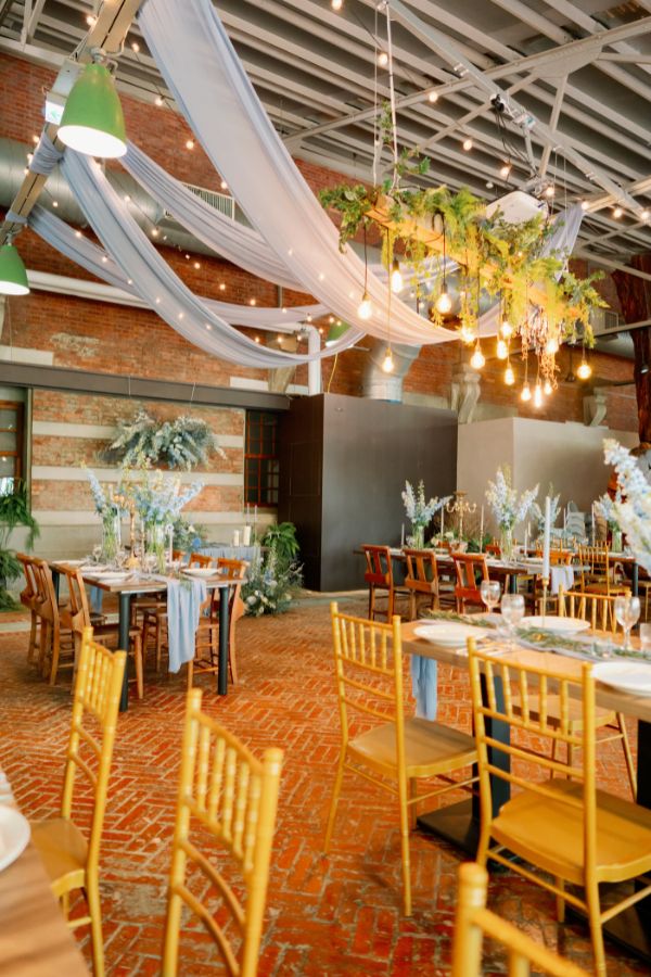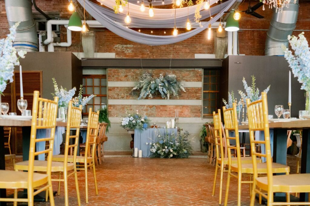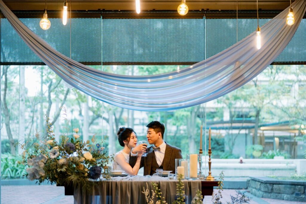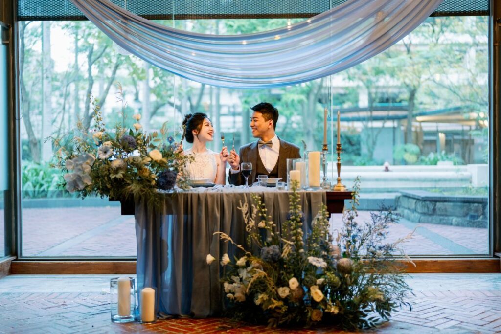 通透寬敞的宴客廳,以鮮嫩欲滴的鮮花、垂掛空中的絲帶與點點繁星的燈泡陳列布置,並配上金色竹節宴會椅與木色餐桌而擺設而成的宴客區。桌上更點綴上白色蠟燭、象徵帶來好運的藍色桌巾與餐盤,呈現精緻而愜意的氛圍,整體兼具浪漫與質感的和洋風情。