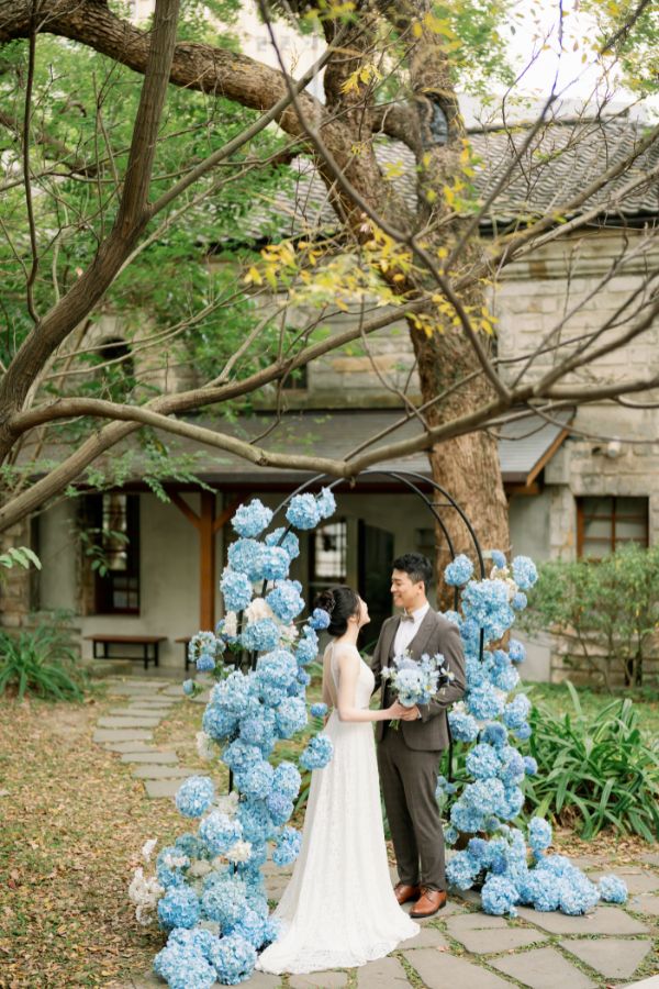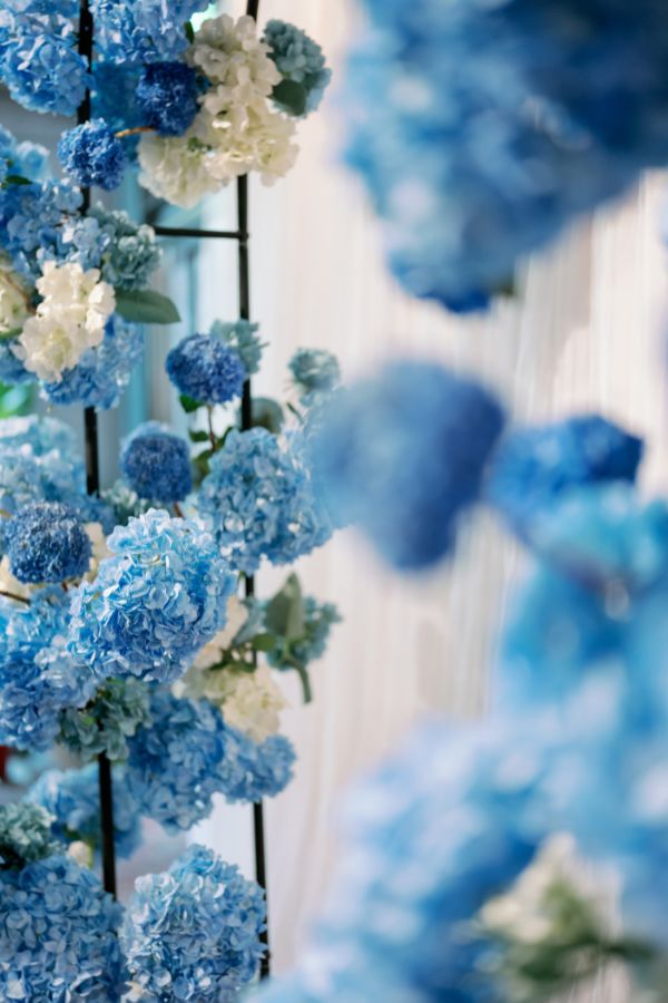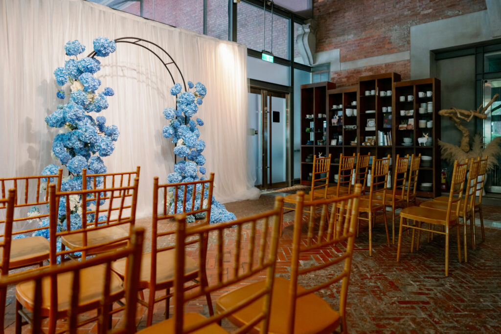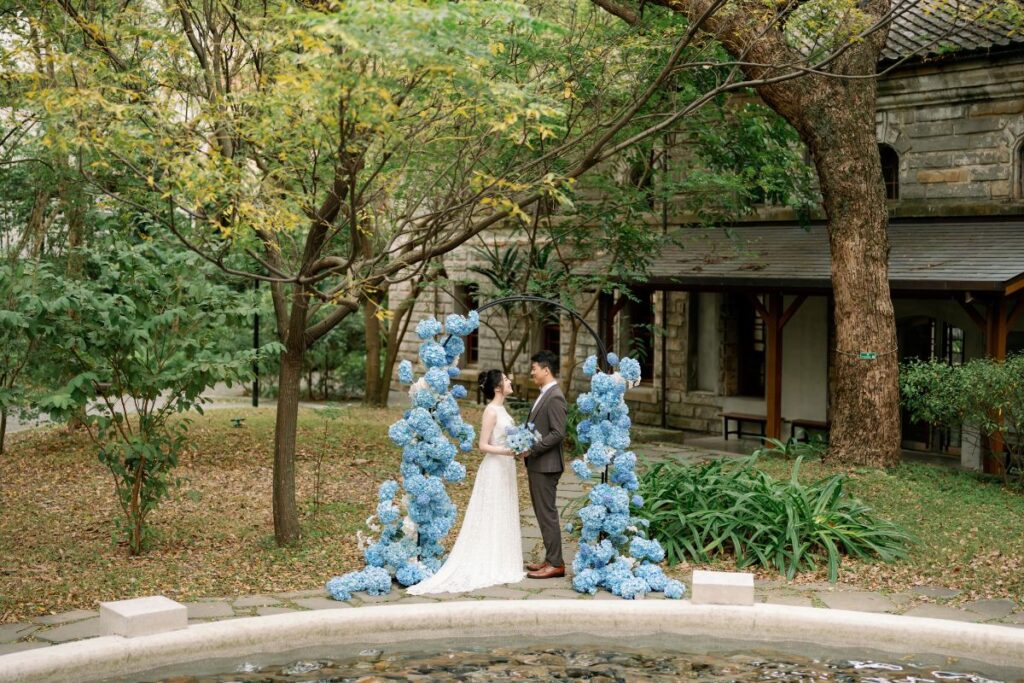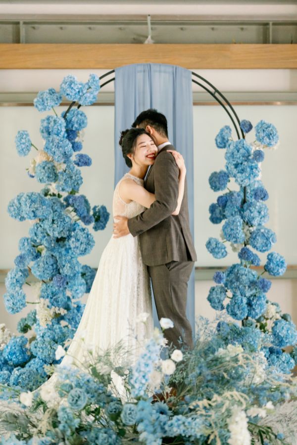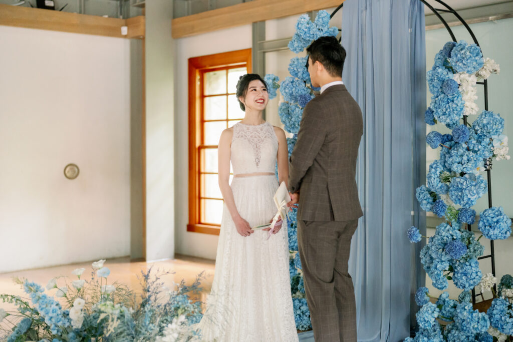 在老宅中的書房大廳中以白布為背景,將象徵浪漫與美滿的藍色紫陽花作為證婚拱門設計,從地盤延伸而自頂端,彷彿在祝福這段關係也能綿延不絕持續。