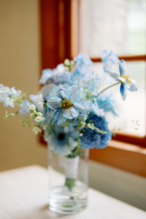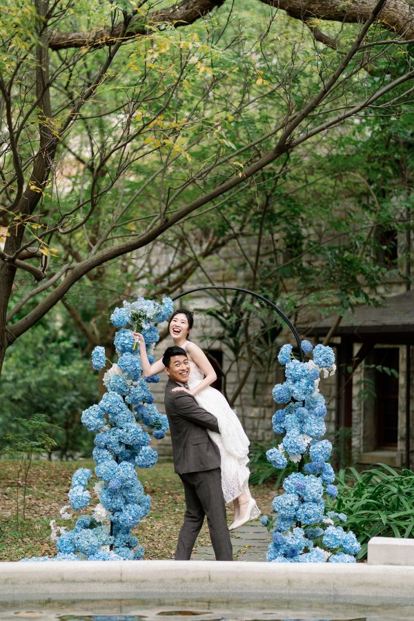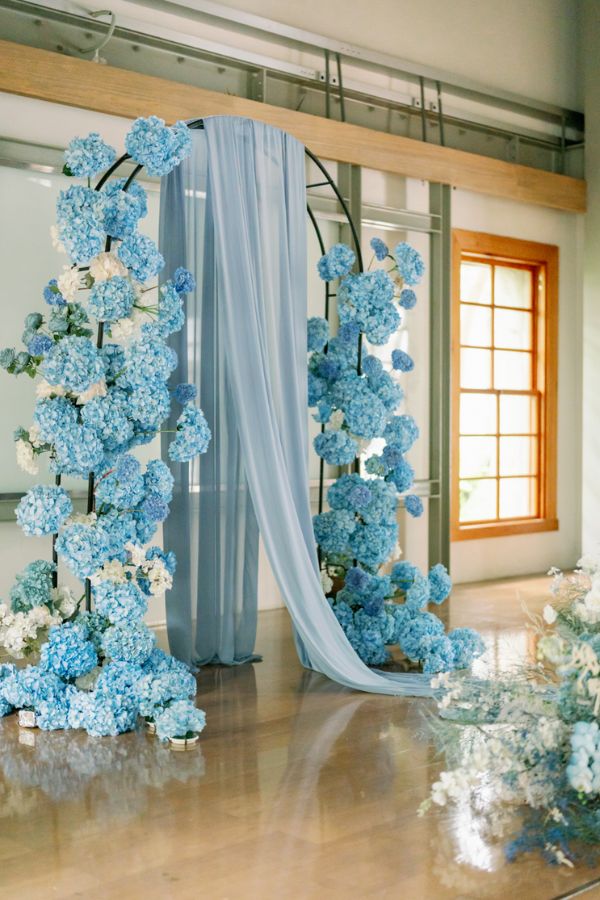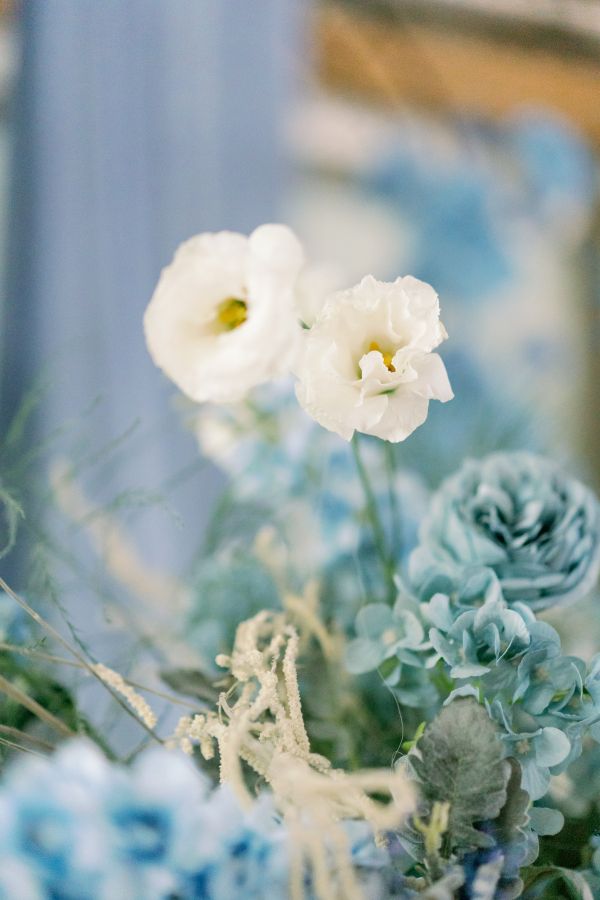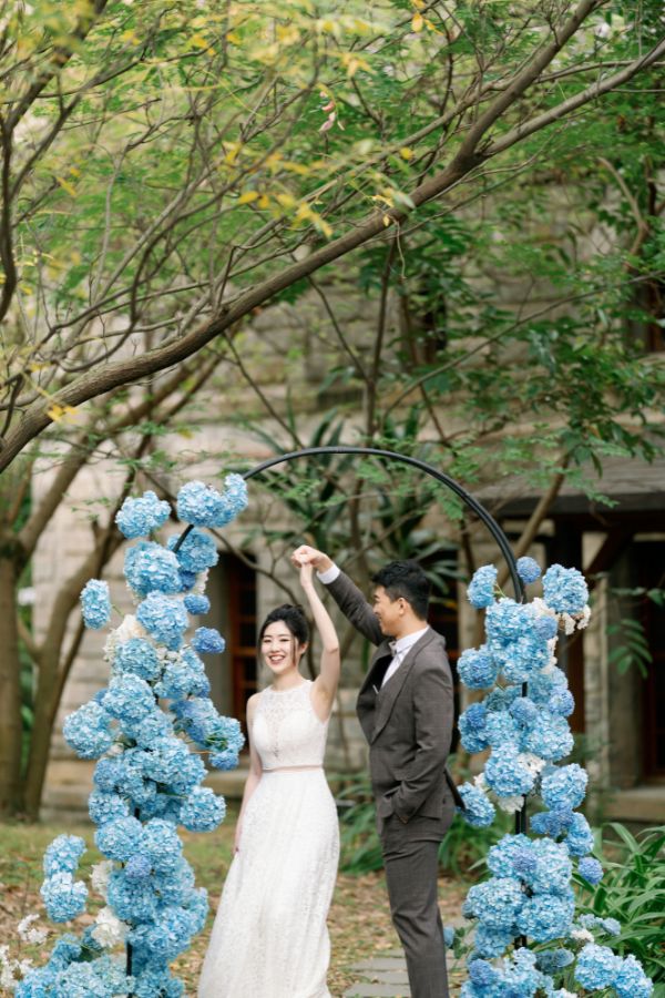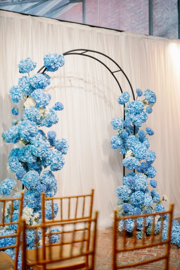 在老宅中的書房大廳中以白布為背景,將象徵浪漫與美滿的藍色紫陽花作為證婚拱門設計,從地盤延伸而自頂端,彷彿在祝福這段關係也能綿延不絕持續。