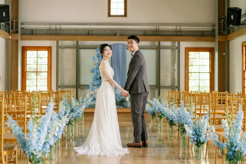 另一個證婚區則是以日式建築的川堂作為設計,米白色系牆壁配上一扇扇明亮的窗檯,證婚拱門以藍色紫陽花作為花藝設計外,更也加入象徵「祝福」的白色木棉花作為搭配,期許婚姻是段受到祝福而美滿的感情。
