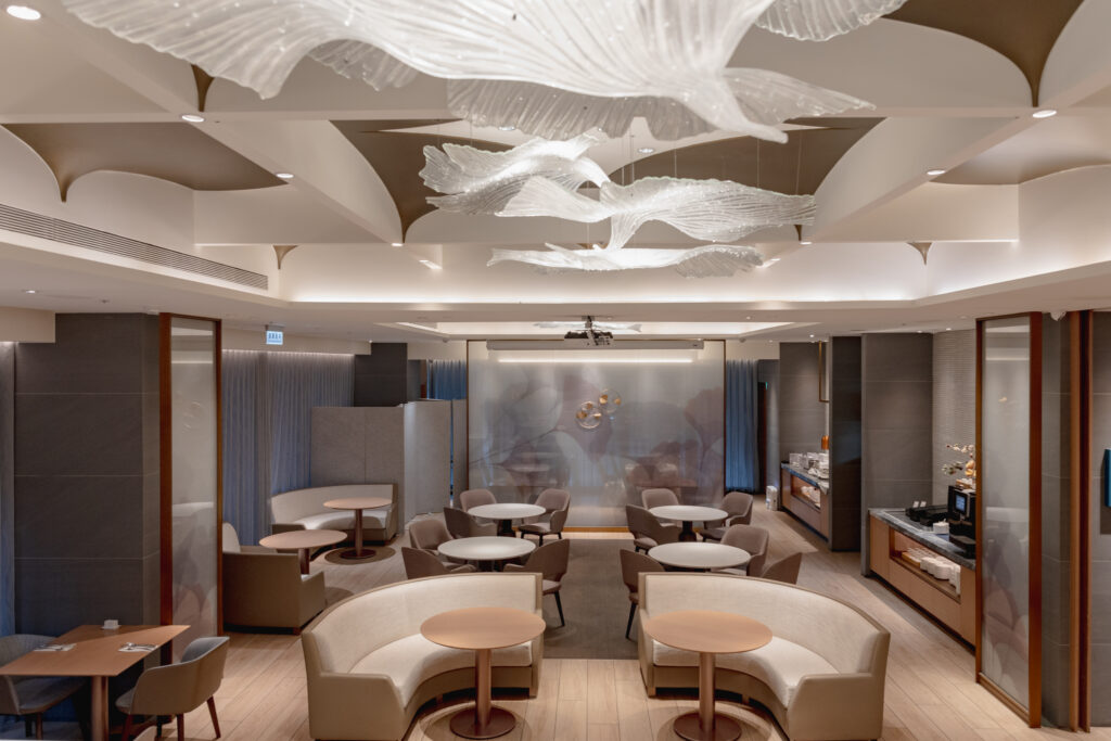 九昱希爾頓逸林酒店 Alley 麗餐廳 為長條式無樑柱的開闊空間,以銀杏為妝點空間設計的主角,風格典雅搭配屏風裝飾,特別是天花板的部分也以銀杏的為意念,訂製銀杏的水晶玻璃燈為波浪的柔美線條,加上圓形與半圓形的桌椅來呼應紛飛的景緻,和洋式的餐廳風格相當有質感。