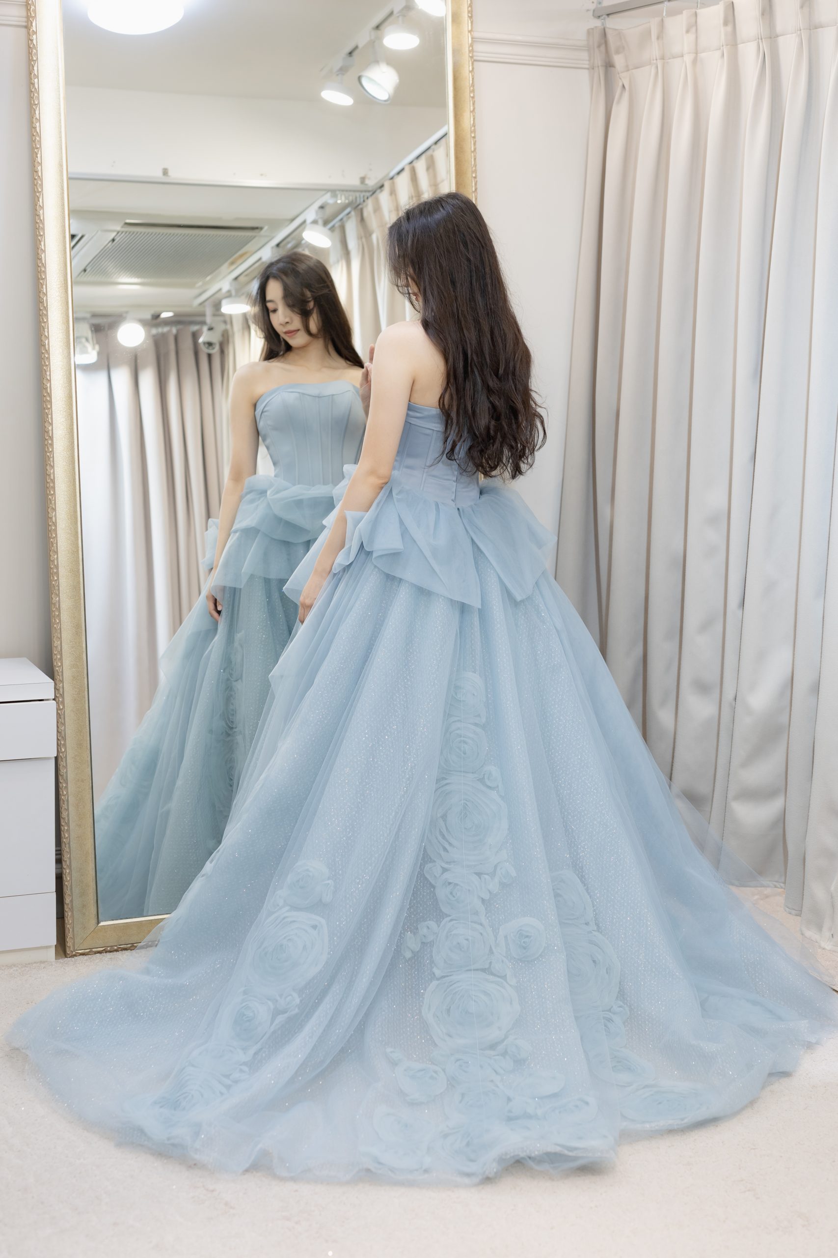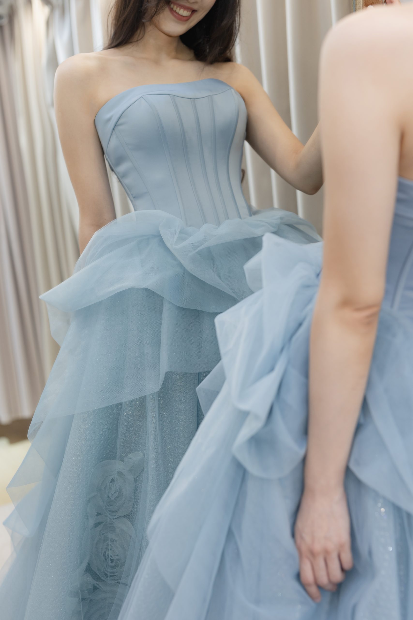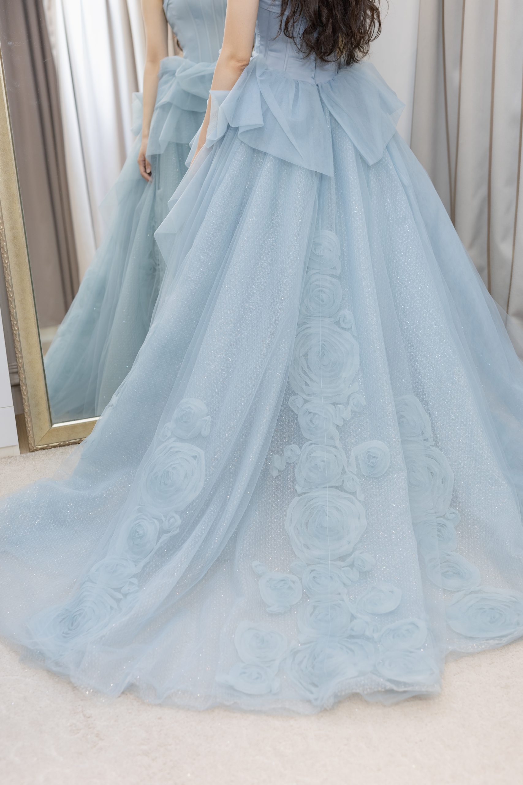 裙襬的設計則以藏在層次之中,由小到大綻開的藍玫瑰的形狀呈現,