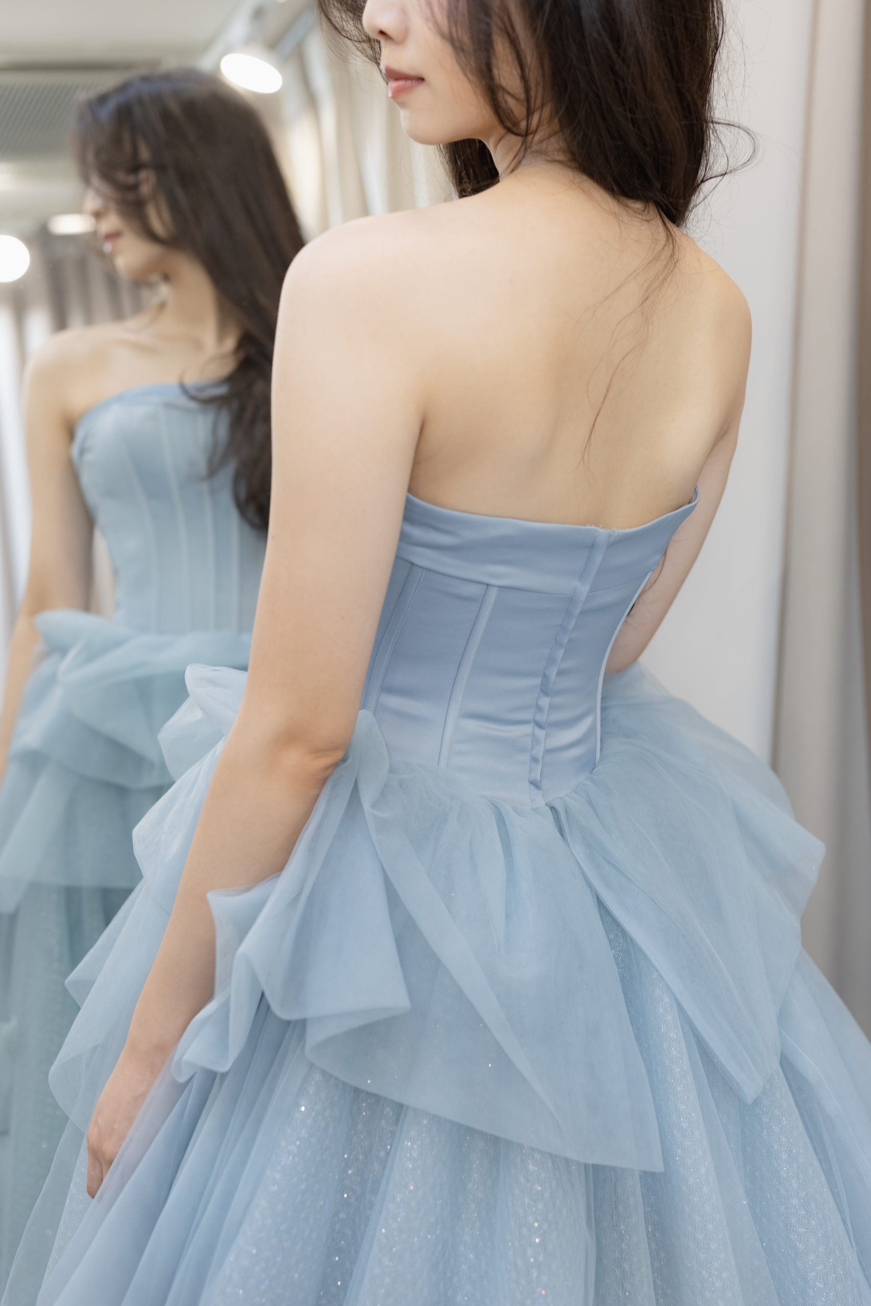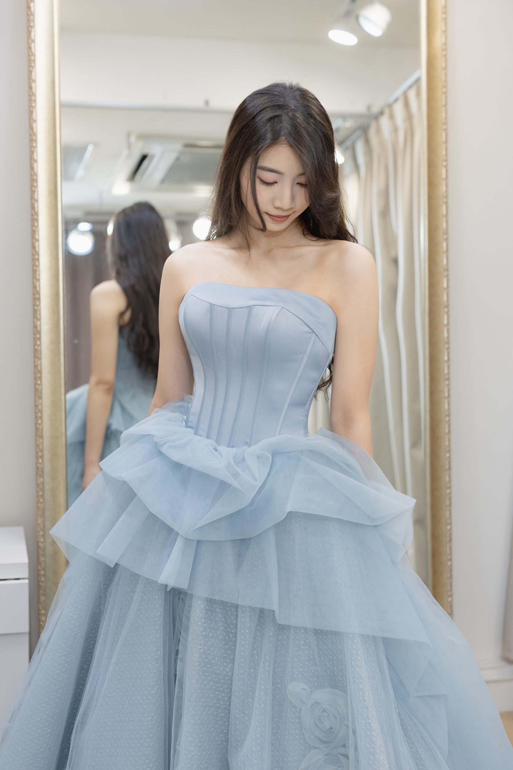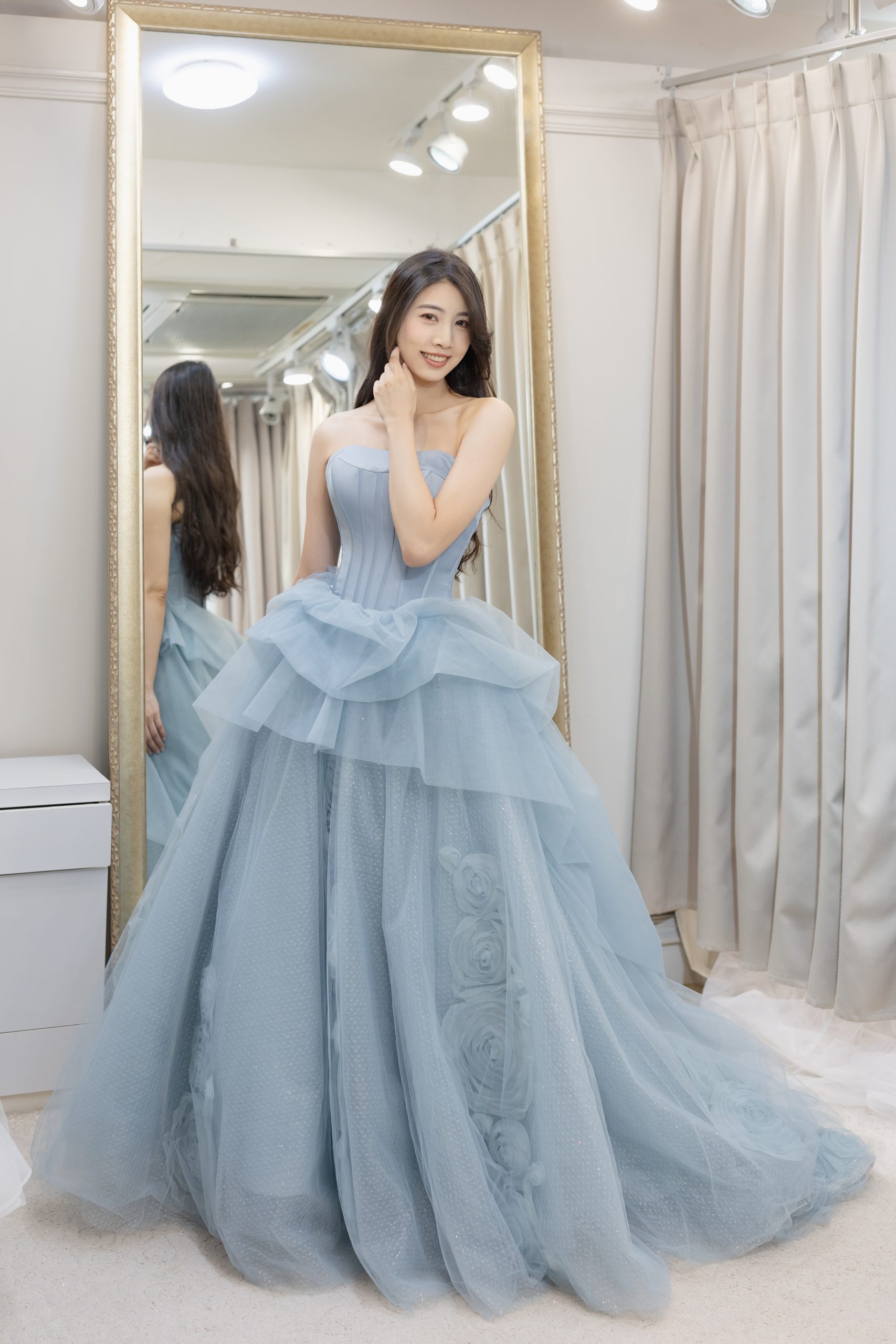 裙襬的設計則以藏在層次之中,由小到大綻開的藍玫瑰的形狀呈現,