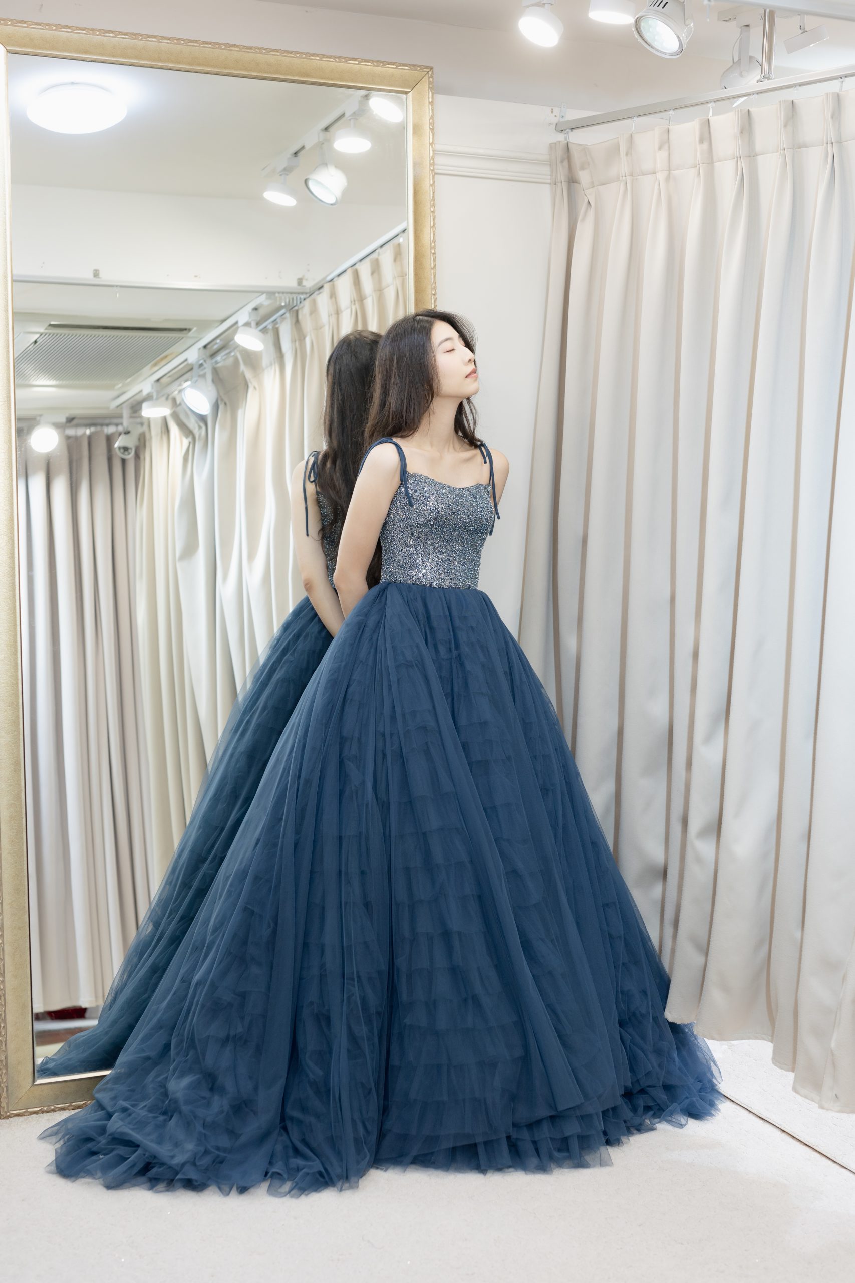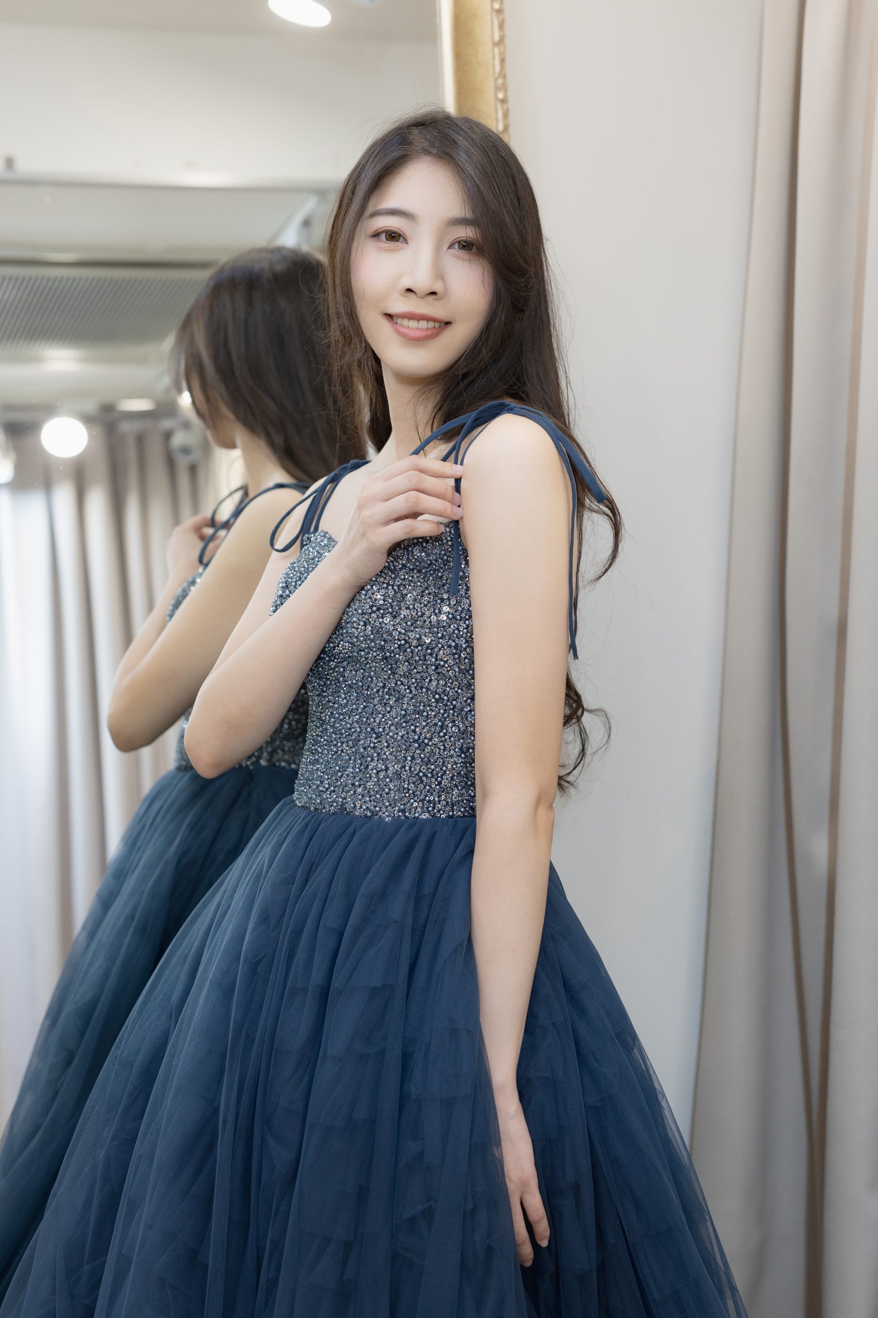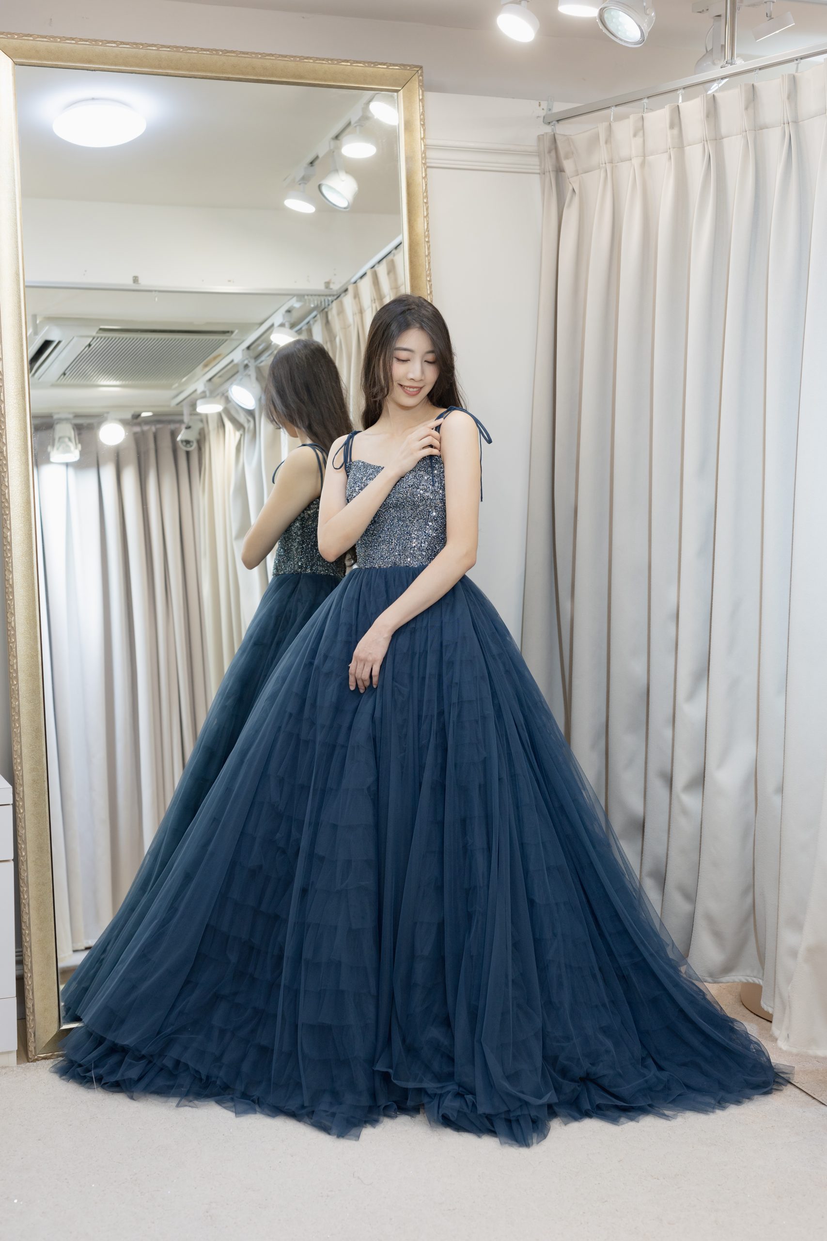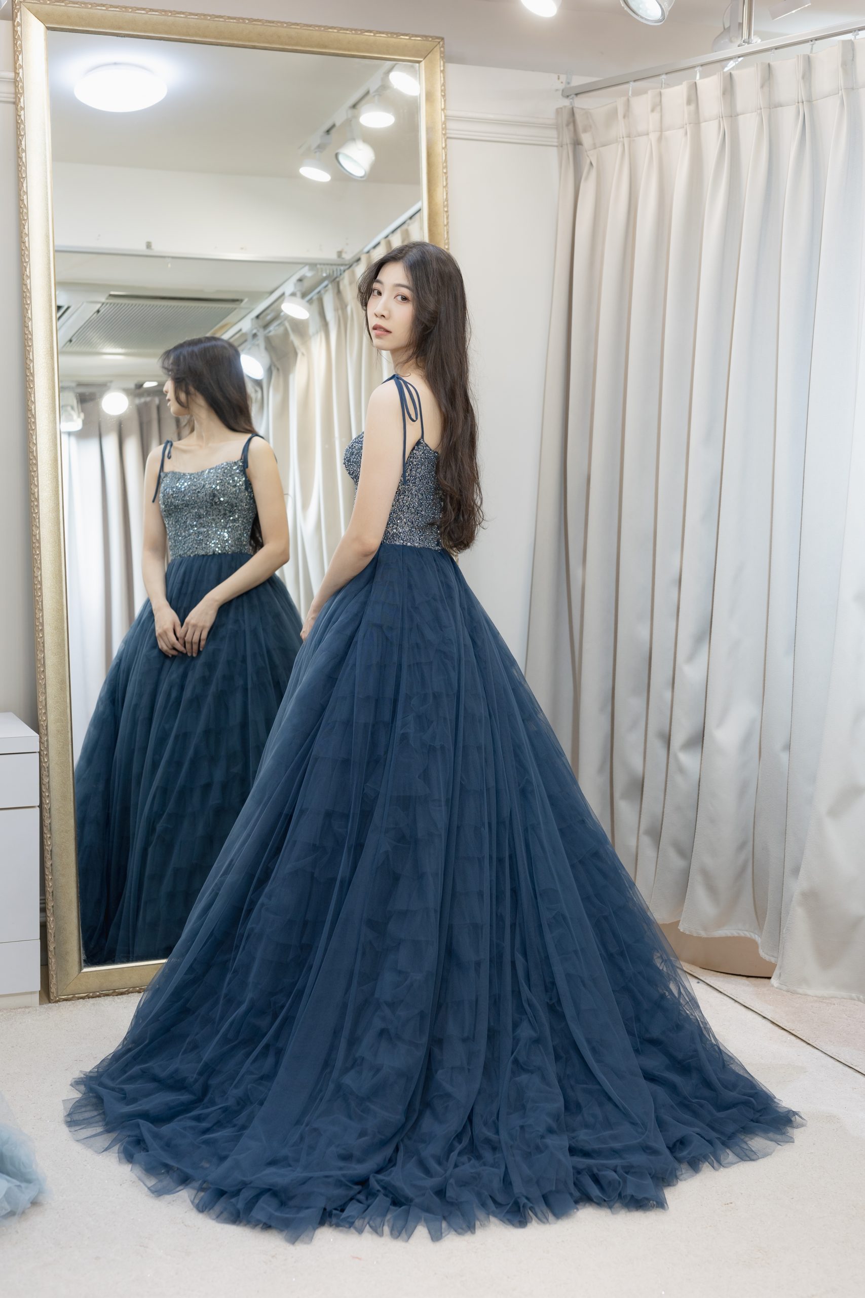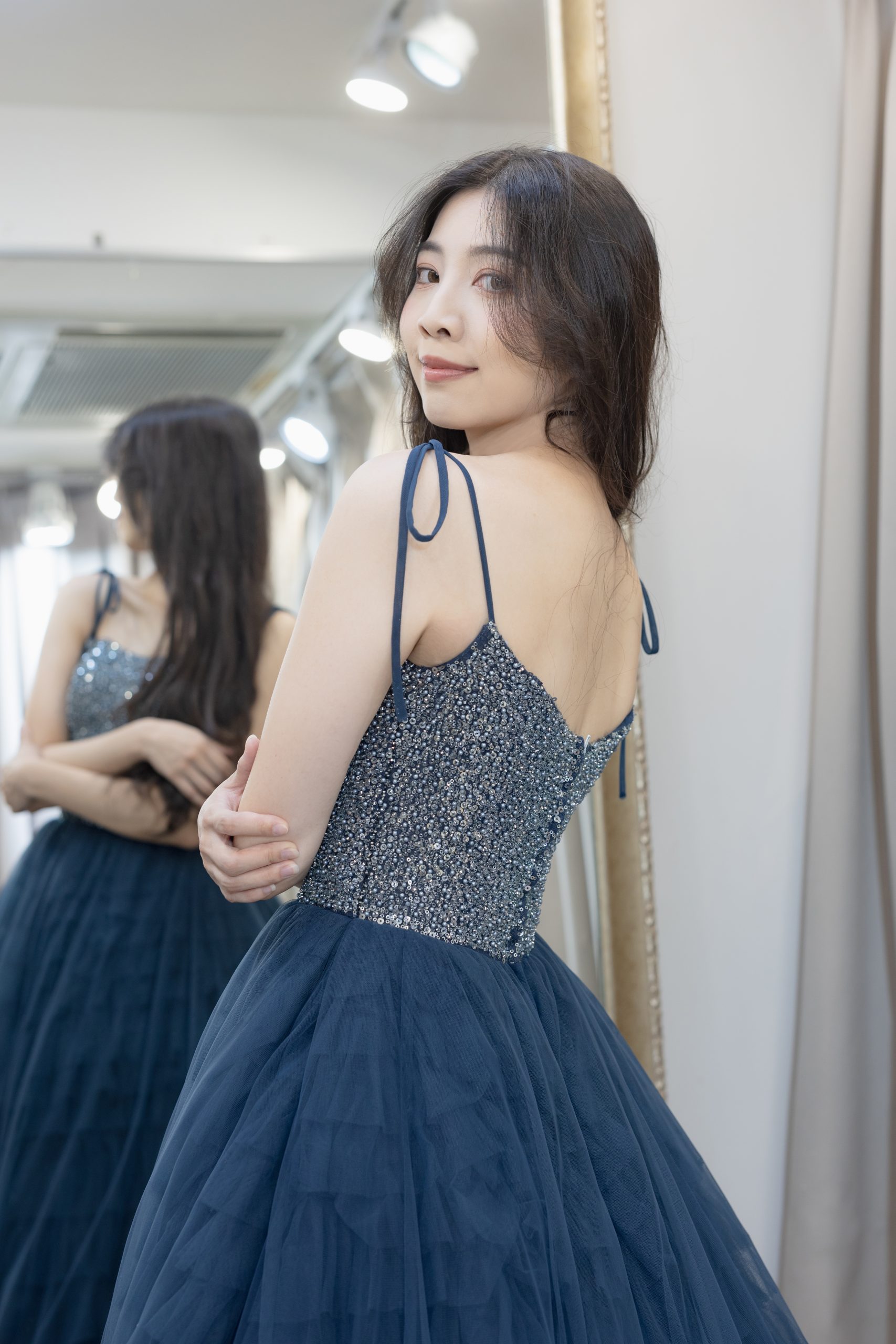 與閃耀的上身形成鮮明對比的是,下身裙襬選擇了深墨藍色的紗質面料,