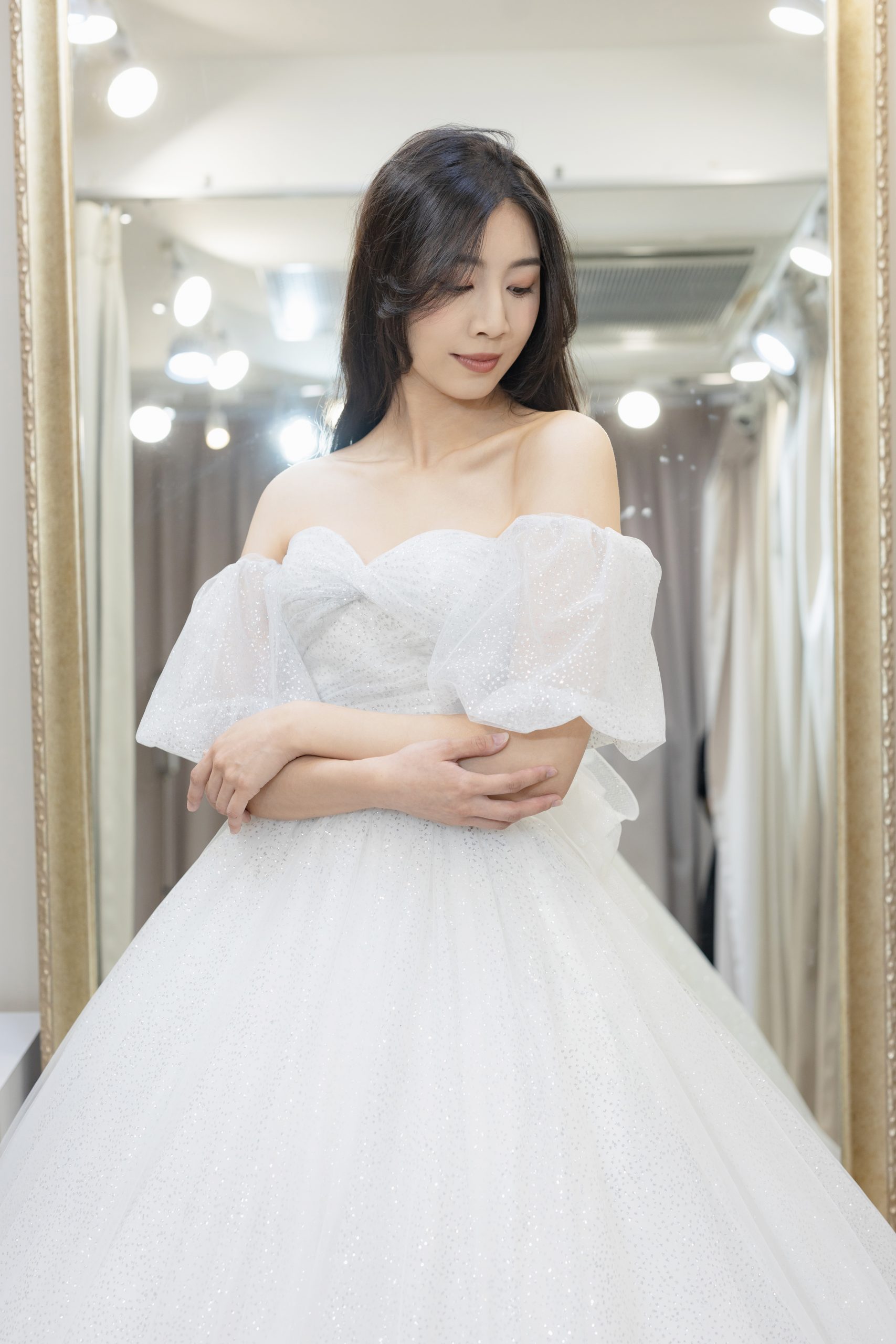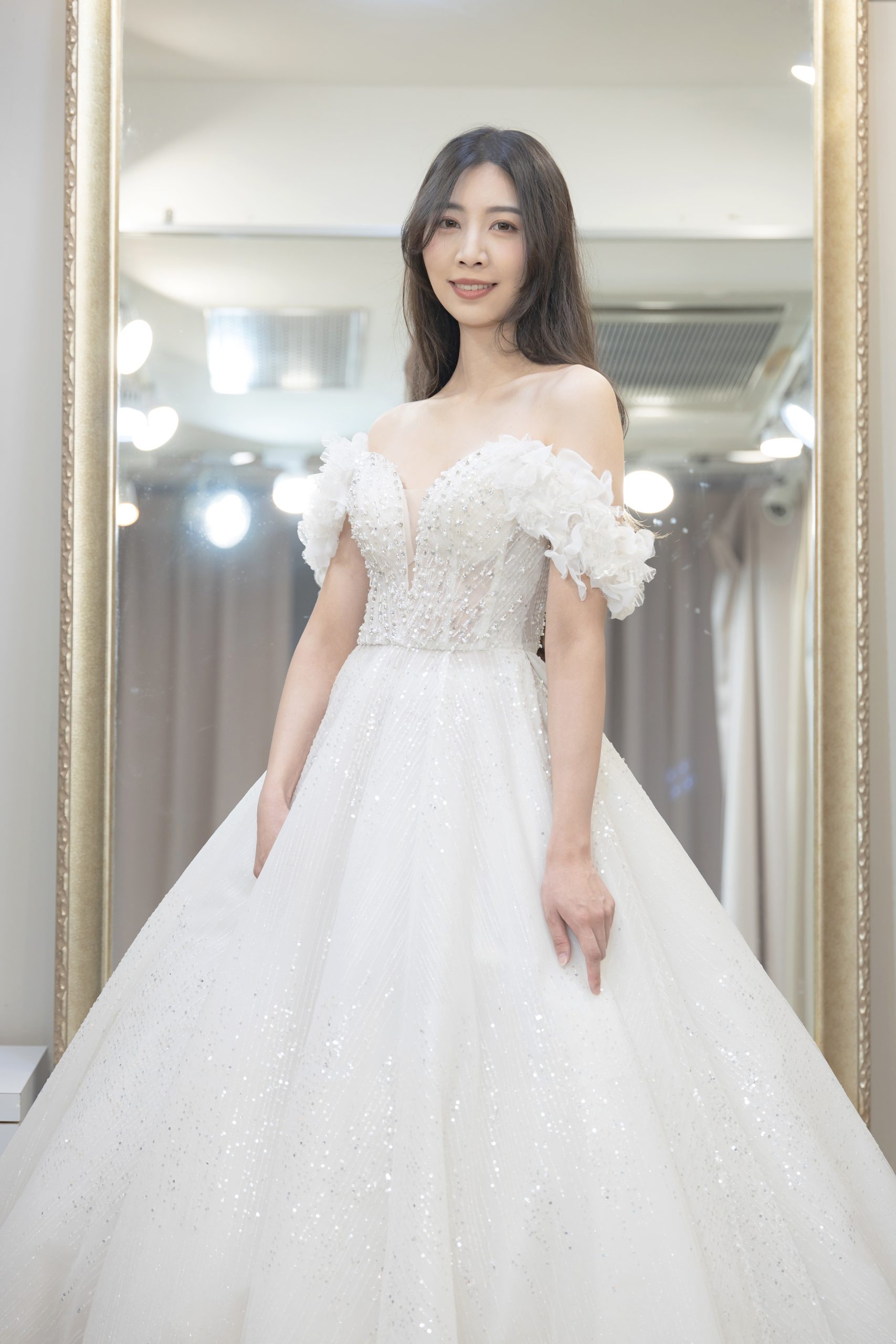 在布料的選擇上,設計師選用了柔霧白與細閃亮片紗,