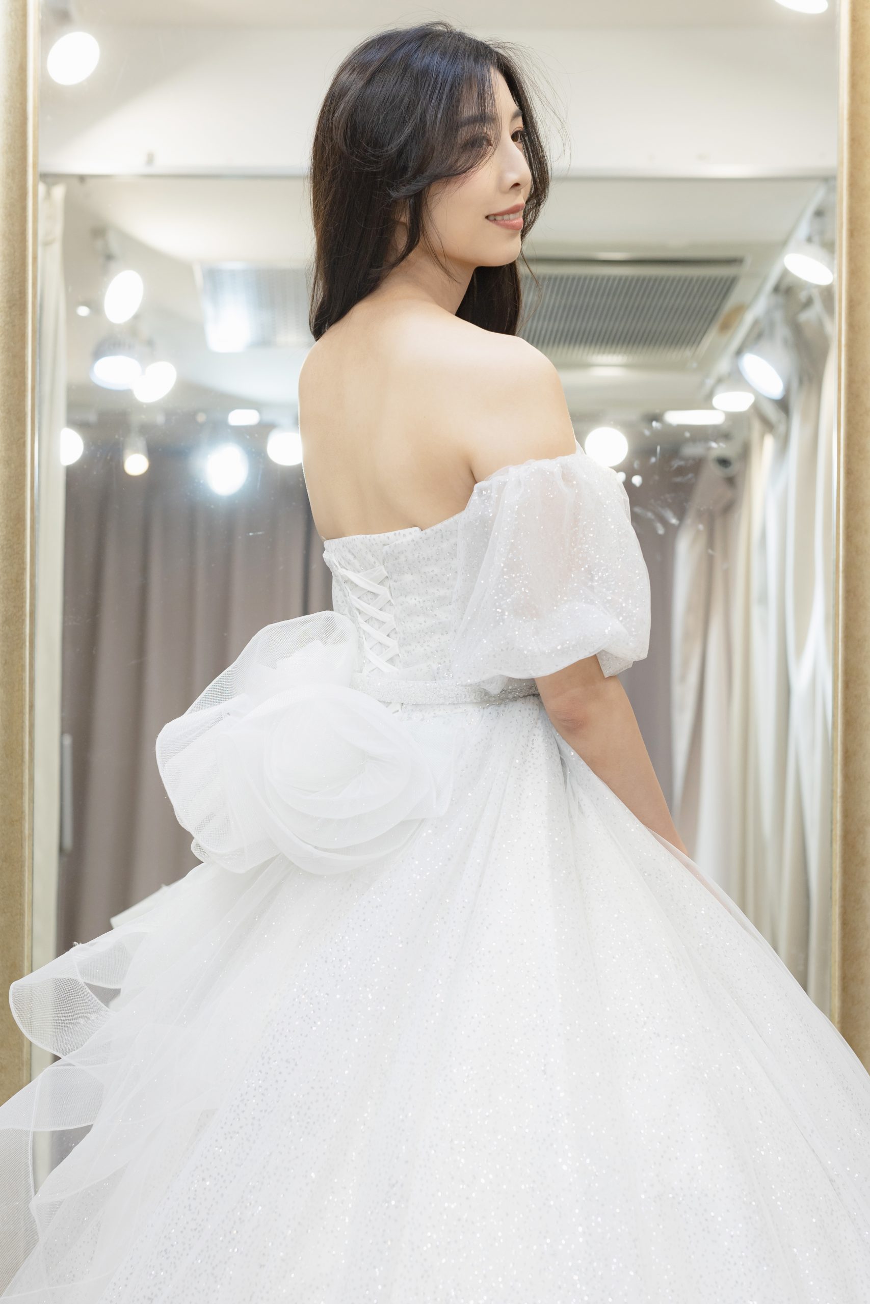 若搭配一件披肩或薄紗拖尾,更能延伸「梔雪」的意象,增添整體的儀式感與故事性。