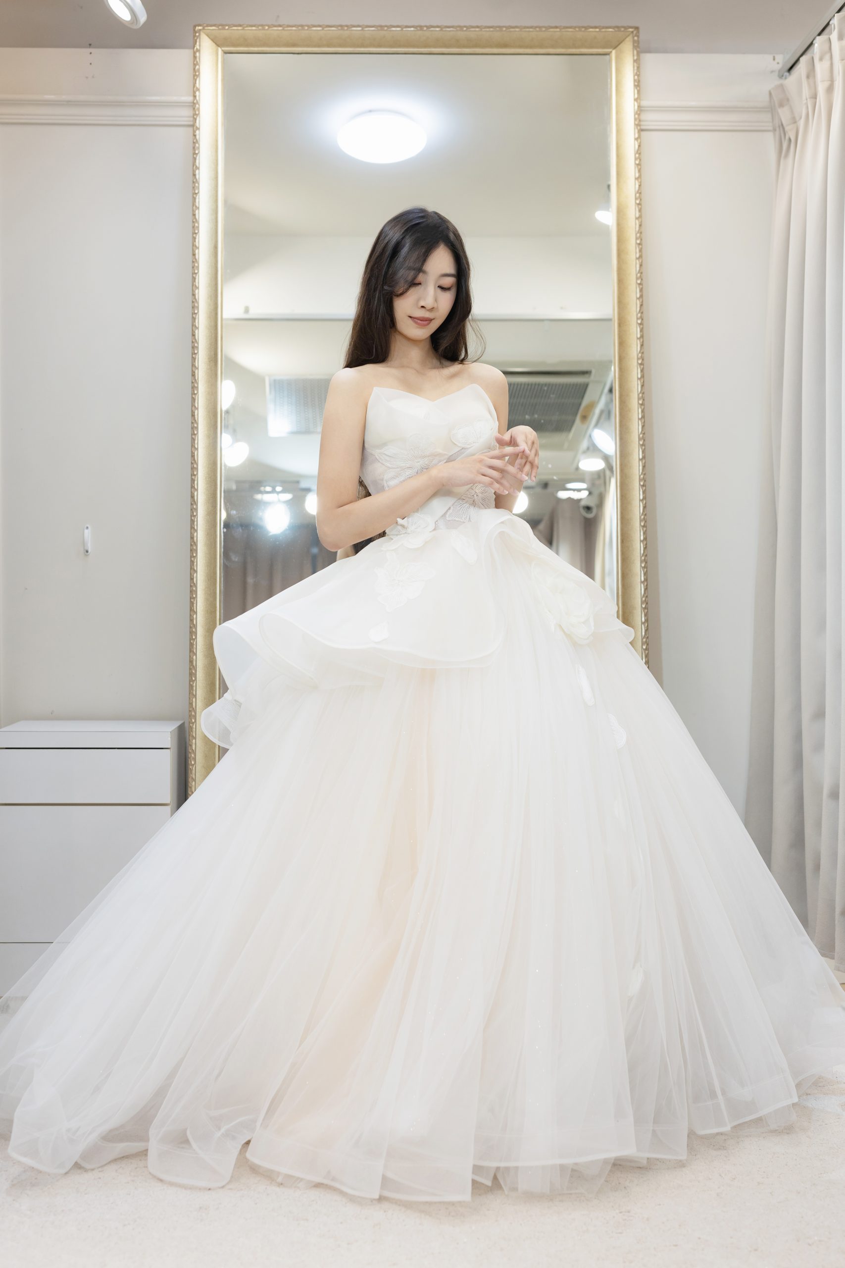 今天的任務,是試穿五款令人心動的白紗和晚禮服。