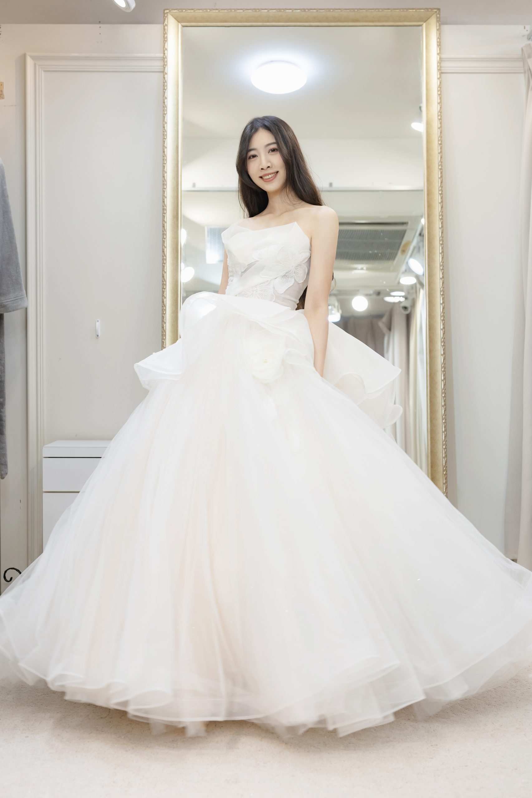 整體採用柔霧奶白色系的輕紗層層包裹,營造出柔和的光感與空氣感十足的廓形。