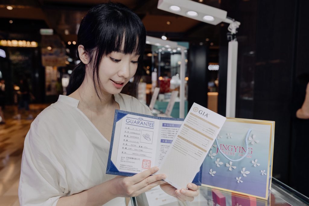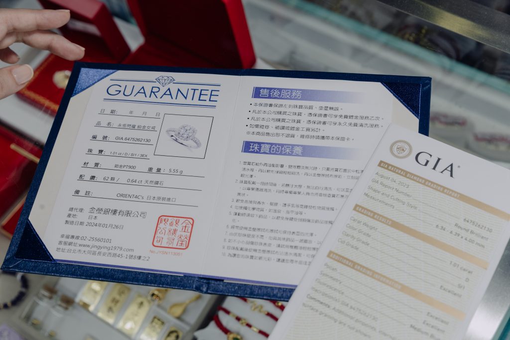 金瑩珠寶嚴選每一顆鑽石,皆附有國際權威 GIA鑑定書,不論成色、車工或淨度,都有專業檢驗作為品質後盾,讓新人在挑選人生中最重要的戒指時,完全無後顧之憂。
