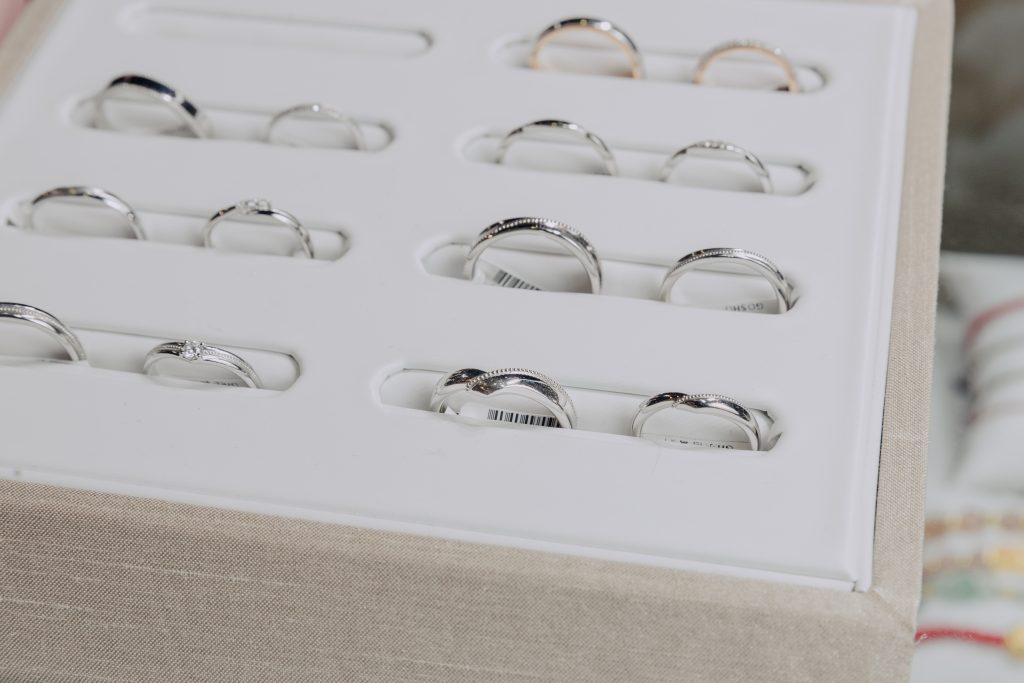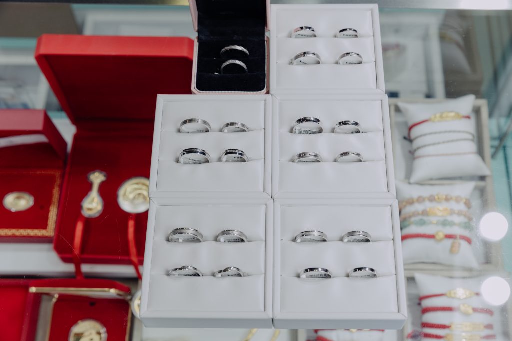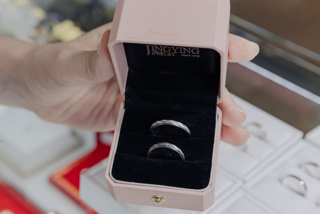 對戒部分金瑩珠寶櫃上有很多款式,從極簡低調到設計感十足的華麗款應有盡有,真的不怕挑不到喜歡的,反而是會陷入選擇障礙那種程度!櫃檯顧問細心地一盤盤拿出來給我看,每一款都閃閃發亮,材質上有鉑金、K金可選。