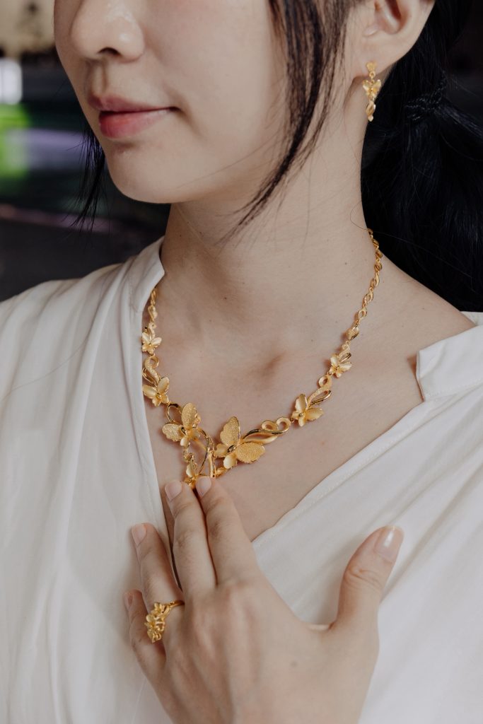 蝴蝶造型的項鍊,蝴蝶雕刻立體且細緻,線條如絲帶般流暢。戴上金色的溫暖光澤與膚色融合,看起來頸部線條更顯修長。