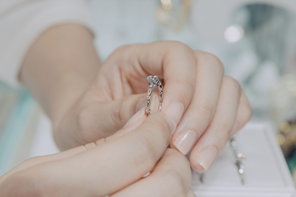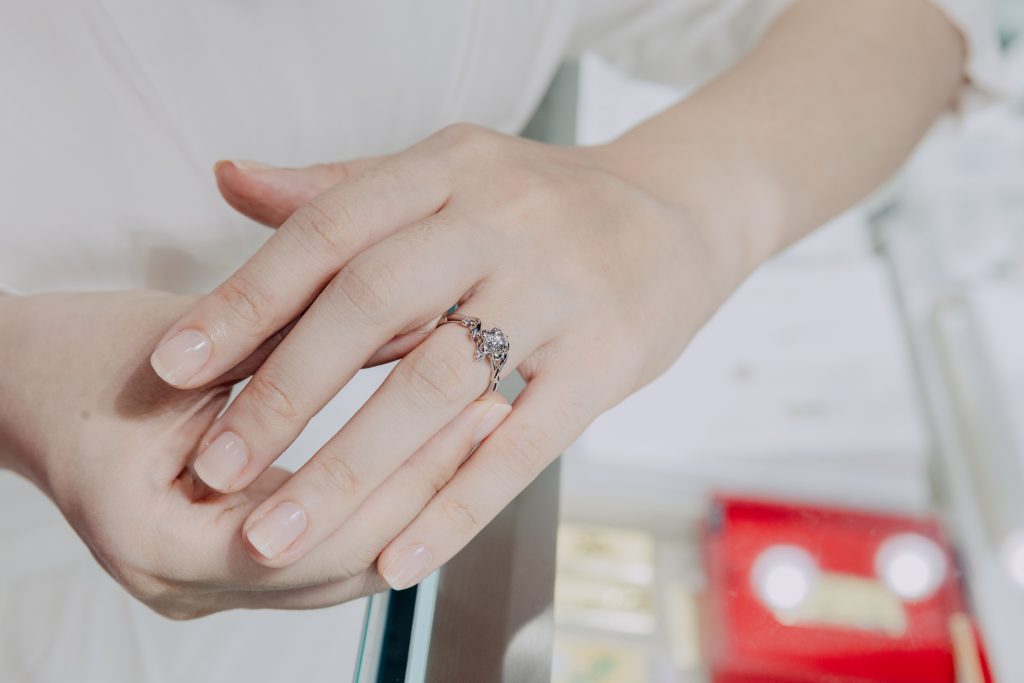第一眼看到這款戒指,我就被精緻的線條吸引,戒圈是復古雕花搭配小鑽點綴。中央主鑽採經典六爪設計,透過側面能看到立體的花型托座。它每一個角度觀看都有細節。所以我試戴的時候會一直忍不住轉動手指,這款設計真的很讓我喜歡。