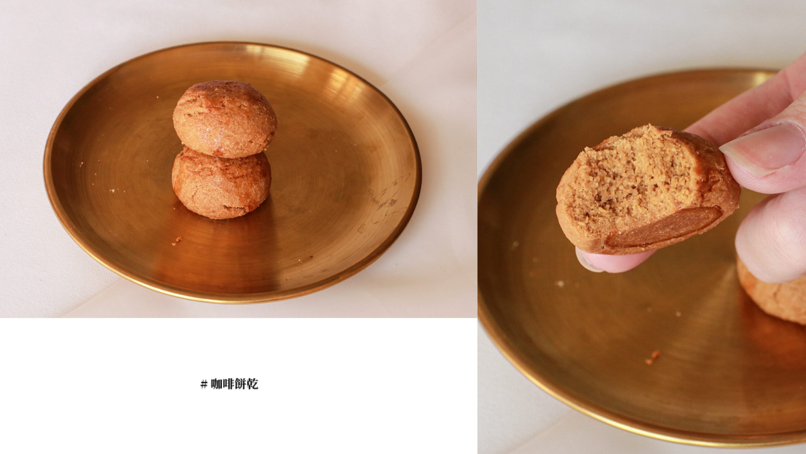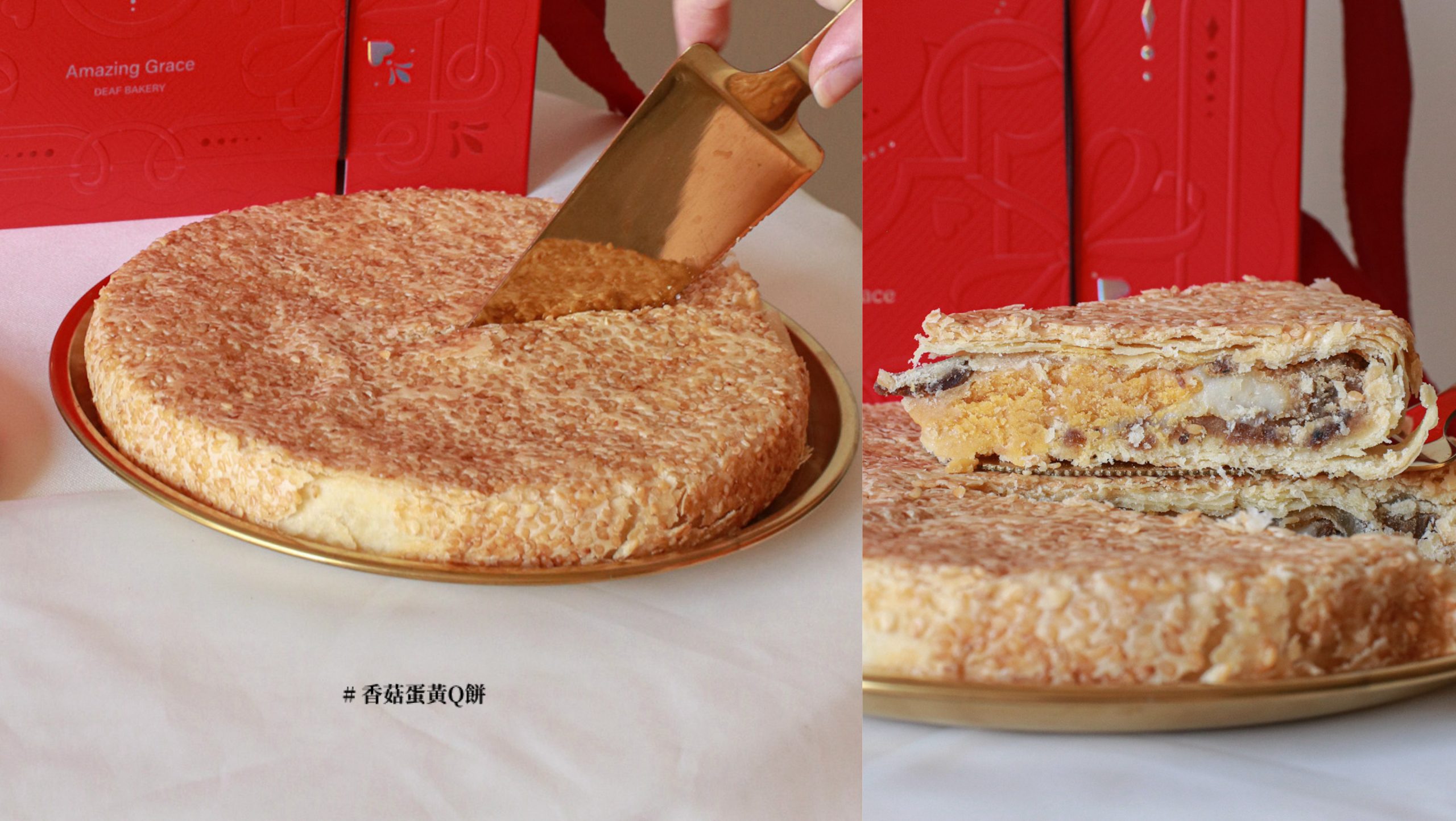 香菇蛋黃Q餅:外鬆內軟而細膩,內餡以香菇與鹹蛋黃融合,鹹香的層次多變,一口咬下有互相交錯的驚喜感!這份厚實與圓滿,不僅呼應婚禮喜餅的祝福含義,也讓整盒禮品更添特色。