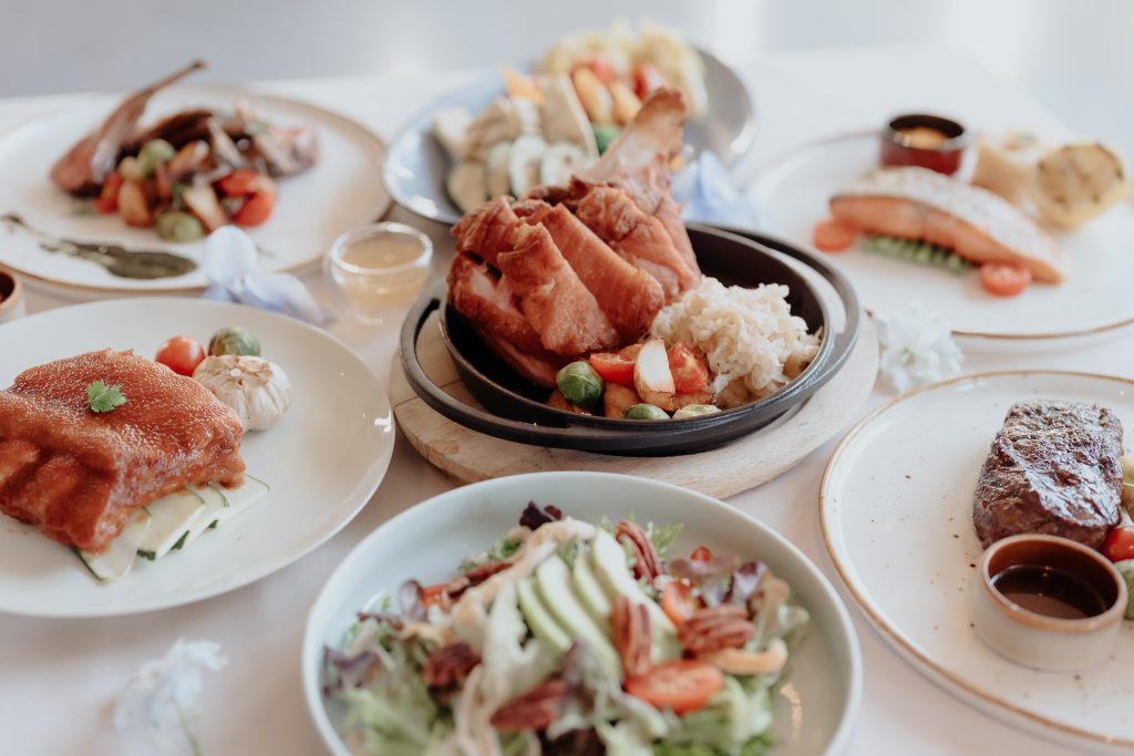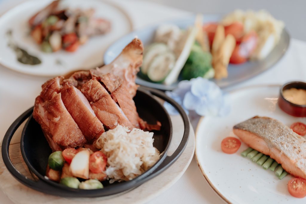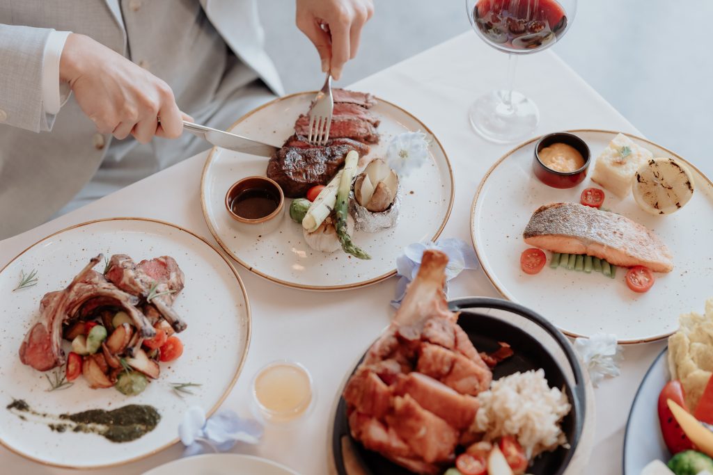 餐檯設計上以分區呈現,讓賓客用餐動線順暢不擁擠。冷盤與海鮮區集結多道精緻前菜,像是煙燻鮭魚、炙燒鮪魚、雞尾酒鮮蝦,走的是新鮮原味、鹹香有層次的高級路線。而熱食部分則融合西式經典與創意料理,從德國豬腳佐酸菜、紅酒慢燉牛,到羊肩排佐奇異果沙沙,每道菜都吃得出用心與層次,讓婚宴餐點不只是儀式的一部分,而是真正能留下「味覺記憶」的體驗。