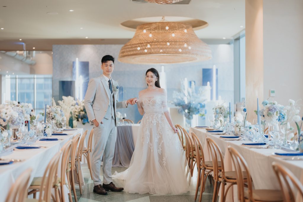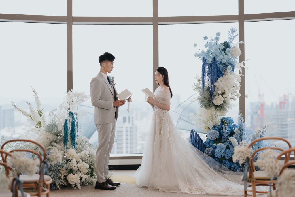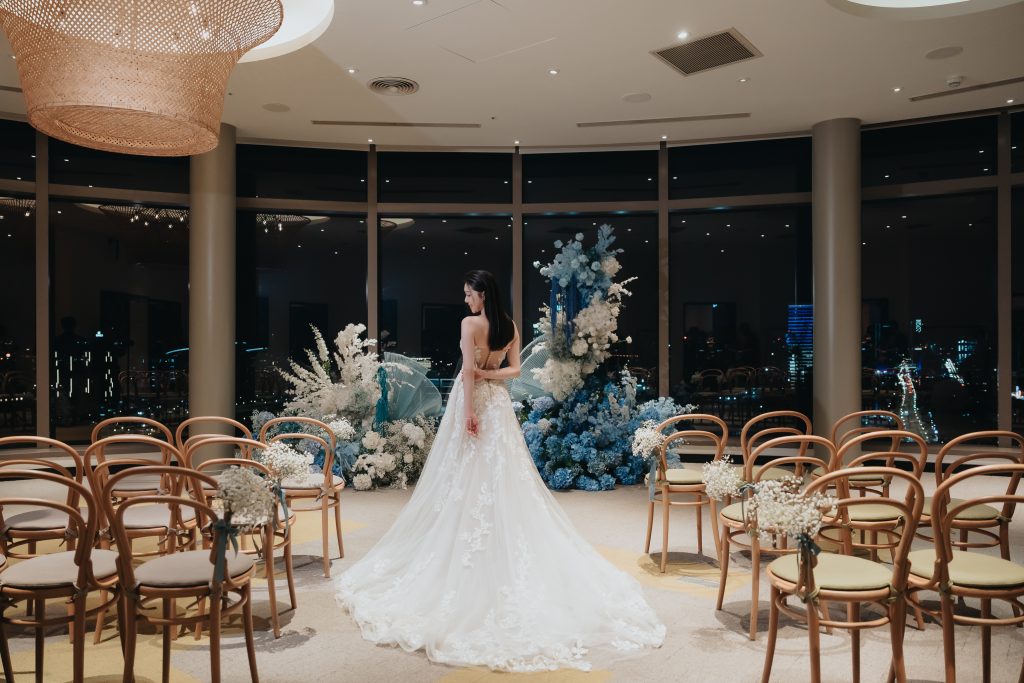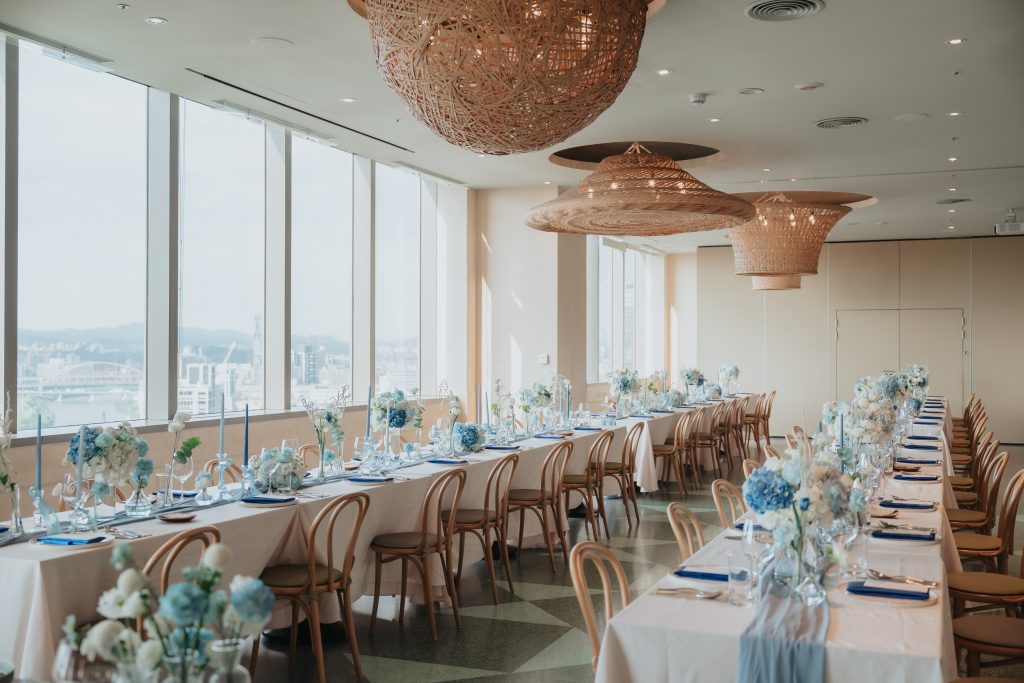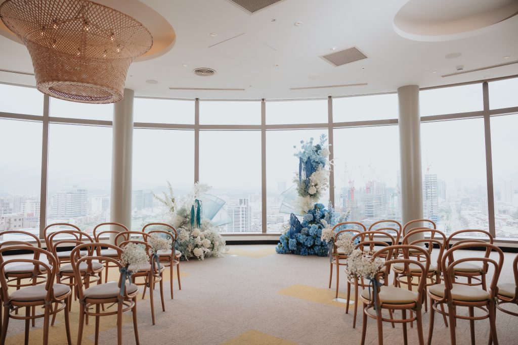 場地本身不需過多佈置,藍白花藝拱門搭配乾淨留白牆面與木質椅座,就能營造出一種自然不造作的證婚氛圍。半圓形的窗景包圍感讓空間不只是開闊,更有一種被城市環抱著的安全感。無論是親密的 20 人小型儀式,或是多桌婚禮中的精緻儀式段落,這裡都能完美承接。