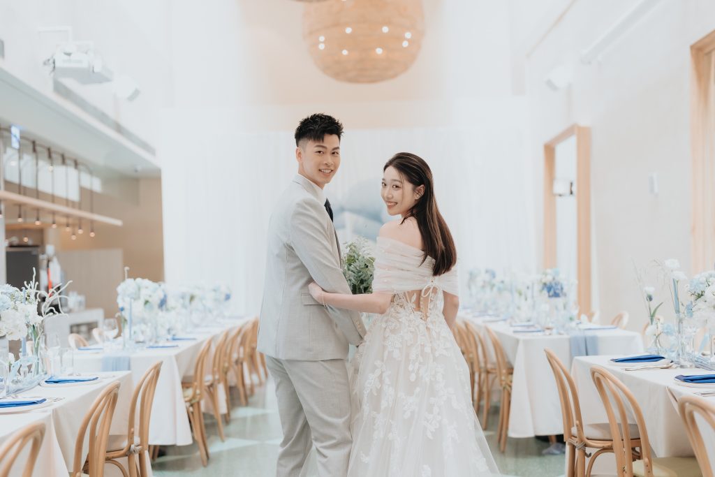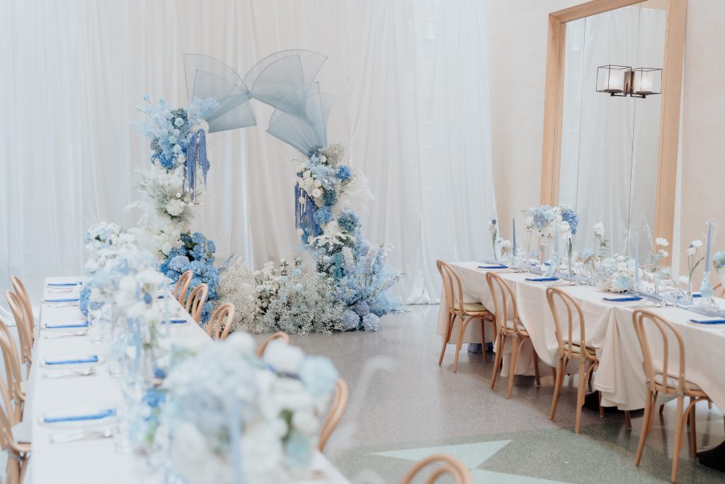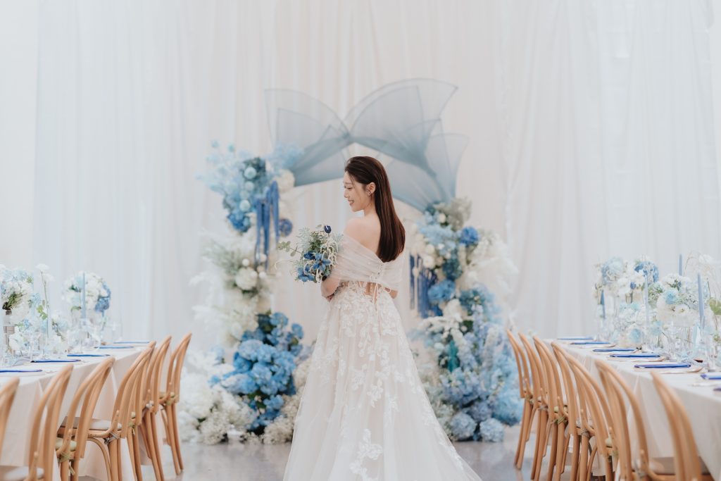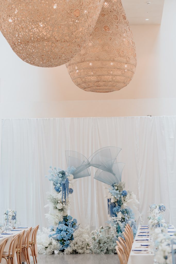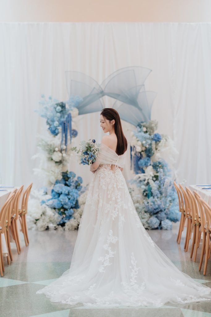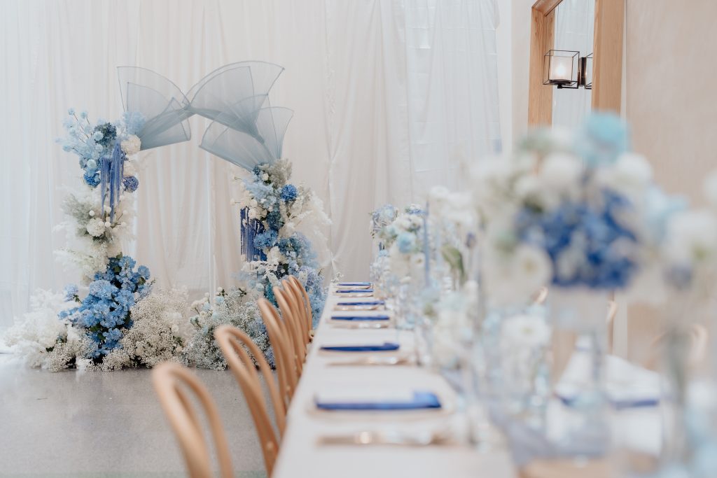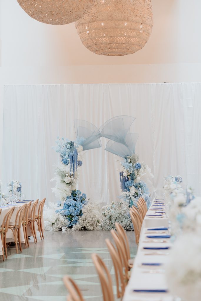 現場布置以藍白色系花藝為主,搭配通透的拱門與清新的長桌,打造一種純淨簡約的溫柔氛圍;不會過度鋪張,一切卻又剛剛好,不會搶過新人的光芒。整體空間不大,卻因為挑高與對稱動線而顯得格外平衡。