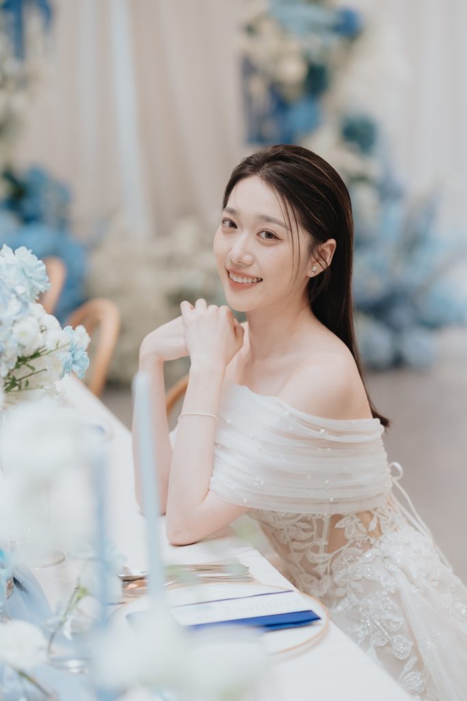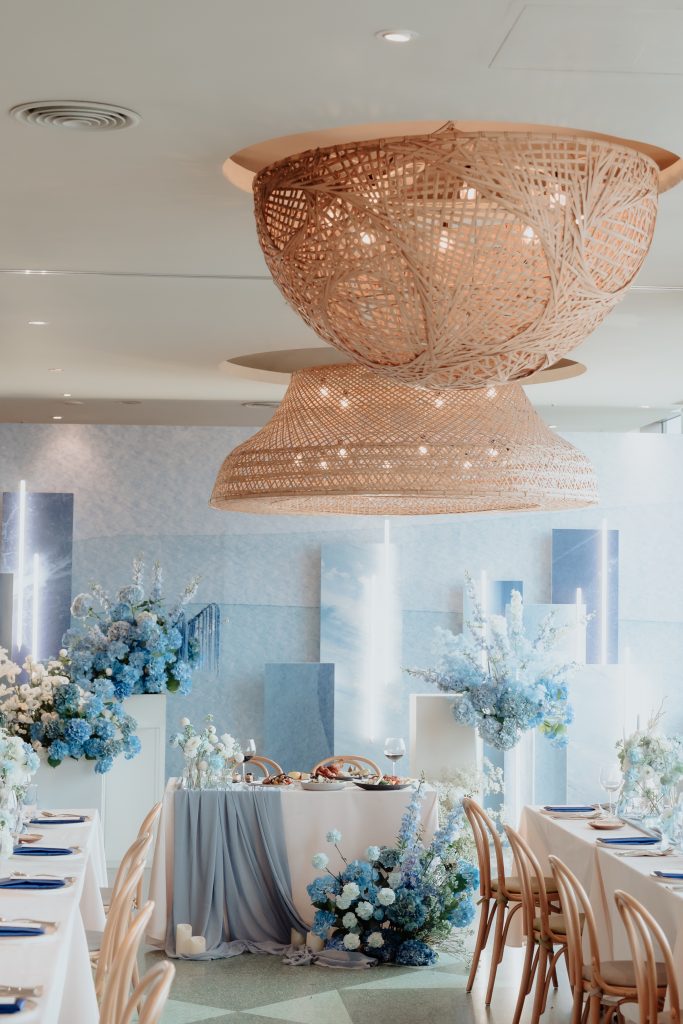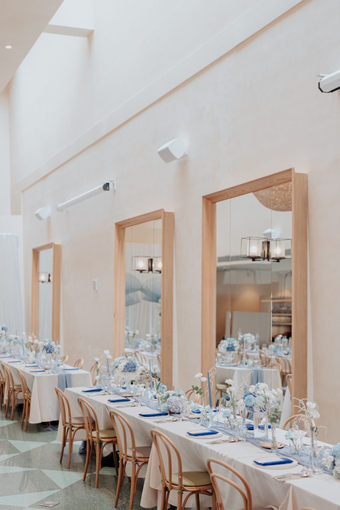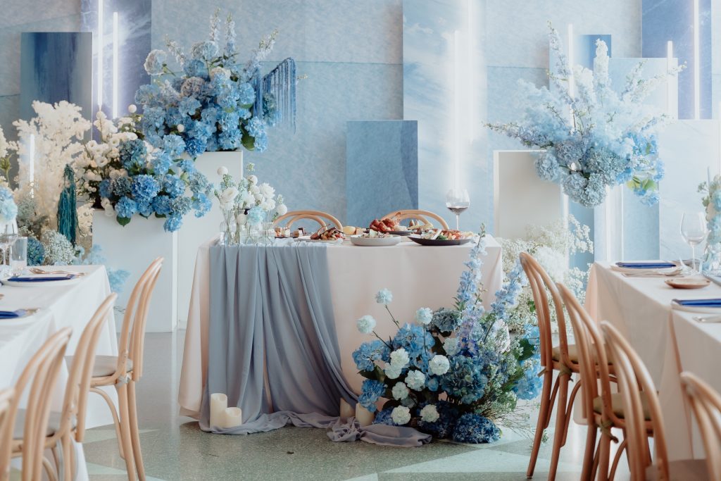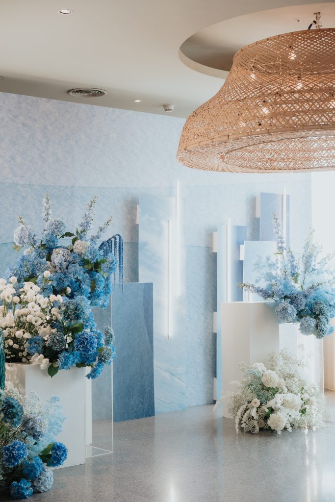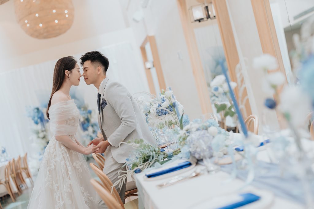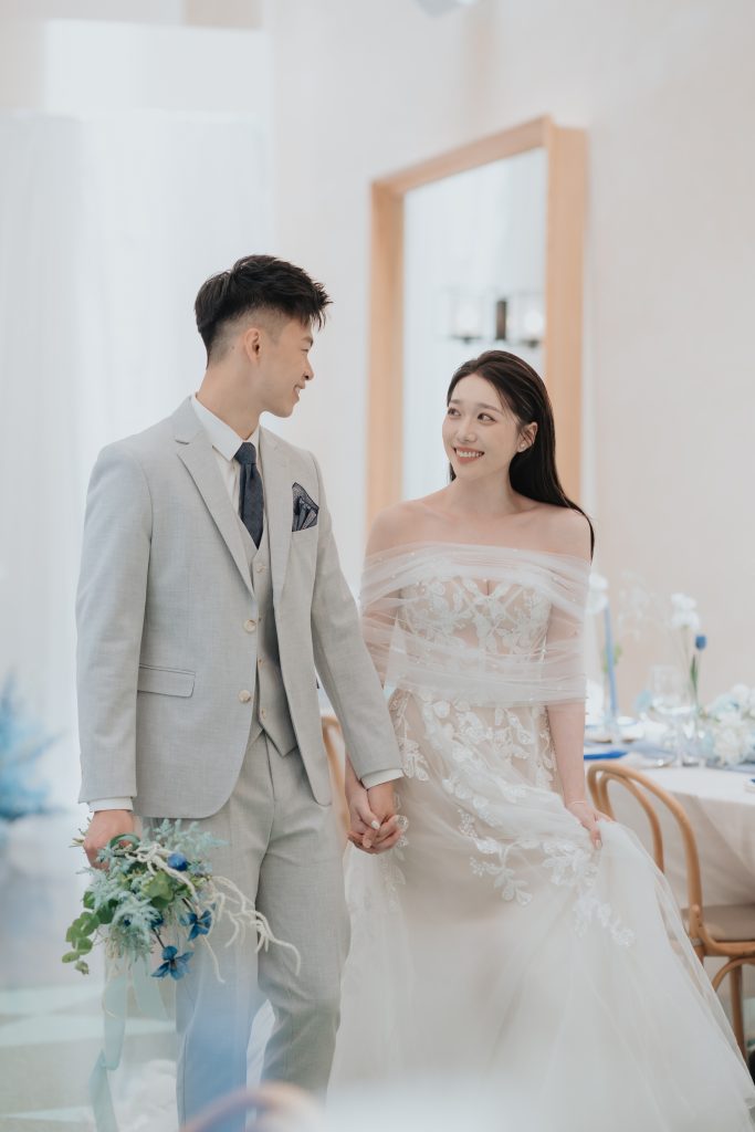 現場布置以藍白色系花藝為主,搭配通透的拱門與清新的長桌,打造一種純淨簡約的溫柔氛圍;不會過度鋪張,一切卻又剛剛好,不會搶過新人的光芒。整體空間不大,卻因為挑高與對稱動線而顯得格外平衡。