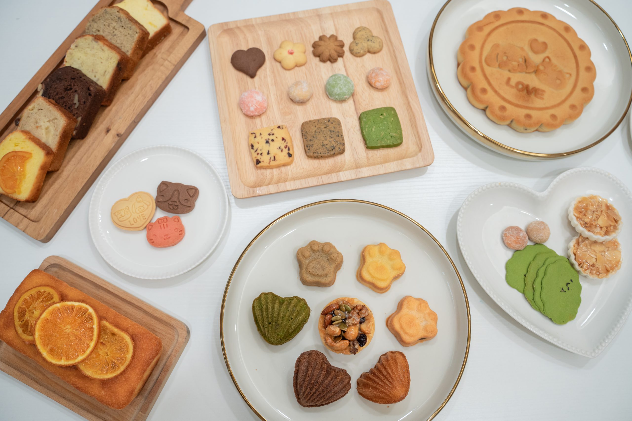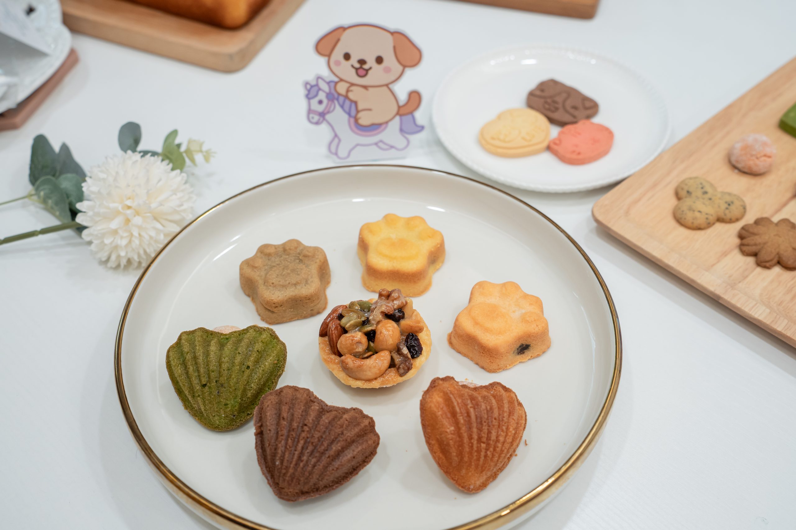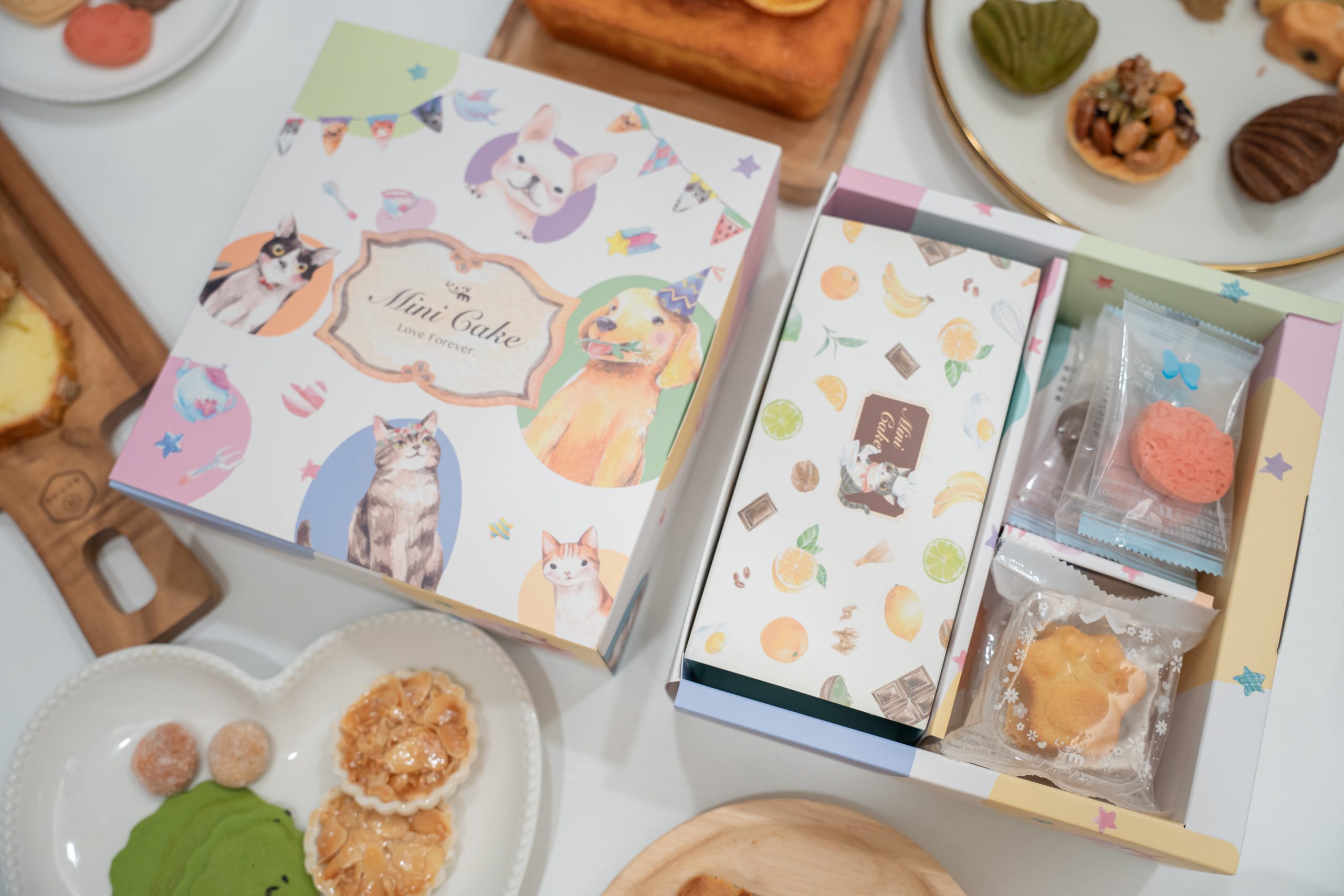 內含有磅蛋糕綜合切片組x6、造型餅乾x5、貓掌酥x1、堅果塔x1