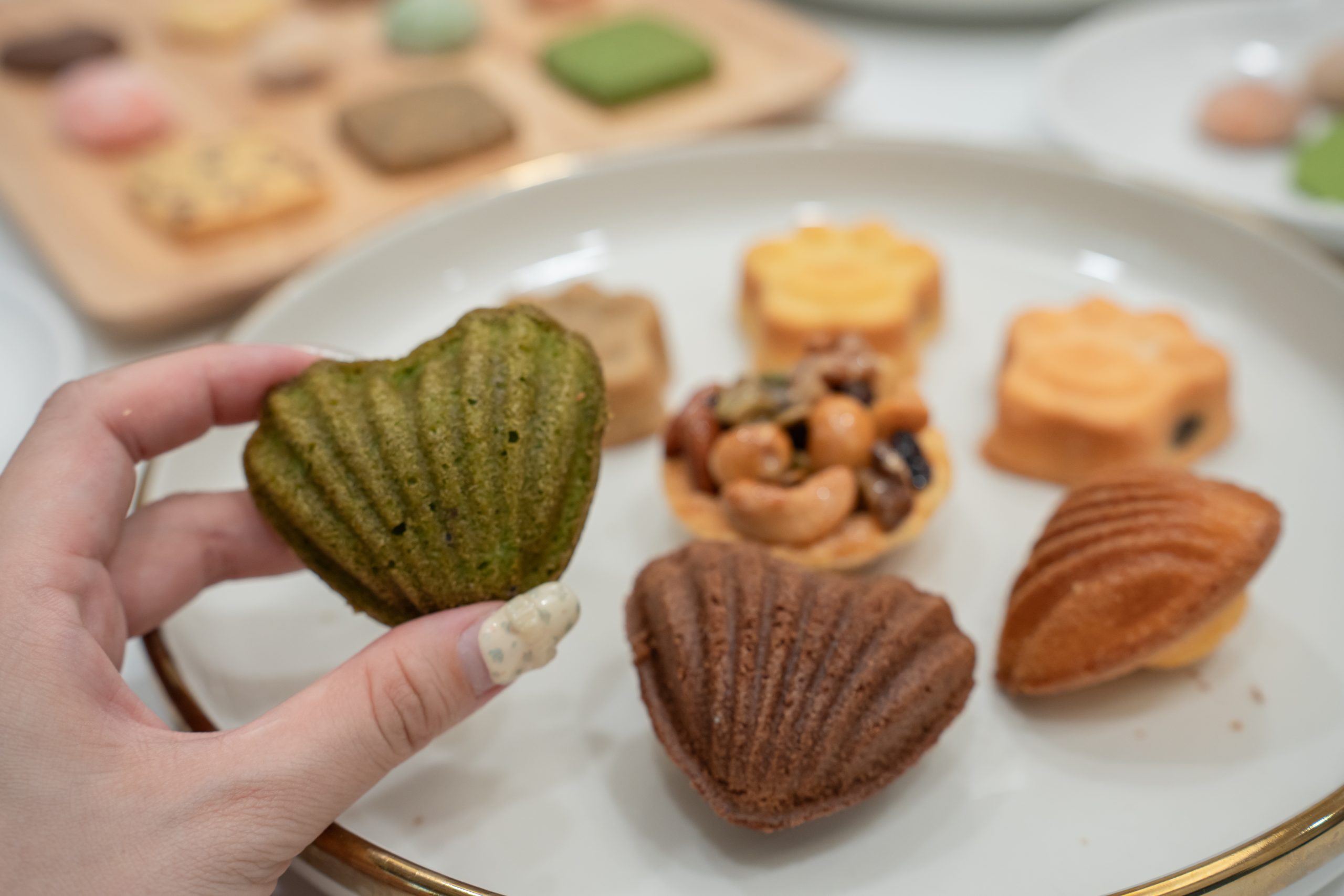 這三款是抹茶、原味、巧克力口味的愛心形狀瑪德蓮蛋糕