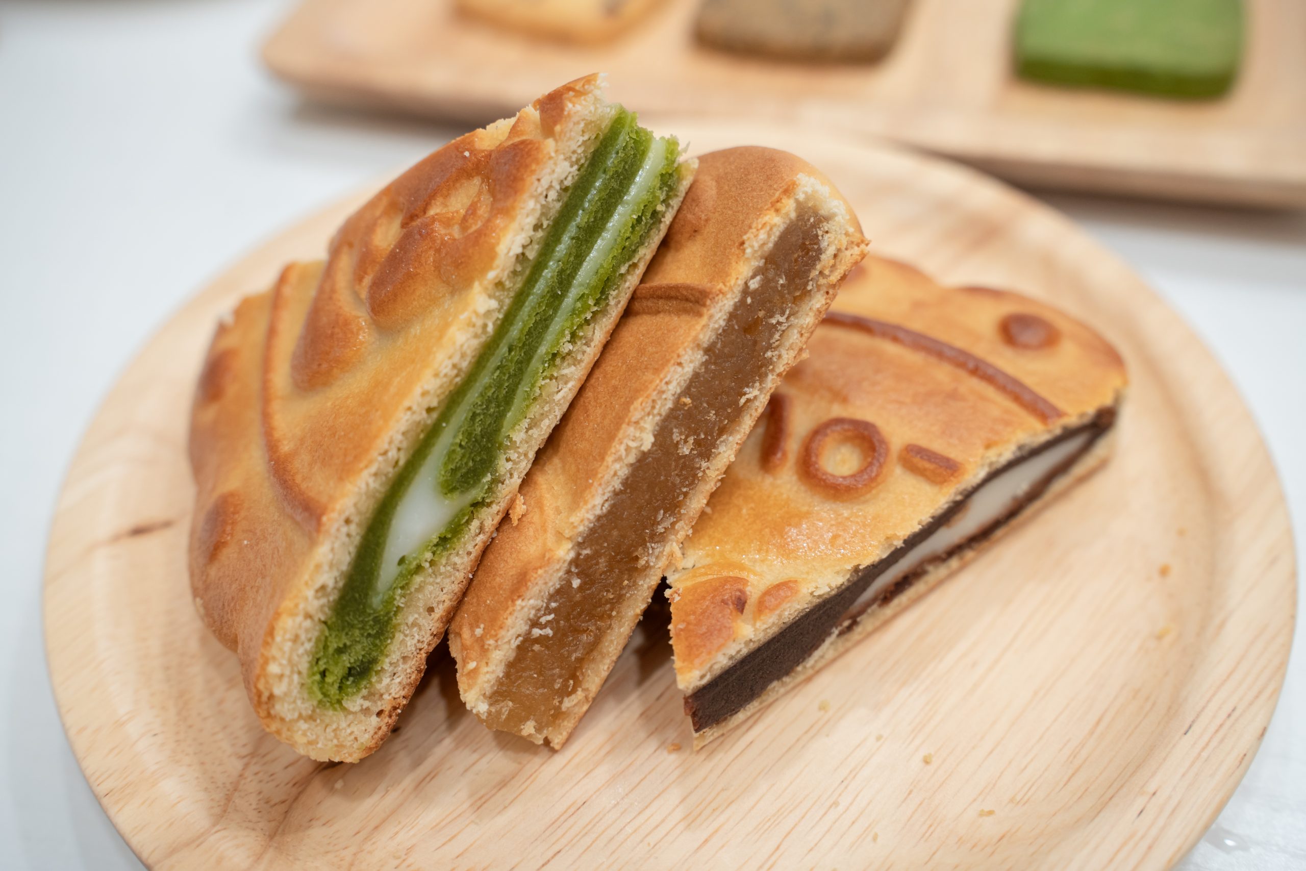 一共有四種口味:紅豆麻糬、抹茶麻糬、古早味鳳梨、烏豆沙蛋黃