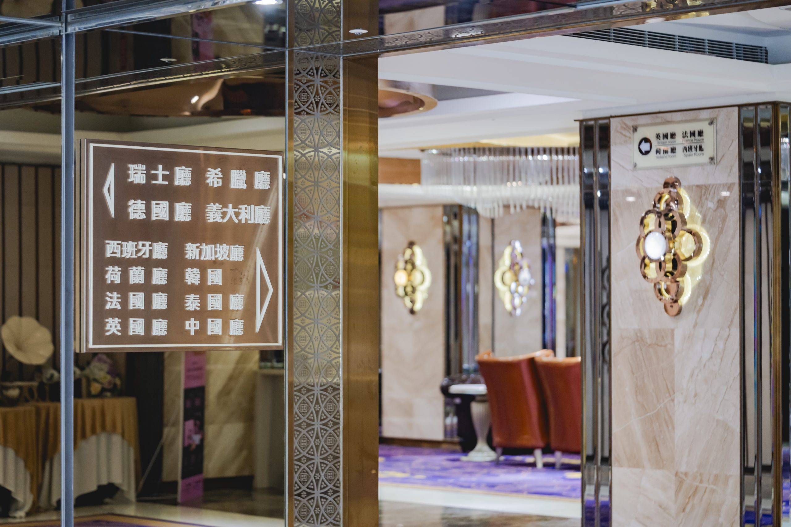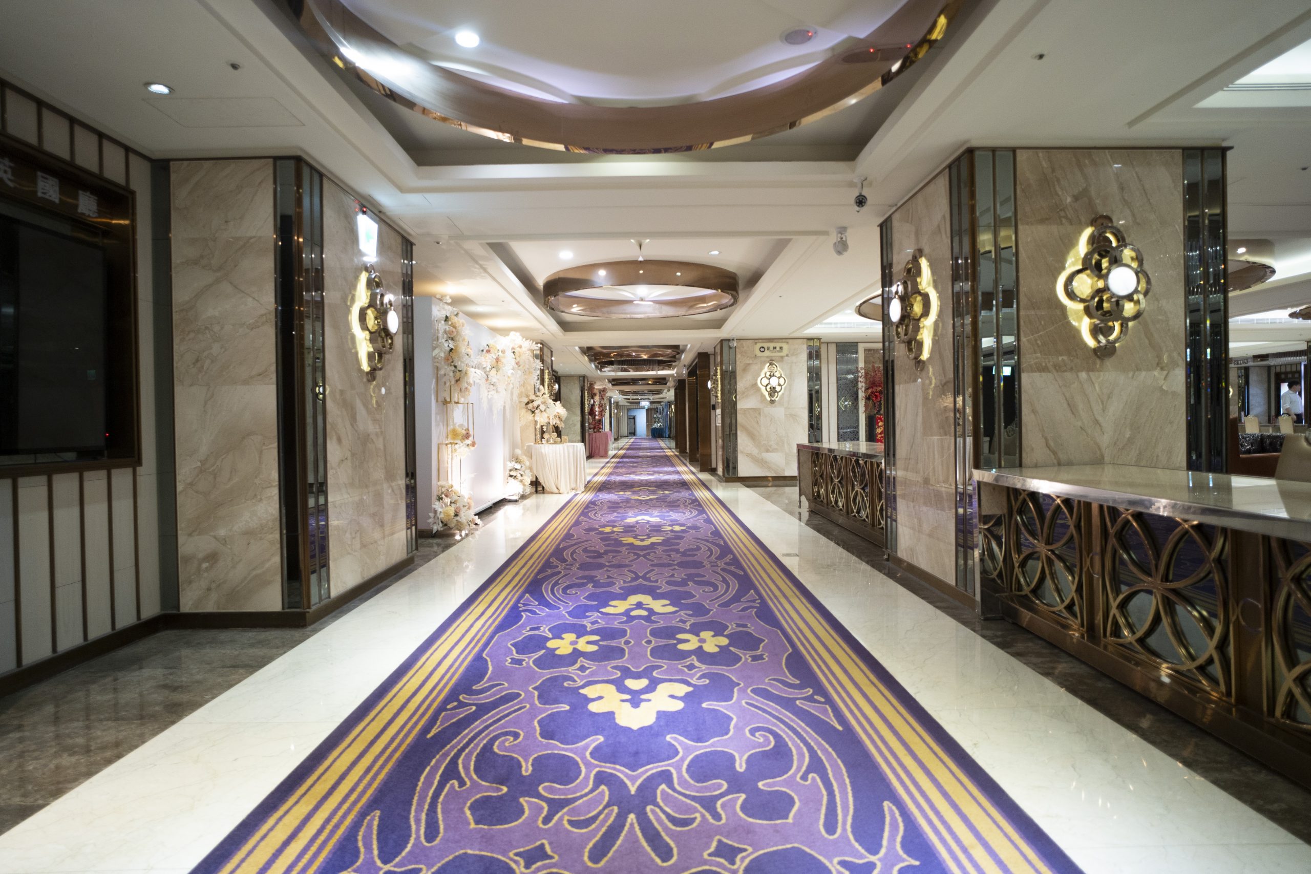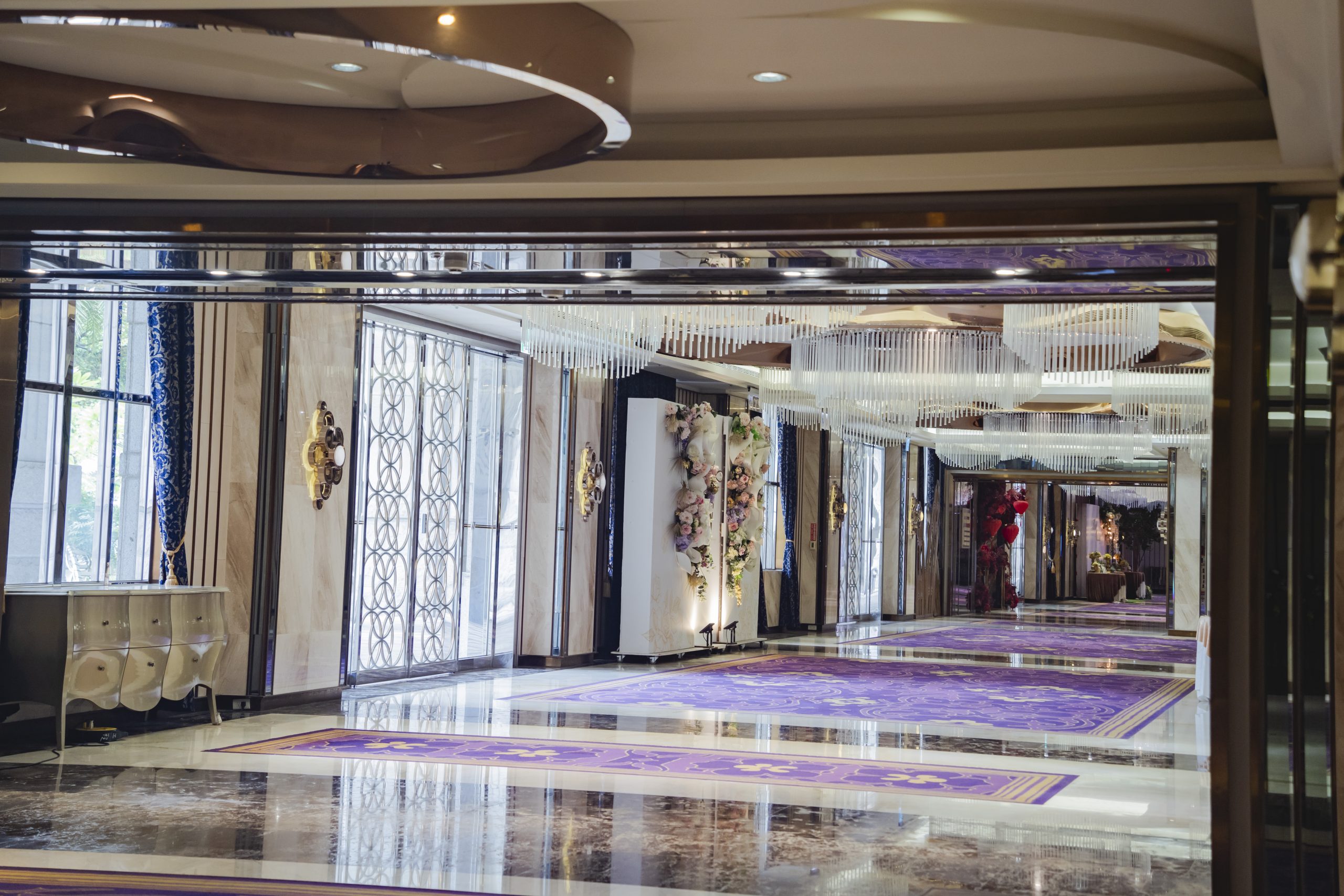 挑高的空間、紫金色系的地毯一路延展,搭配大理石牆面與金色燈飾,華麗卻依然莊重。