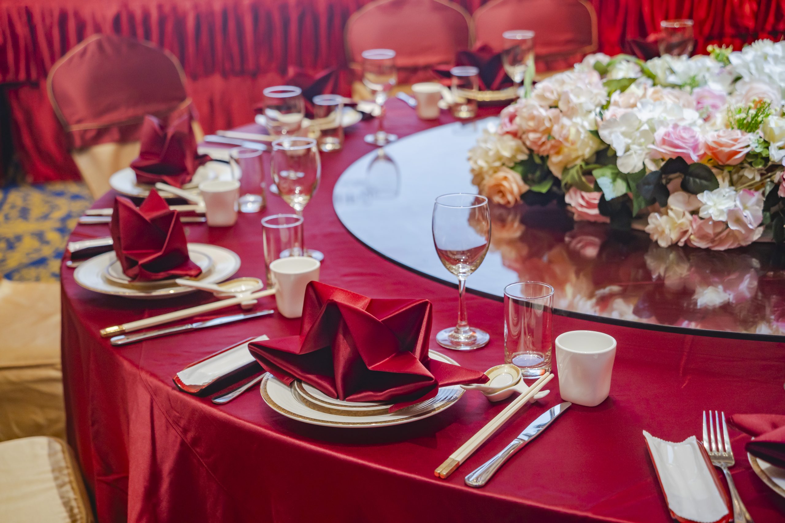 主桌以紅與金交織,搭配盛放的花圈,讓氛圍既隆重又溫暖。