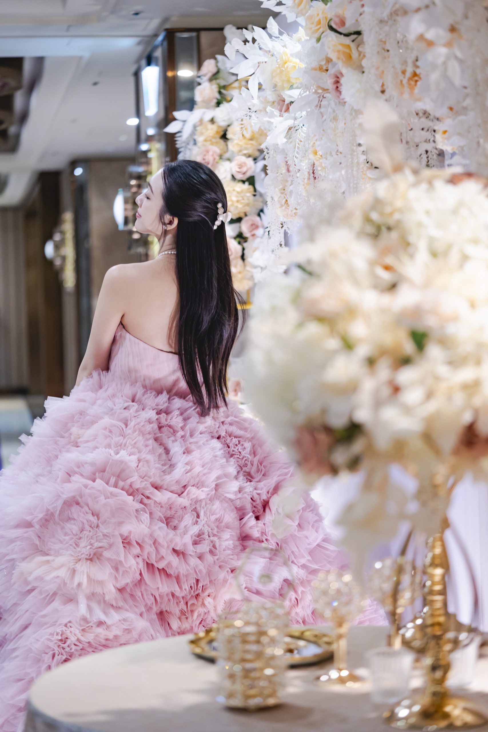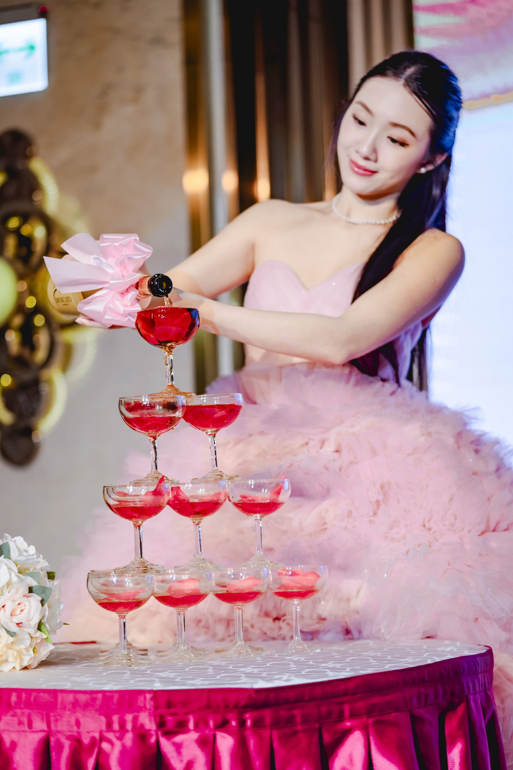 當新人攜手將粉紅氣泡酒緩緩注入,香檳自上而下逐層流淌,填滿每一只高腳杯。