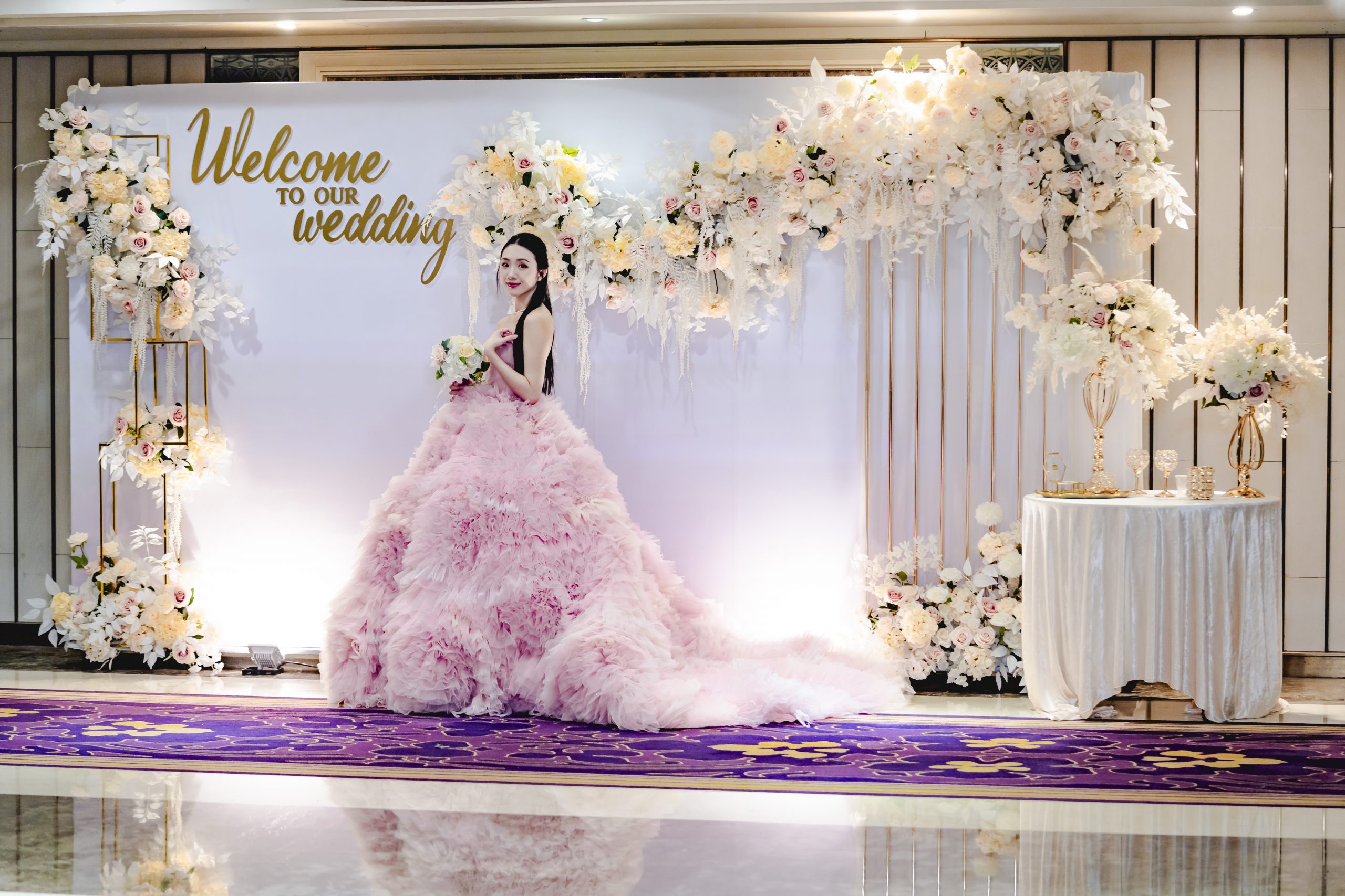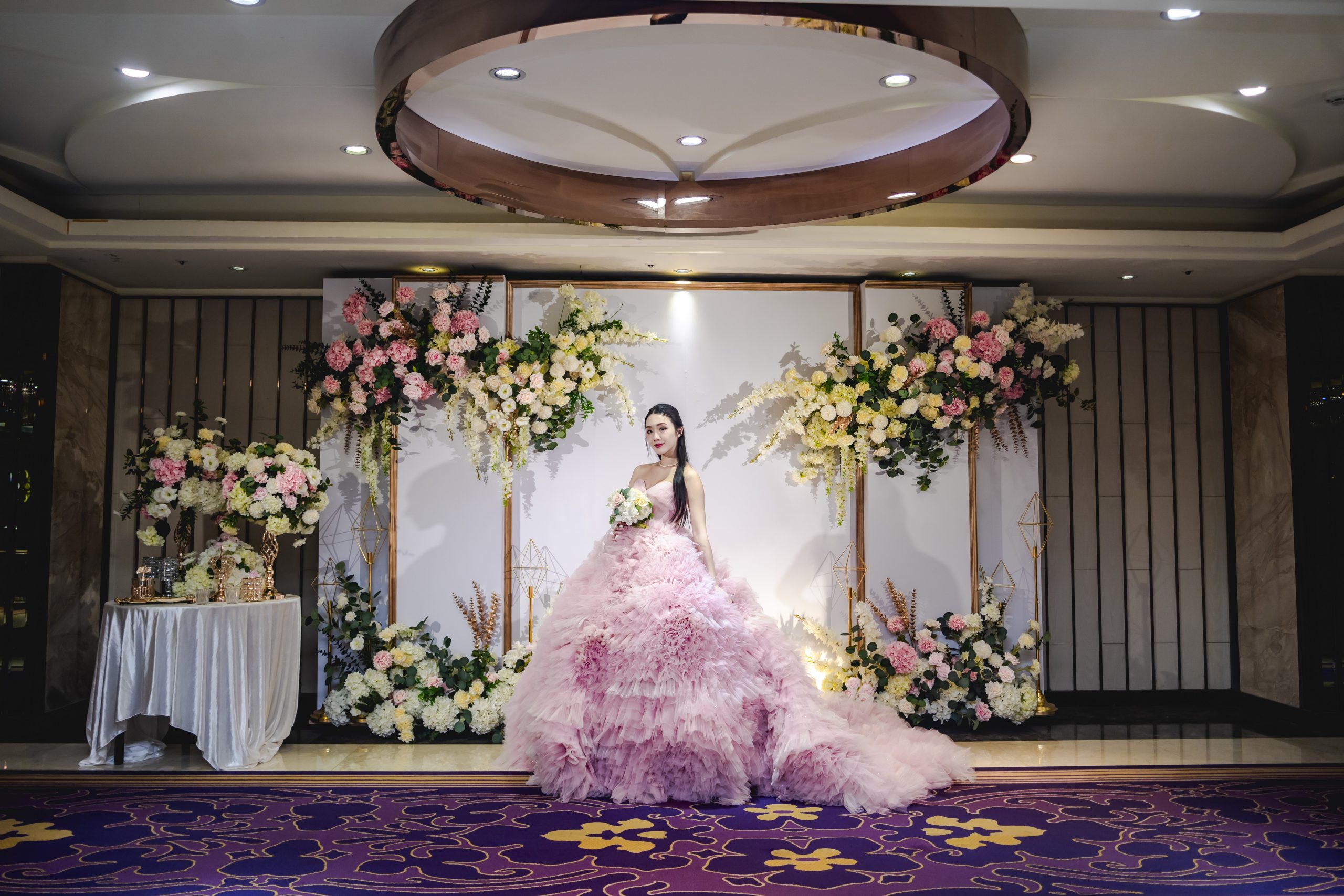 不同的廳堂會搭配不同設計的背景牆,層層相疊的花朵象徵著永恆、純潔的愛情。