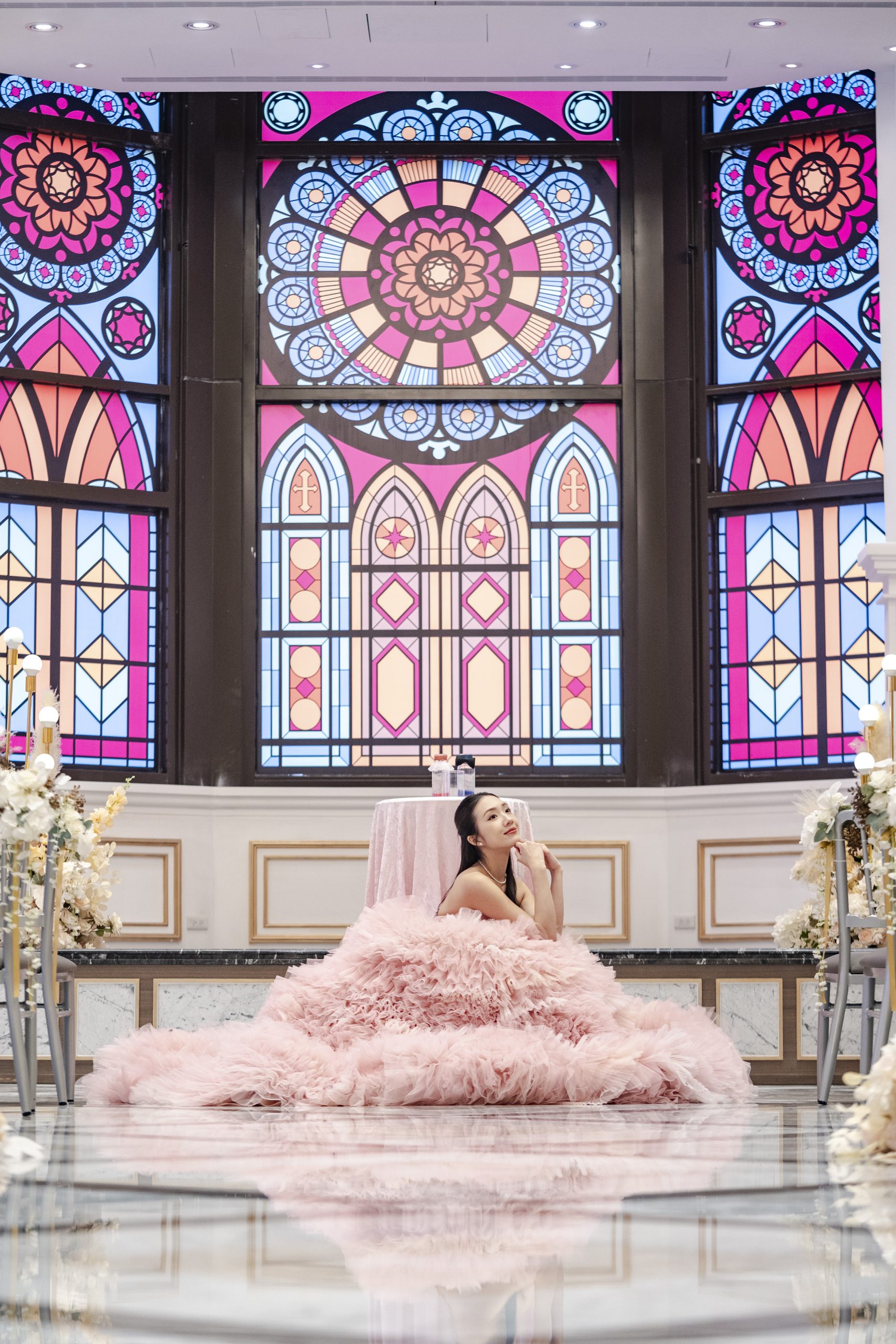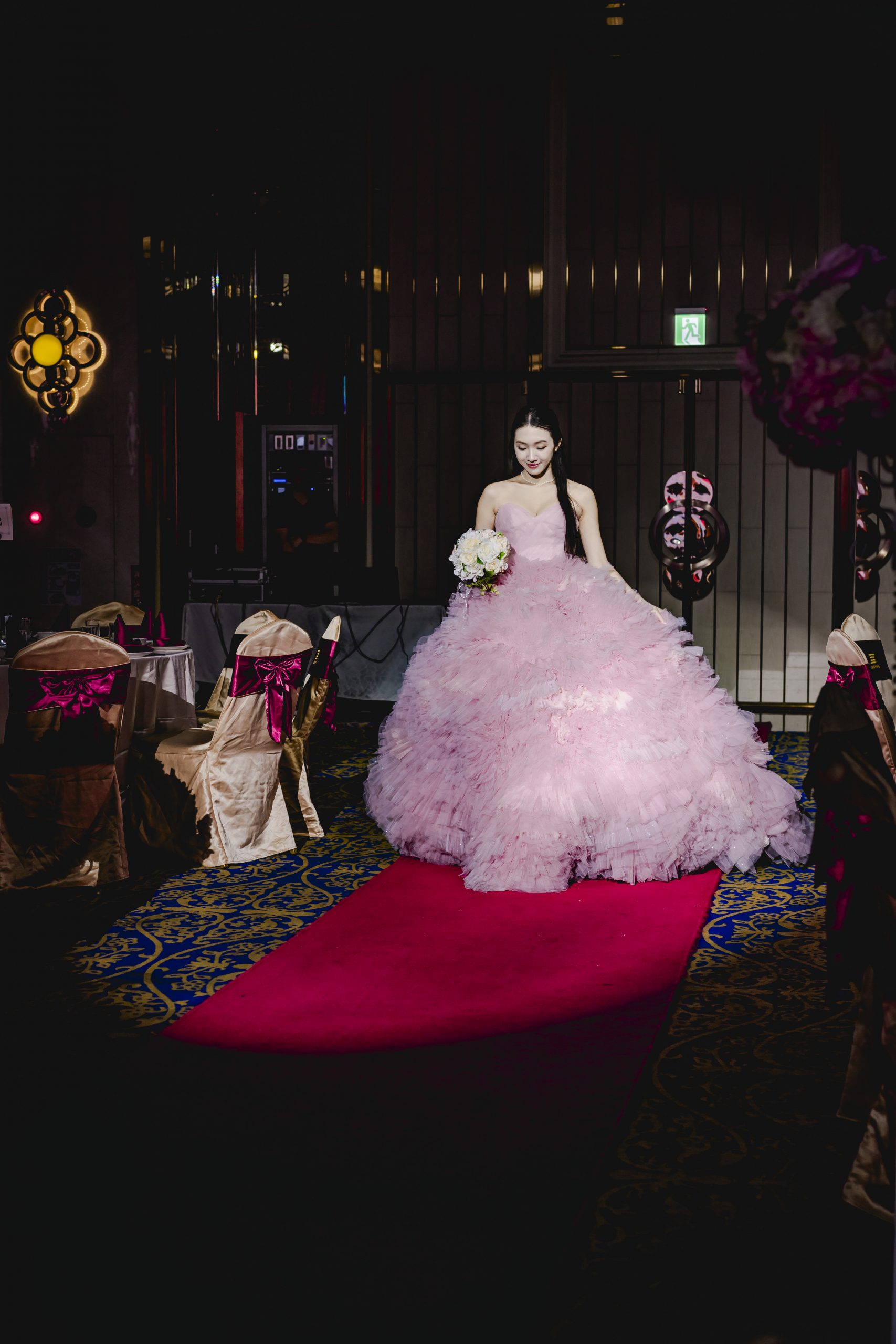 廳內挑高設計與水晶吊燈交相輝映,紅毯筆直延伸至舞台,新娘能在鎂光燈的聚焦下,一步步走向屬於她的王子。