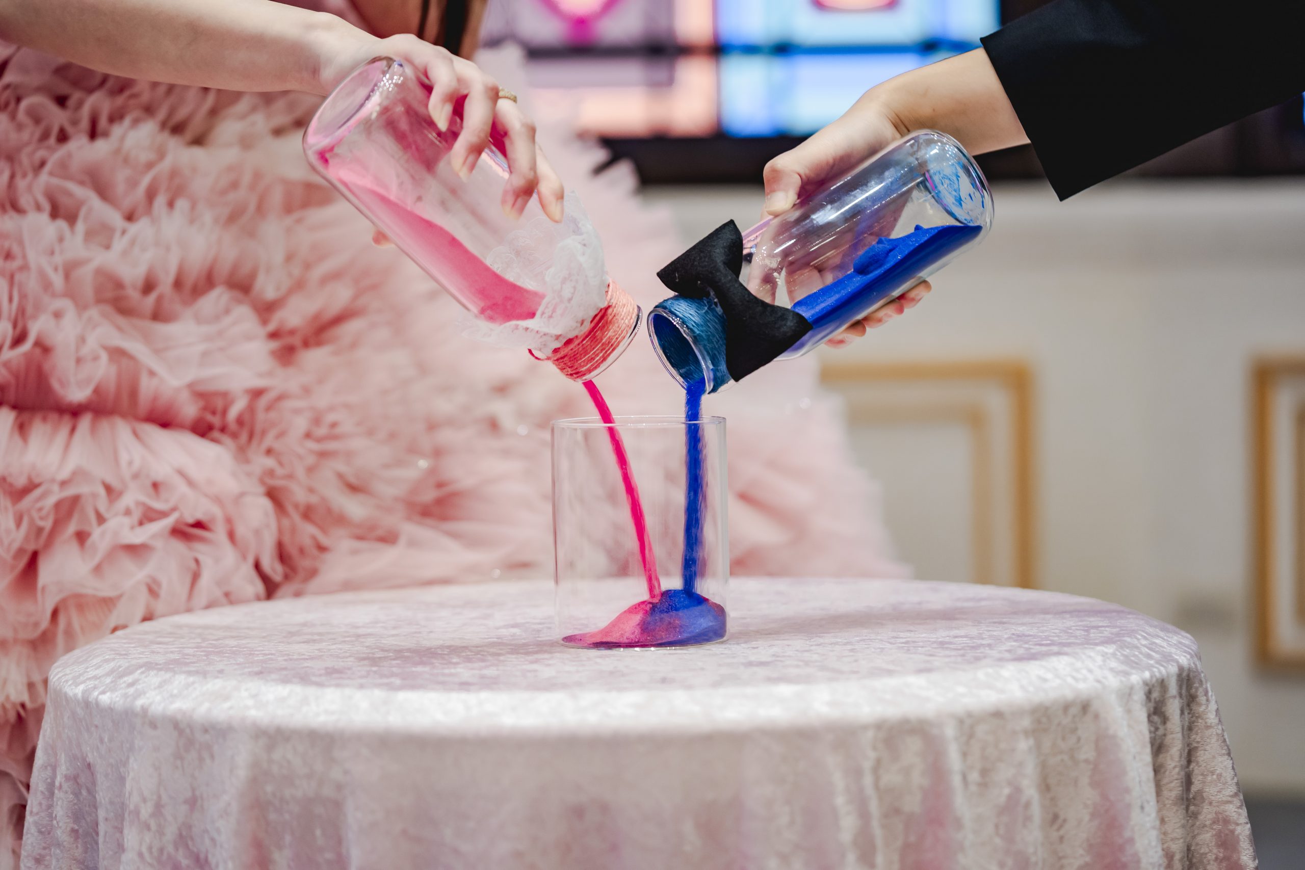 由新人各執一子沙瓶一起將彩沙倒入大瓶中,代表未來不再只有我,而是我們。