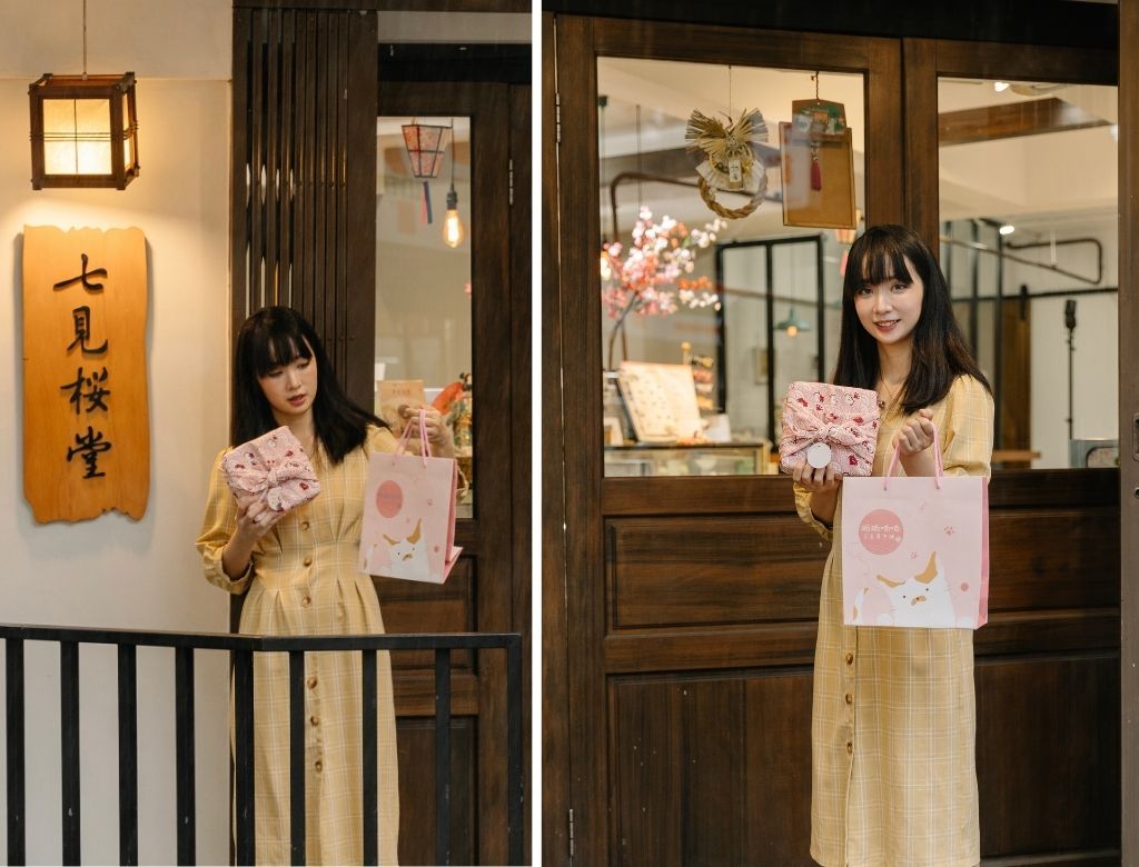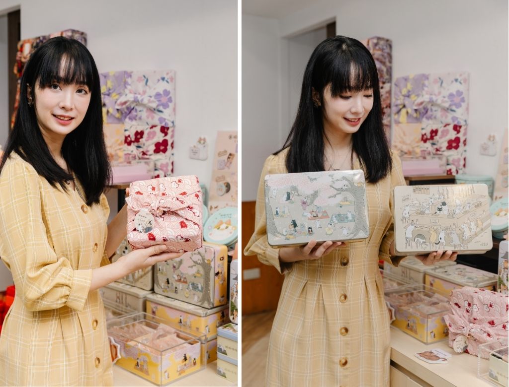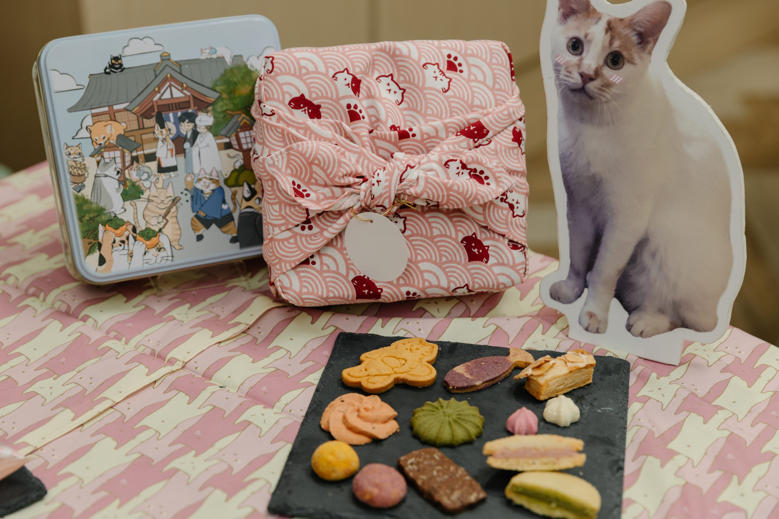 首先,每盒禮盒都會附贈可愛的貓咪提袋,也可以加價更換成貓咪風呂敷包裝。我個人推薦風呂敷版本,因為拍照時真的超級好看,婚禮佈置拿來當背景也超搭。