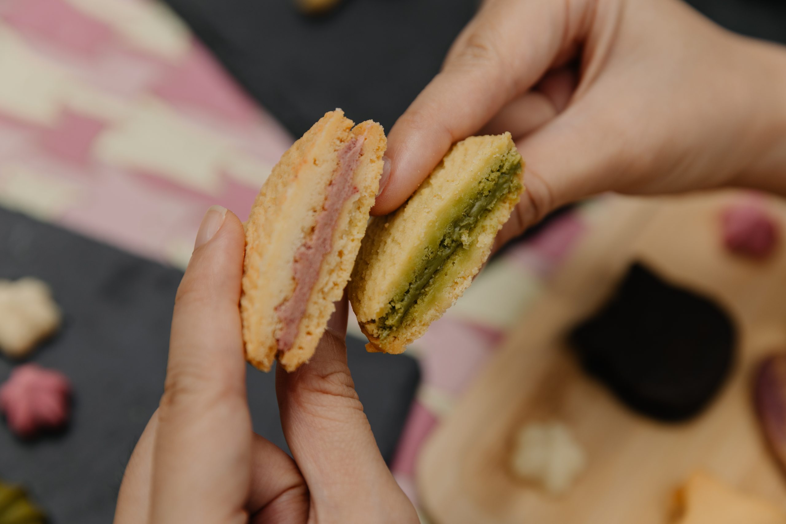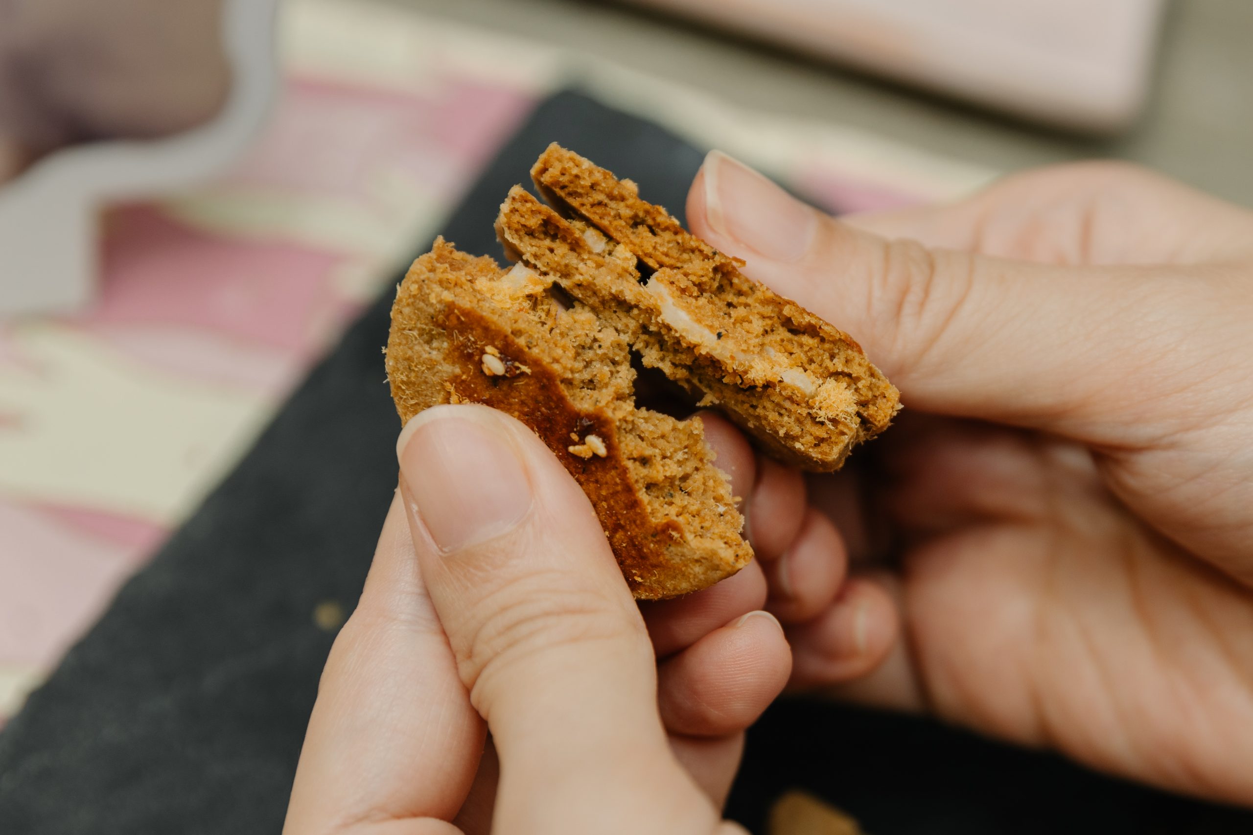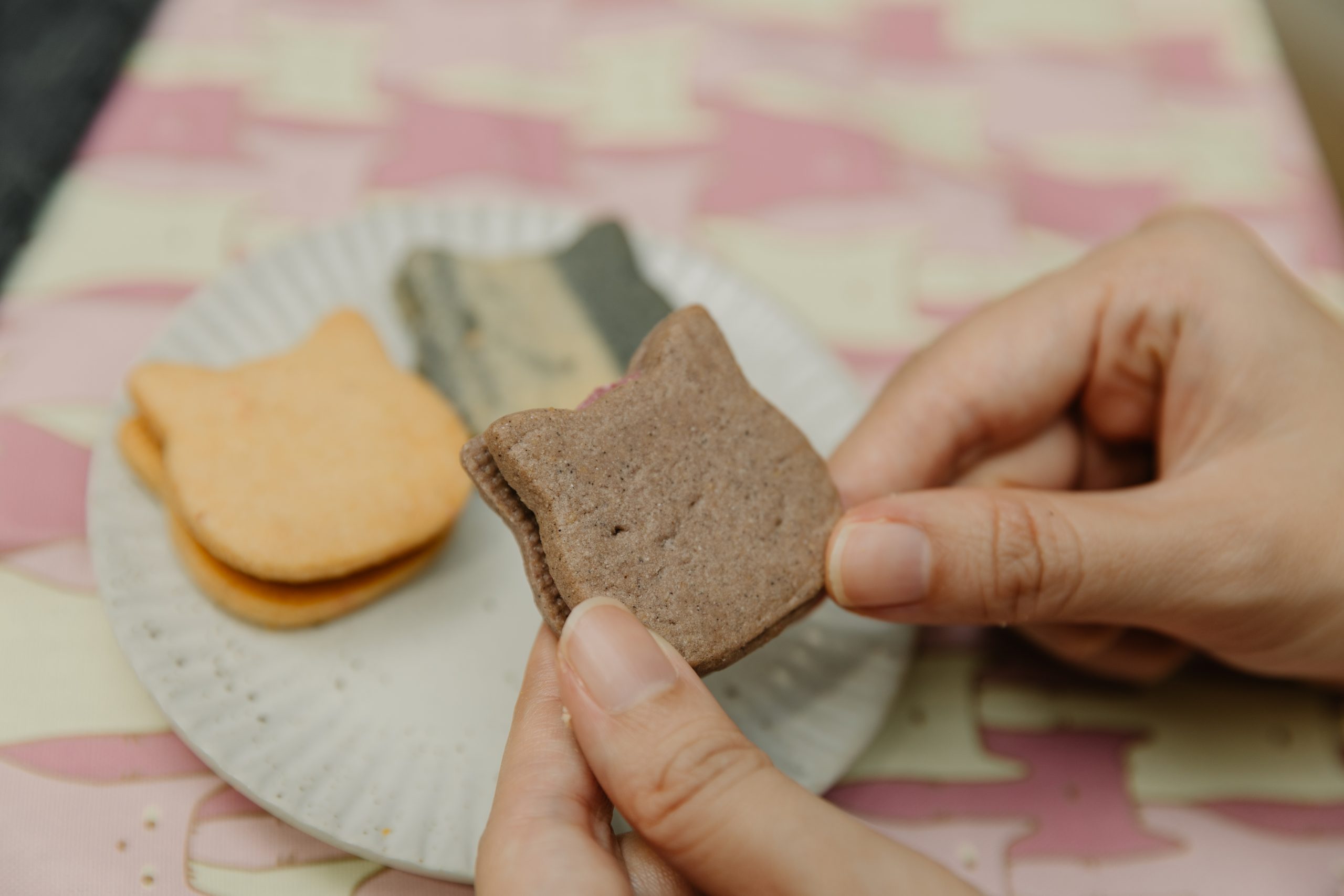坐右邊的貓咪夾心餅為軟萌玳瑁,跟其他貓咪餅乾相比造型更引人注意,這款口味簡直是懷舊的甜蜜暴擊!餅乾酥脆的同時,內餡的花生與芝麻香氣立刻撲鼻而來,像極了小時候吃到的花生醬或芝麻糊。它將這兩種經典堅果的風味細膩地磨合,搭配圓潤的牛奶甜感,這份溫暖的古早味,給人一種軟萌且親切的治癒感。