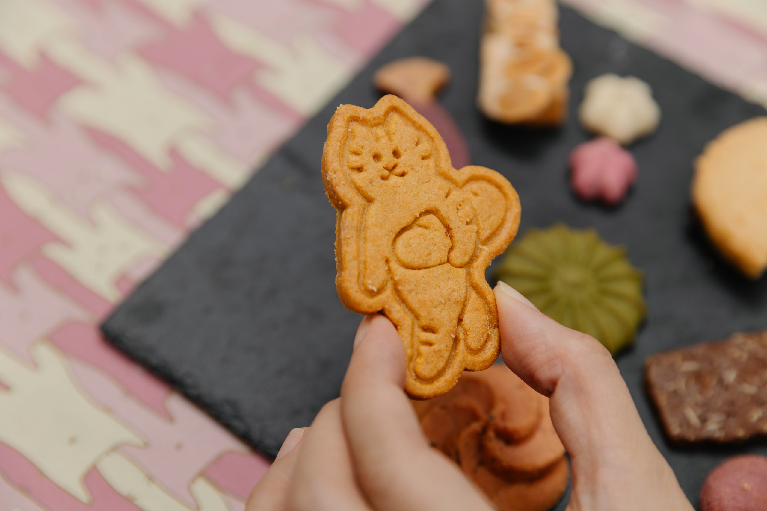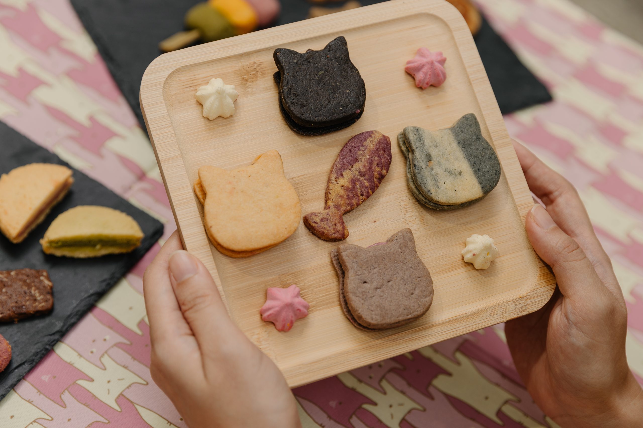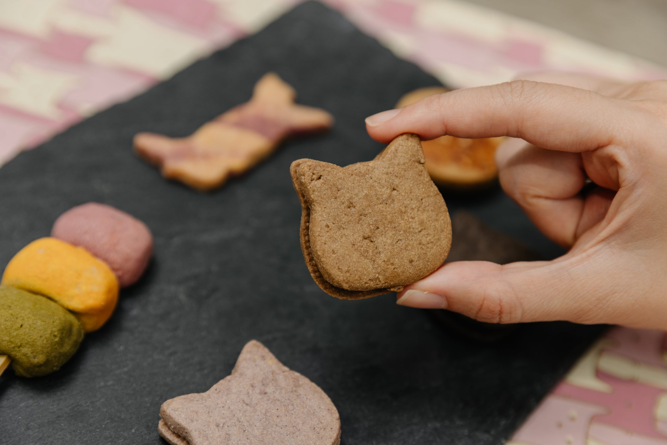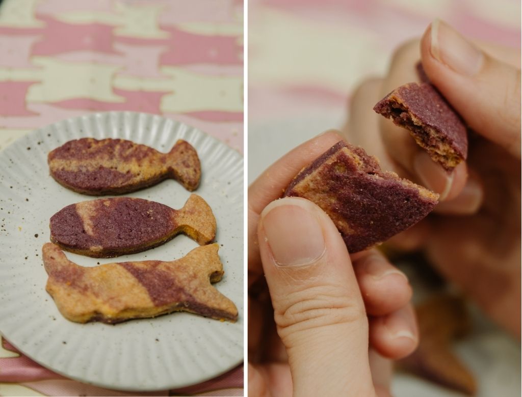 這兩款貓咪餅乾可以人貓共食,使用南瓜、地瓜、紫薯、覆盆子、黑醋栗等天然食材,不含人工添加物與防腐劑。也就是說——連毛小孩都可以安心吃!(不過其他夾心餅乾款式仍是給人類吃的喔😆千萬不要給毛小孩吃)