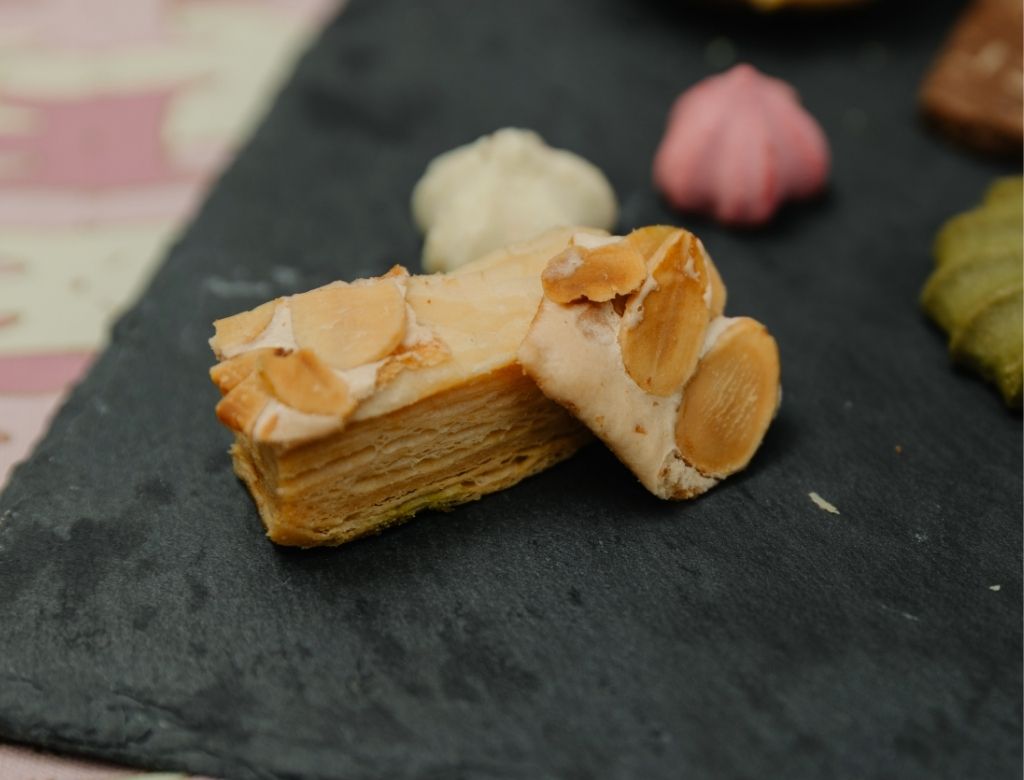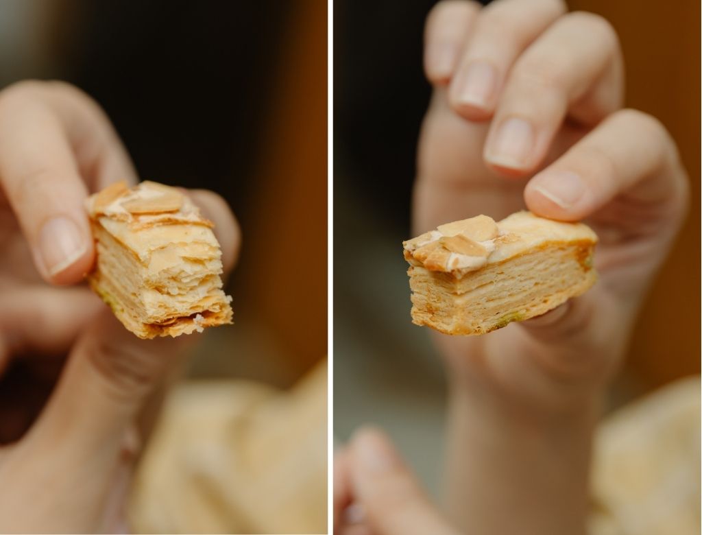 這款帶點奶油香氣,層次分明且乾爽不油膩。表面的杏仁片被焦糖化得恰到好處,帶來喀滋作響的焦脆感。因為非常酥脆,咬下去要小心掉屑屑。