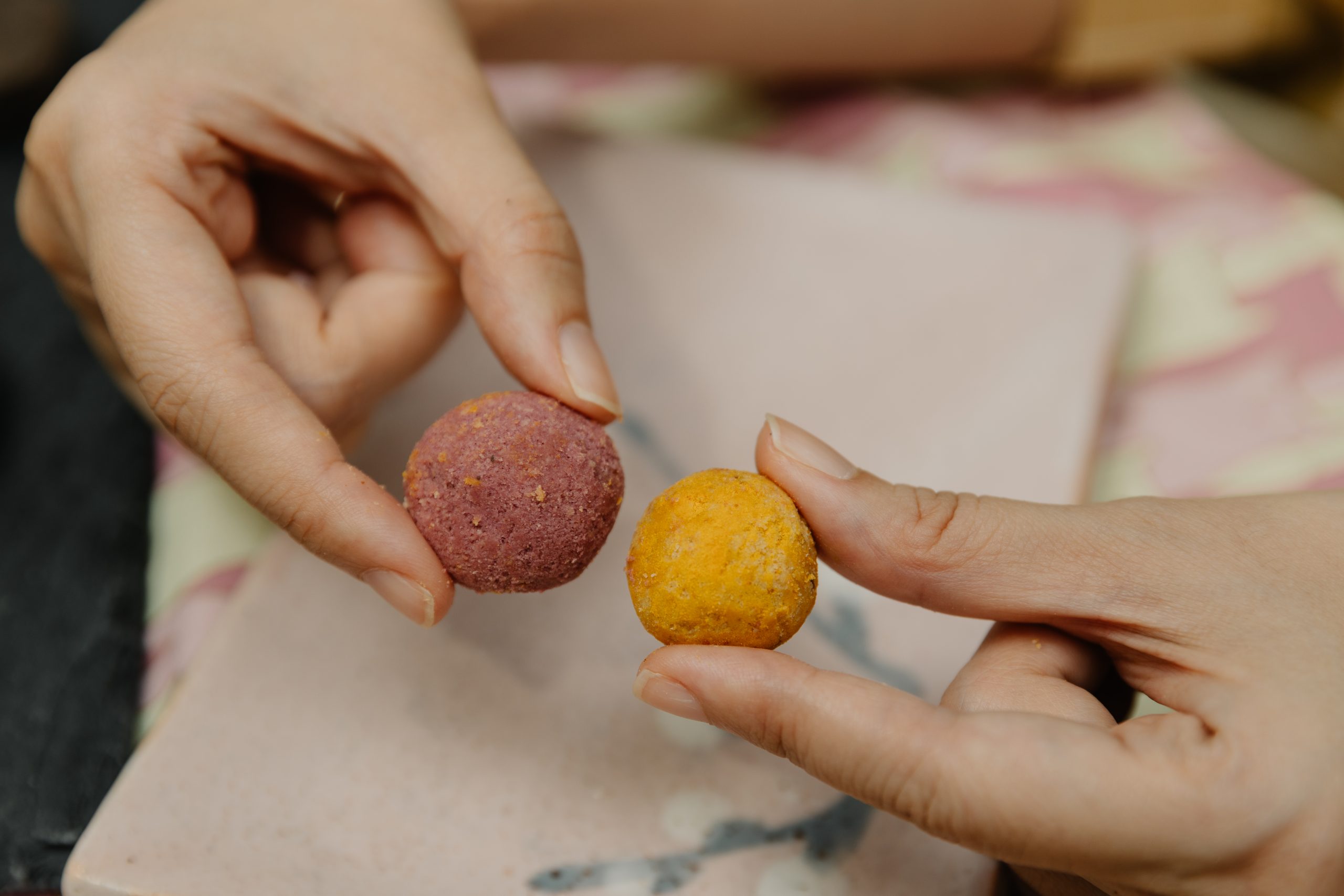 喜餅常常看到雪球系列,但沒看過這麼可愛的雪球,三個顏色做成日式的花見糰子,入口即化的細膩外,更增添了「團圓」的文化寓意。三種風味有莓果、黃豆、抹茶,同時代表季節更迭與對未來的展望,讓這份甜點充滿故事性。