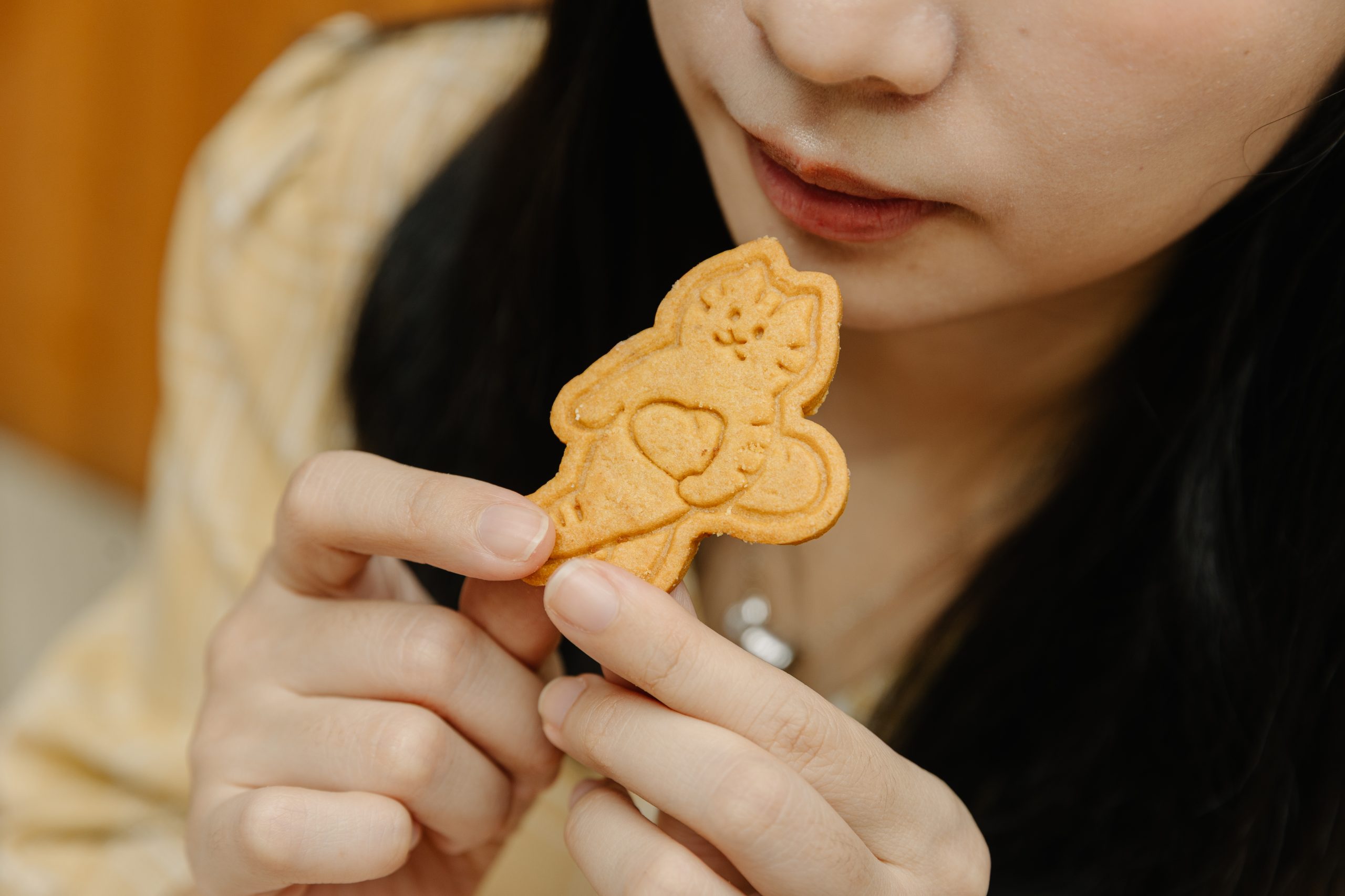 採用橘貓造型,吃起來餅體酥鬆,內餡滑順。焦糖的溫潤甜感作為基底,配上榛果的堅果香氣,甜度高雅不膩,讓我忍不住一口接一口。