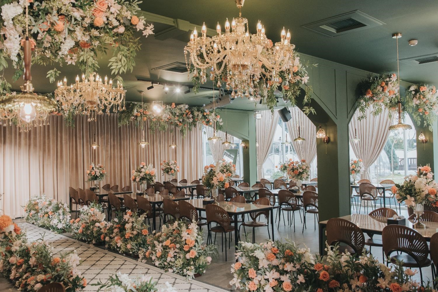 花藝以橙、白、粉為主調,交織出溫暖又幸福洋溢的氛圍,